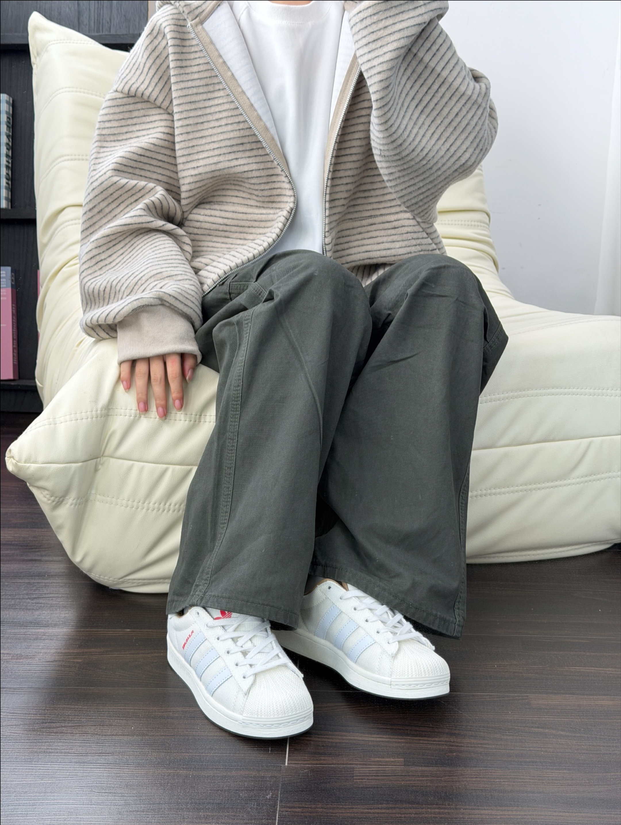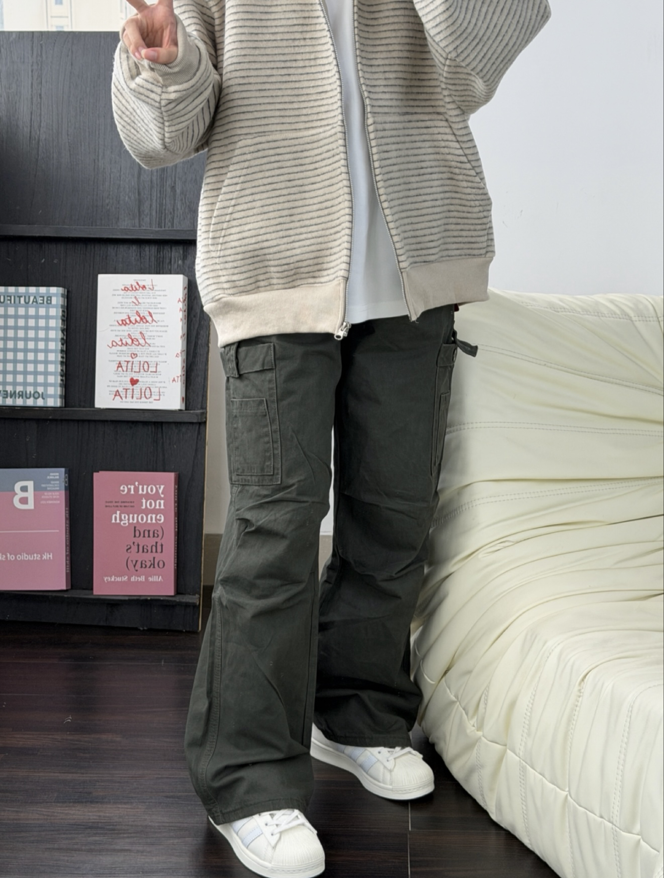 今日份OOTD 今天穿了一件条纹卫衣外套 还搭配了一件工装裤 墨绿色的还蛮好看的 工装裤的设计也挺百搭的,我还挺喜欢的