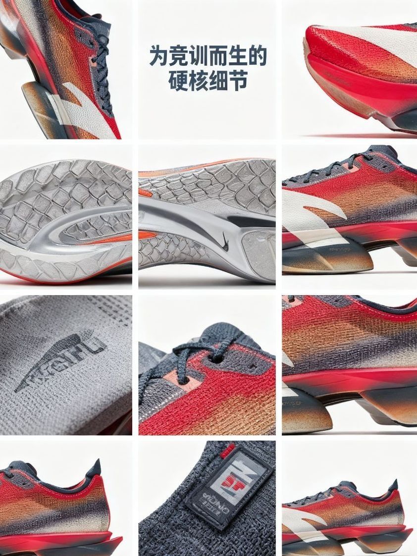 * **「全掌氮科技中底」**:特写镜头直击澎湃脚感!超临界氮气物理发泡,能量回归率远超传统材料,提供持续不断的推进感,长距离训练后程依然绵韧。
