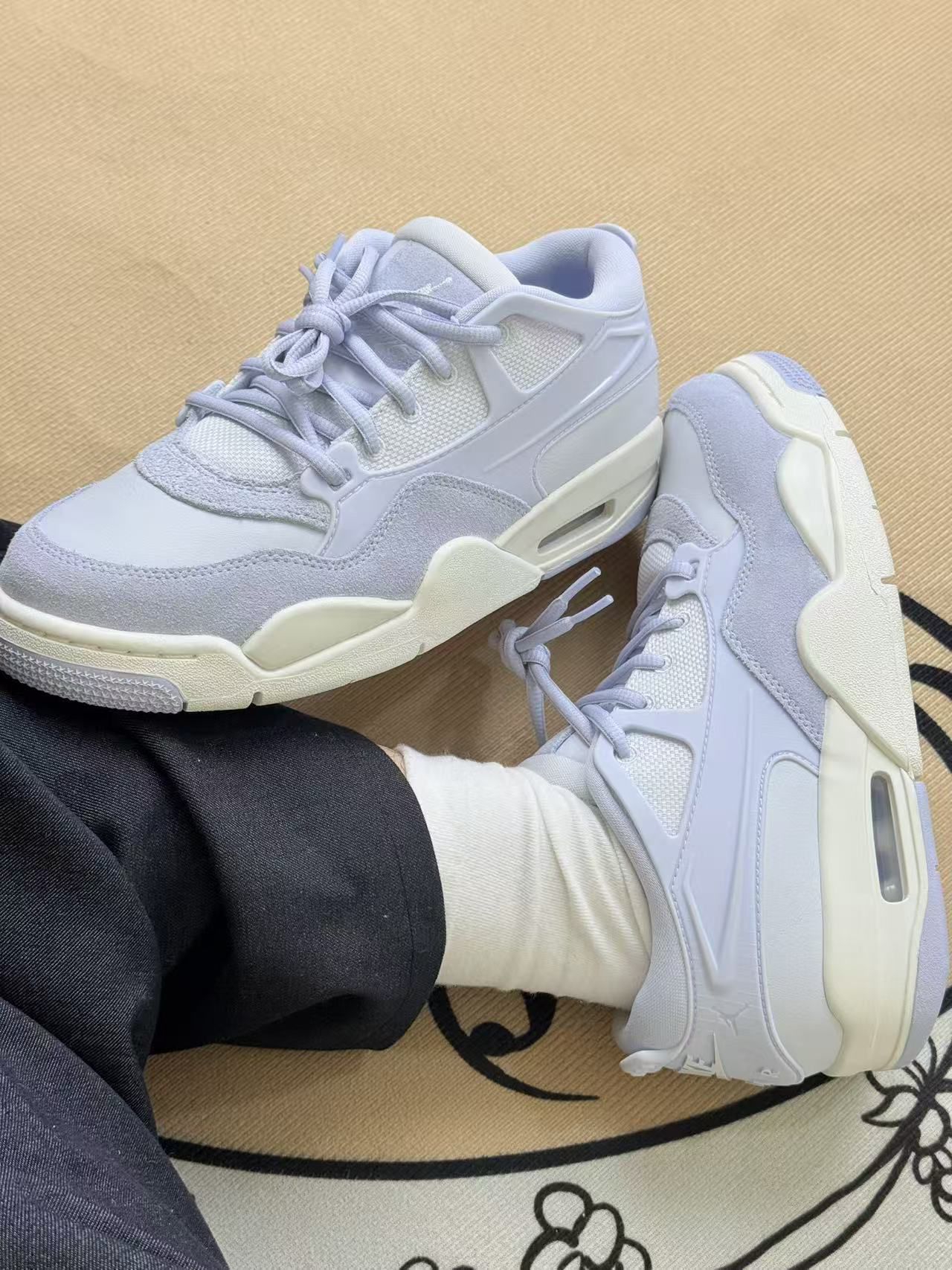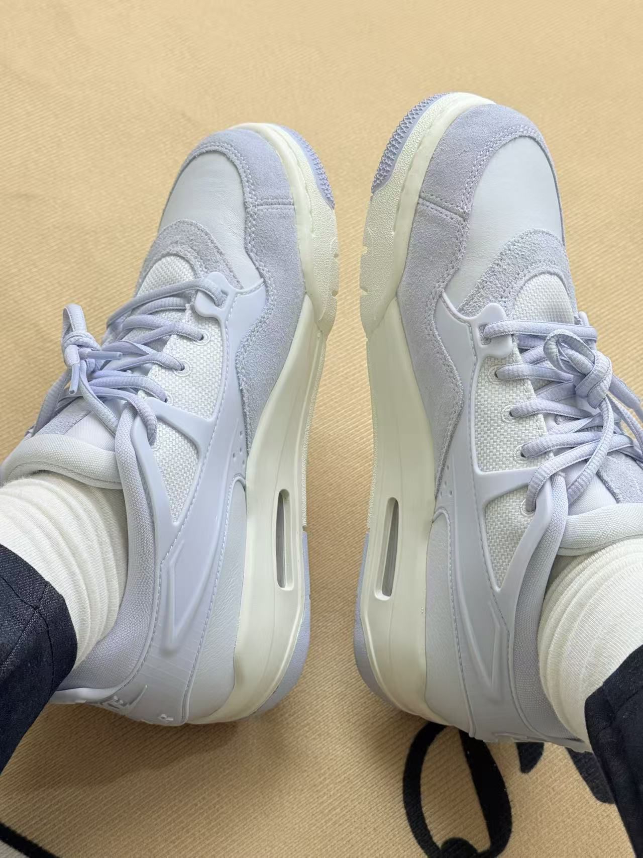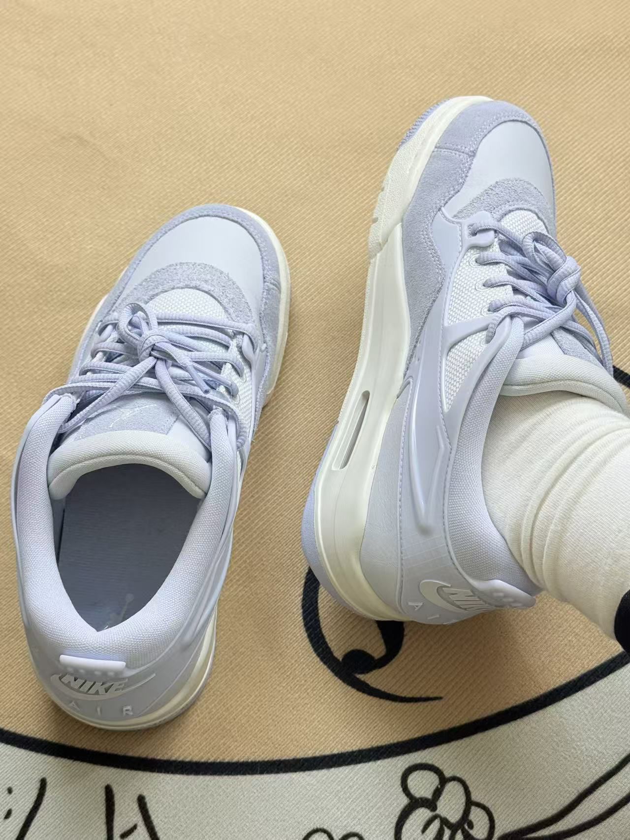 这双淡紫色的鞋拿到手比我预想中更耐看,不是那种廉价的浅紫,是有点雾蒙蒙的柔和色调💜,搭米白袜子或者浅色运动裤都很清爽。 上脚第一感觉是鞋底的气垫很明显,踩下去软乎乎的,走久了脚踝也没什么累的感觉。鞋面是网布加绒面的拼接,透气还不错,最近二十多度的天气穿也没闷脚。鞋型是有点复古的厚底,不会显得笨重,反而悄悄拉了点腿长,这点还挺讨喜。 不过缺点也很实在:绒面的部分特别容易沾灰,刚穿出门半天鞋头...