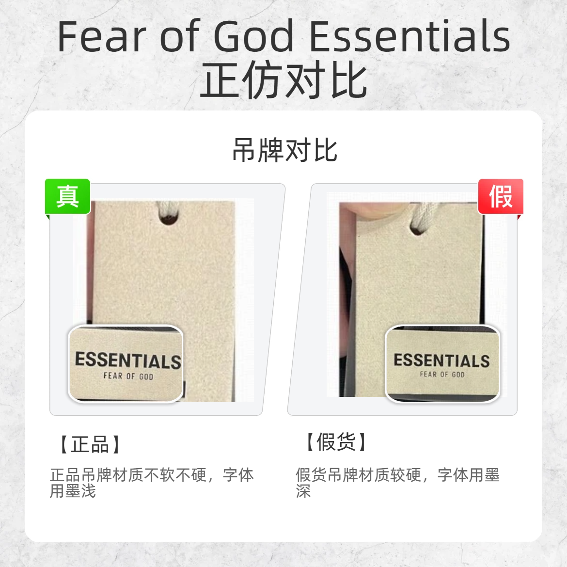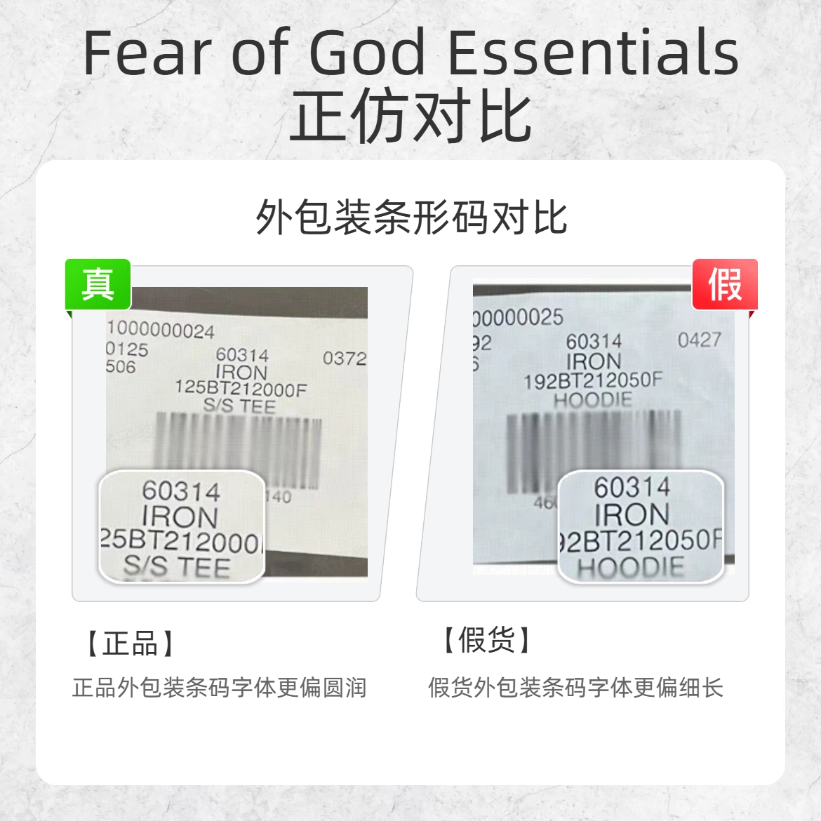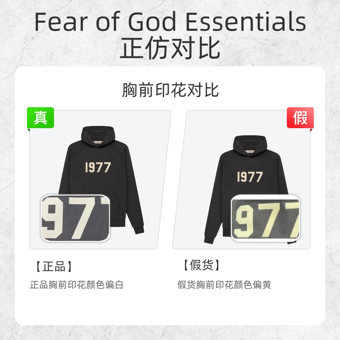 别再花大价钱买假货啦!作为潮流爱好者,今天就把ESSENTIALS 1977 卫衣的真假鉴别技巧全分享给你们,从细节处教你一眼辨真假~ 🔍 胸前印花对比 - 正品:印花颜色偏柔和米白 - 假货:印花颜色过黄 🔍 吊牌对比 - 正品:吊牌材质不软不硬,字体用墨浅 - 假货:吊牌材质过硬,字体用墨深 🔍 外包装条码对比 - 正品:条码字体偏圆润 - 假货:条码字体更偏细长 这些鉴别点你们都记住...