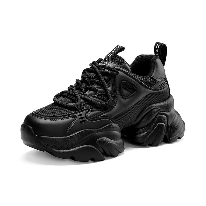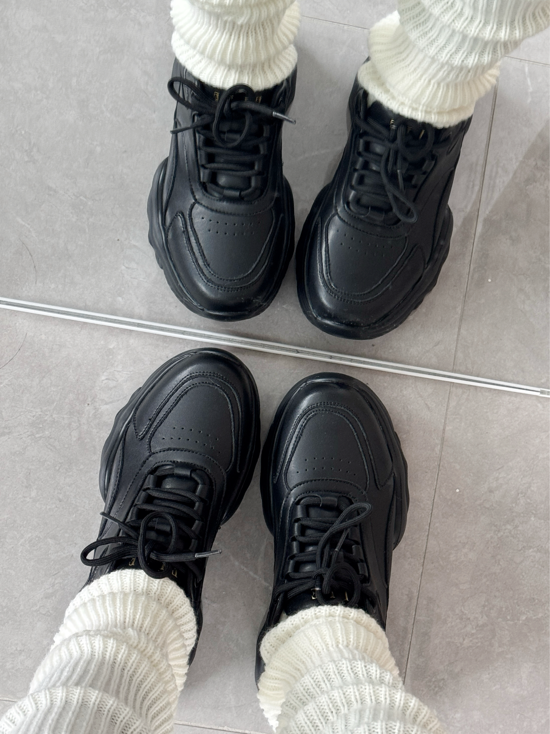 一年四季都爱穿的老爹鞋 黑色尊滴高级又百搭! 厚底增高设计好显腿长腿瘦呀 上jio 也很舒服 走一天也不累✌️ 搭配排骨羽绒服一套韩系又好看🥰
