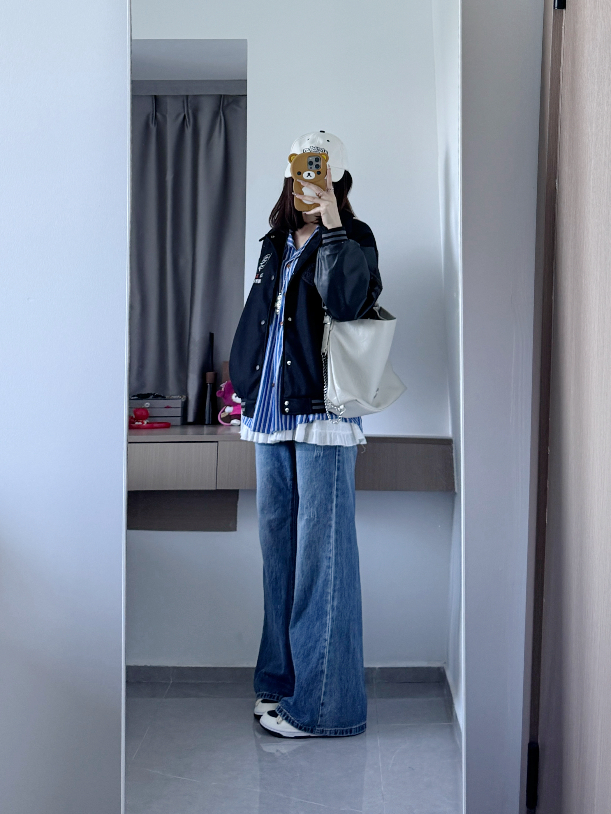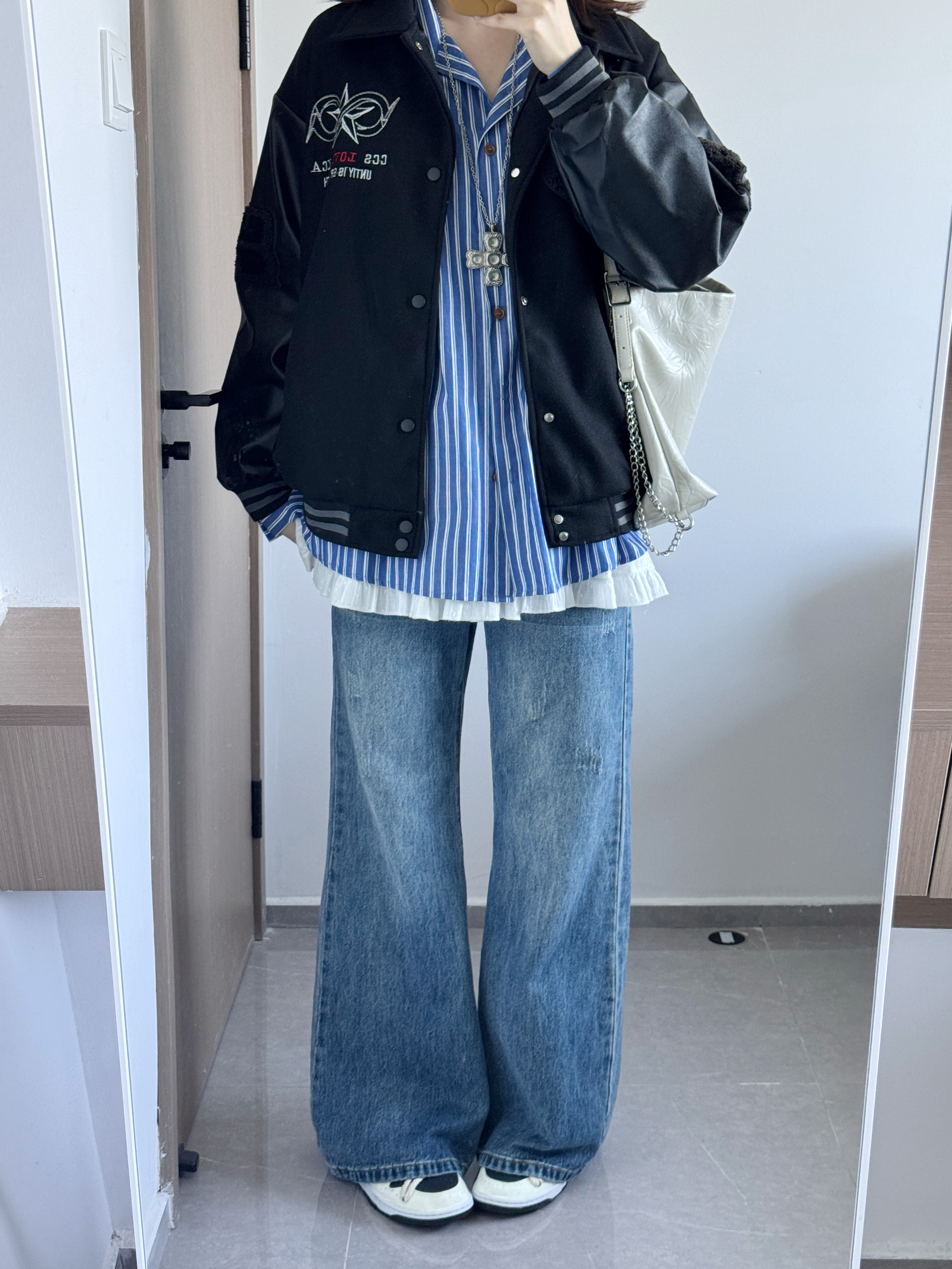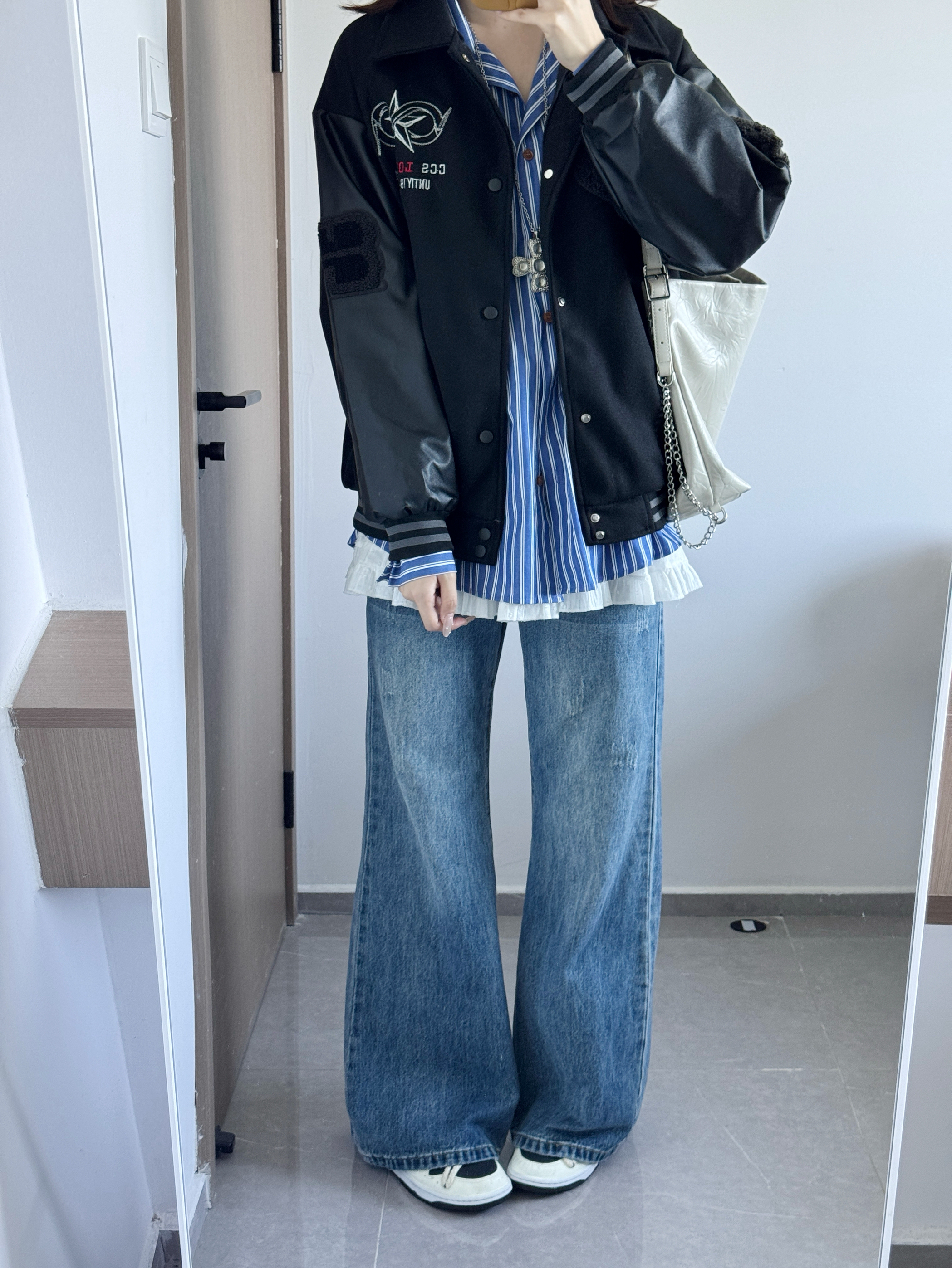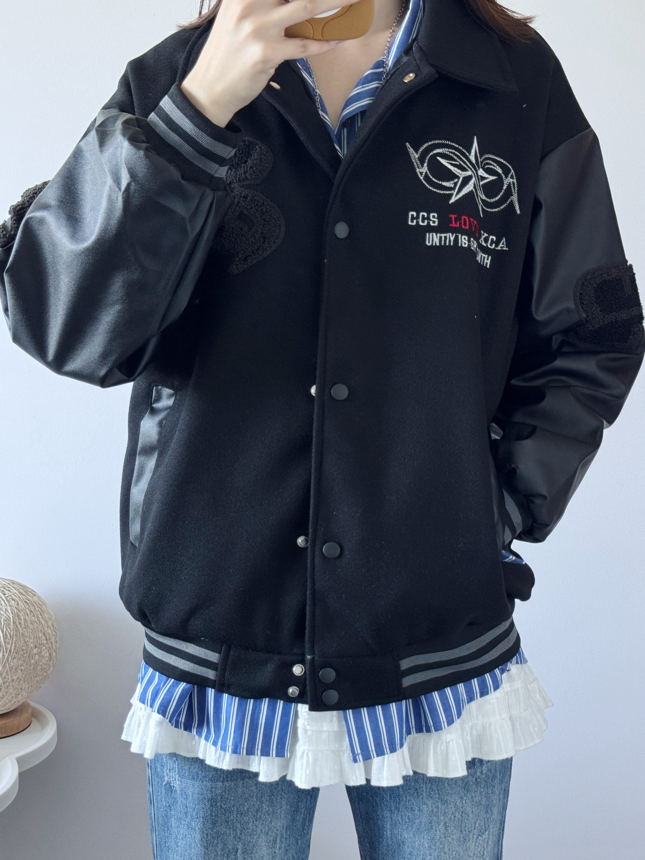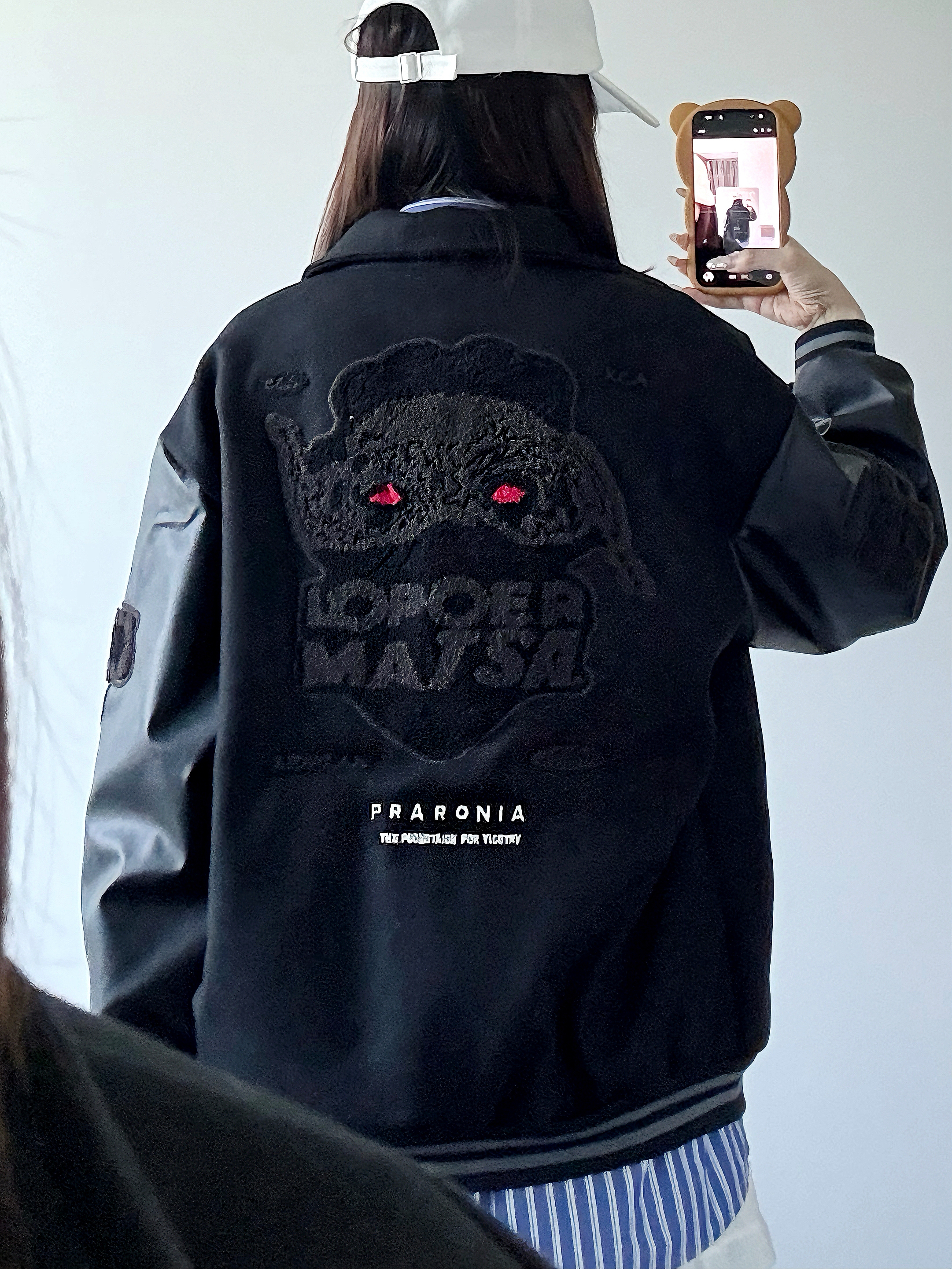 秋冬真的拒绝不了棒球服呀 重工刺绣好有质感 黑色又酷又百搭的!男女都能穿哦✌️ 后背蒙面将军回头率好高!💯 叠穿衬衫牛仔裤一套松弛又帅气😎