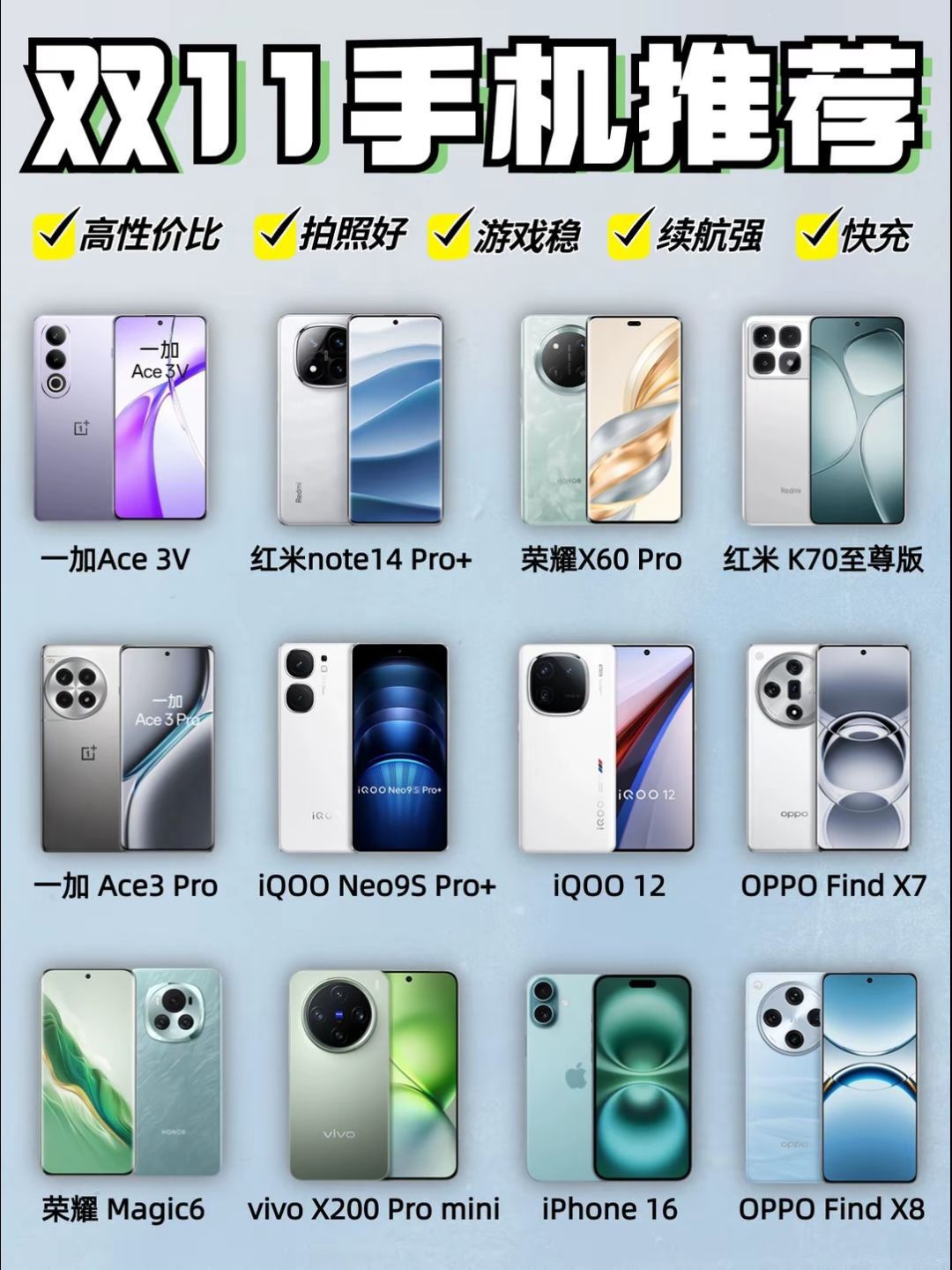 #一张图证明我想换手机了 11月高性价比手机合集!拍照/游戏/日常党速码📱 宝子们!新机+高性价比机型整理好啦!按需求直接冲👇 📸 拍照党必看 预算够直接冲旗舰: • 小米17PM/华为pura80Pro:主摄+长焦双强,成片质感拉满 • vivo X300P:蔡司镜头+自研影像芯片,人像绝了 (iPhone 17PM太贵,非苹果党可以pass) 🎮 游戏党闭眼入 性能+散热双在线: • iQOO...