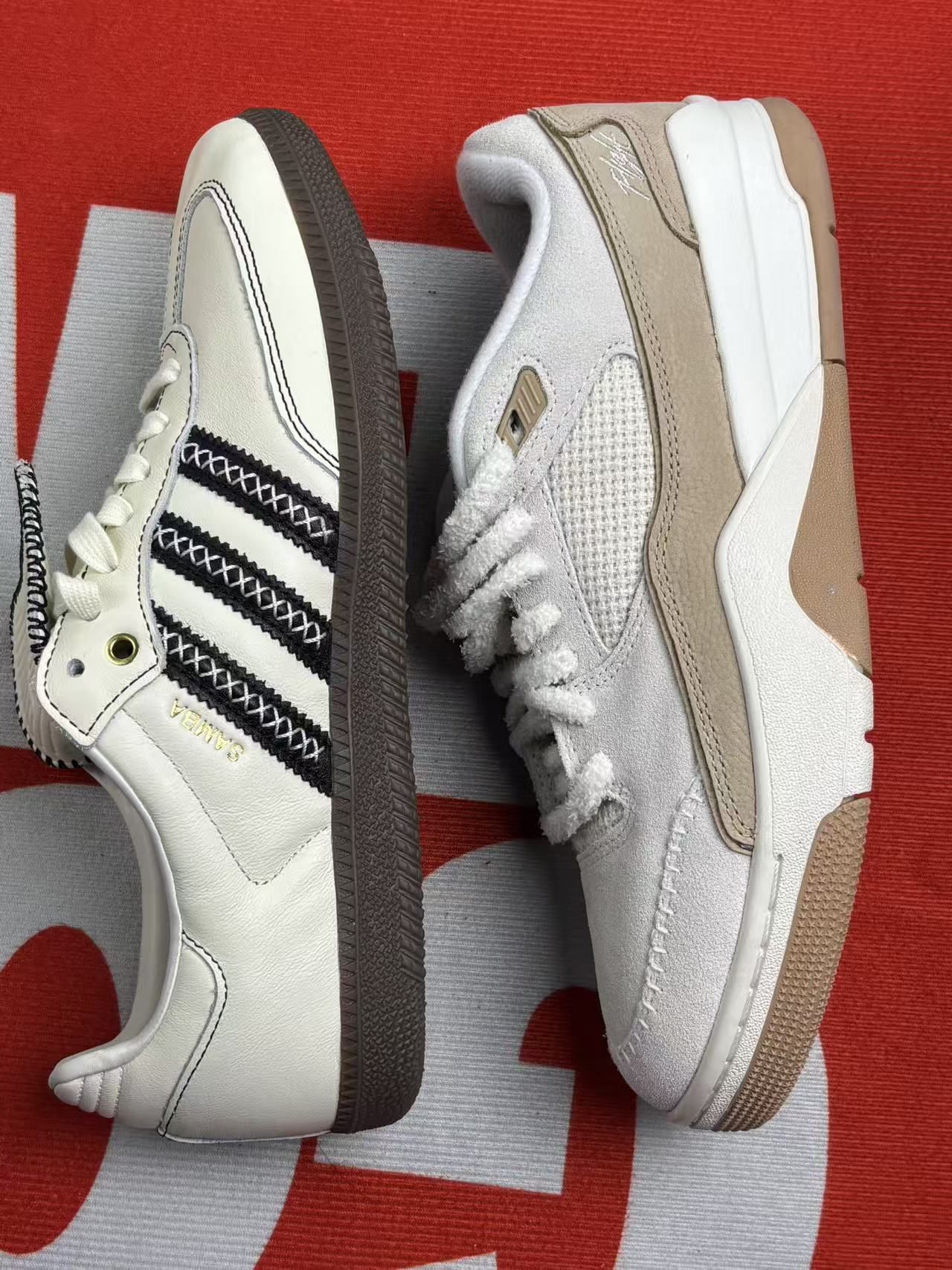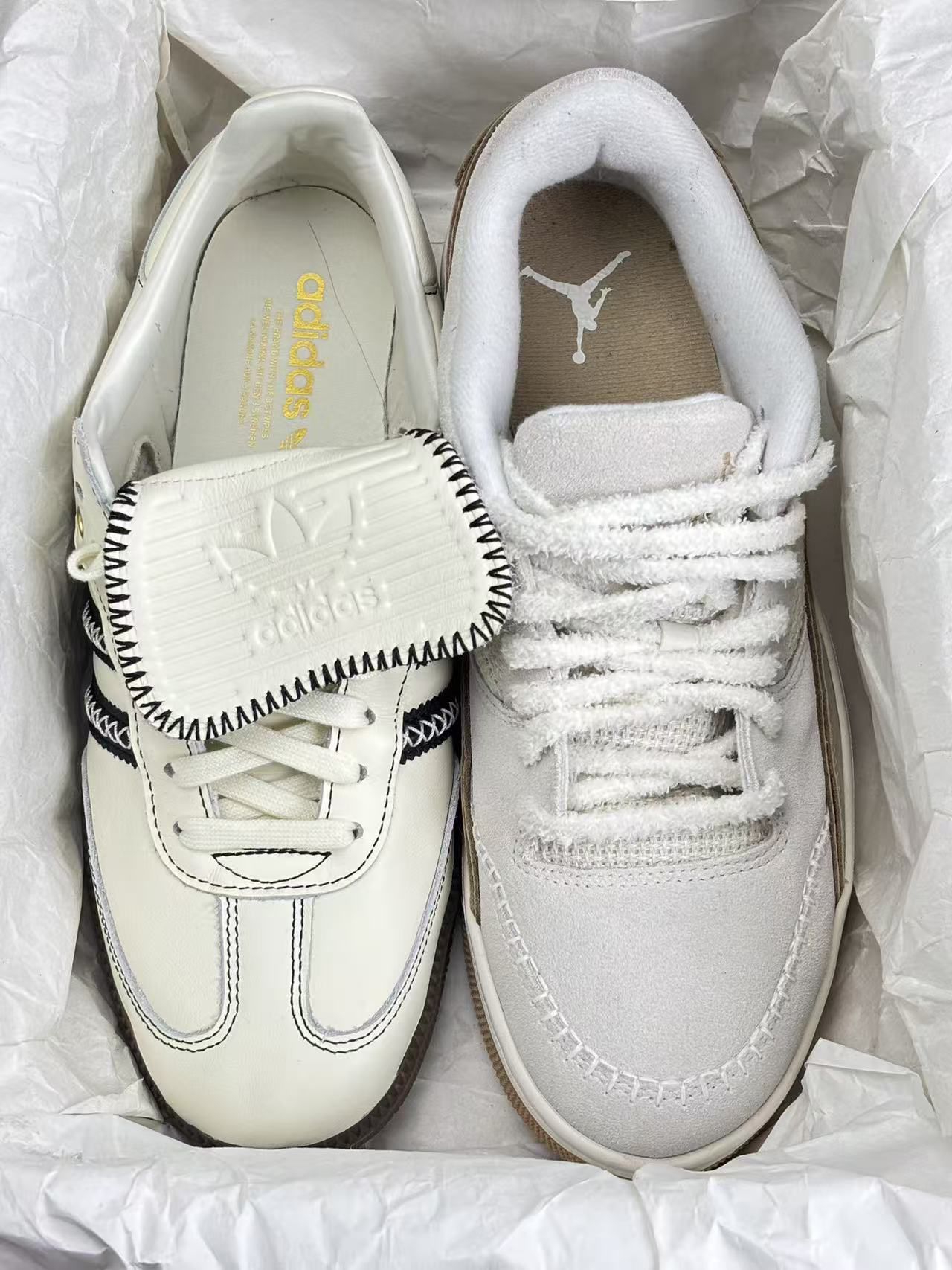 最近总把这两双鞋塞书包里换着穿,算是冬天出门的“懒人装备”~ 先说阿迪Samba LT:皮质面是真省心,早上赶课沾了豆浆渍,拿纸巾擦两下就没痕迹,但鞋帮的魔术贴边缘有点硌, 鞋底偏薄,走石板路能感觉到石子的硌感,但搭校服裤刚好露出鞋边,不用特意配衣服。 再讲Jordan这双:麂皮裹脚是软和,可网眼布太容易卡灰,昨天背去球场,坐了会儿鞋头就沾了层细土,拿湿巾擦半天还留印子。鞋舌有点厚,系紧鞋带总压脚...