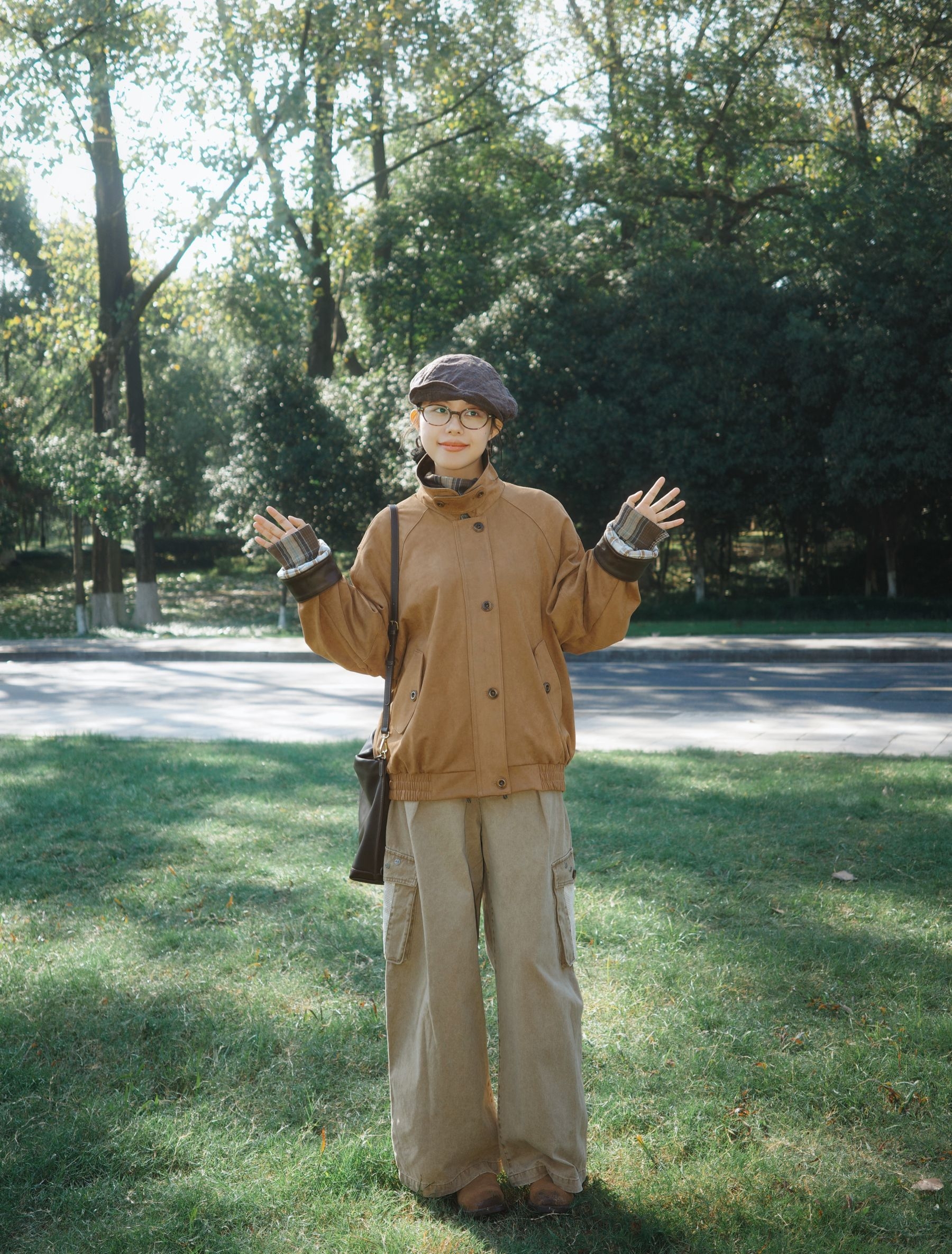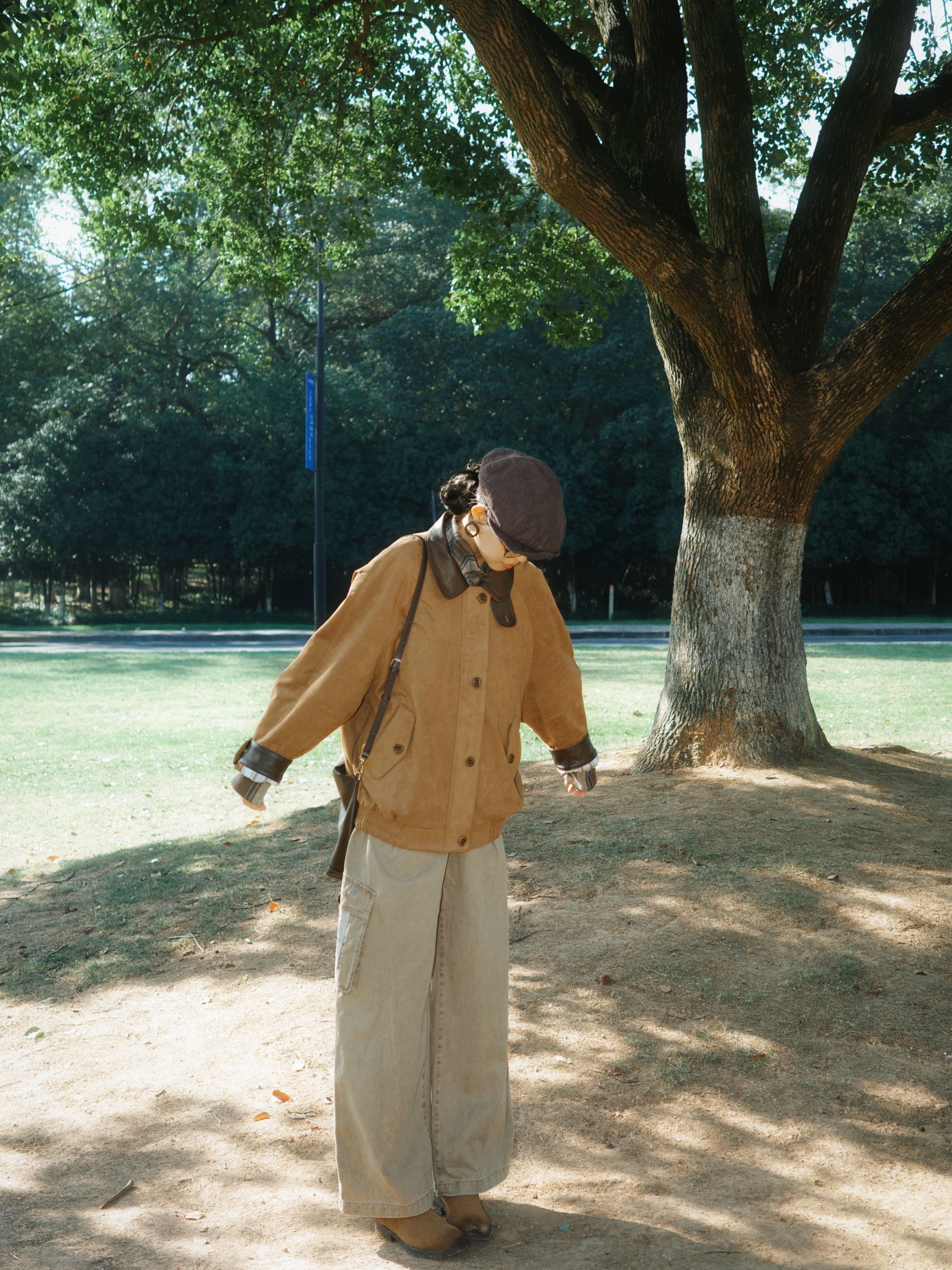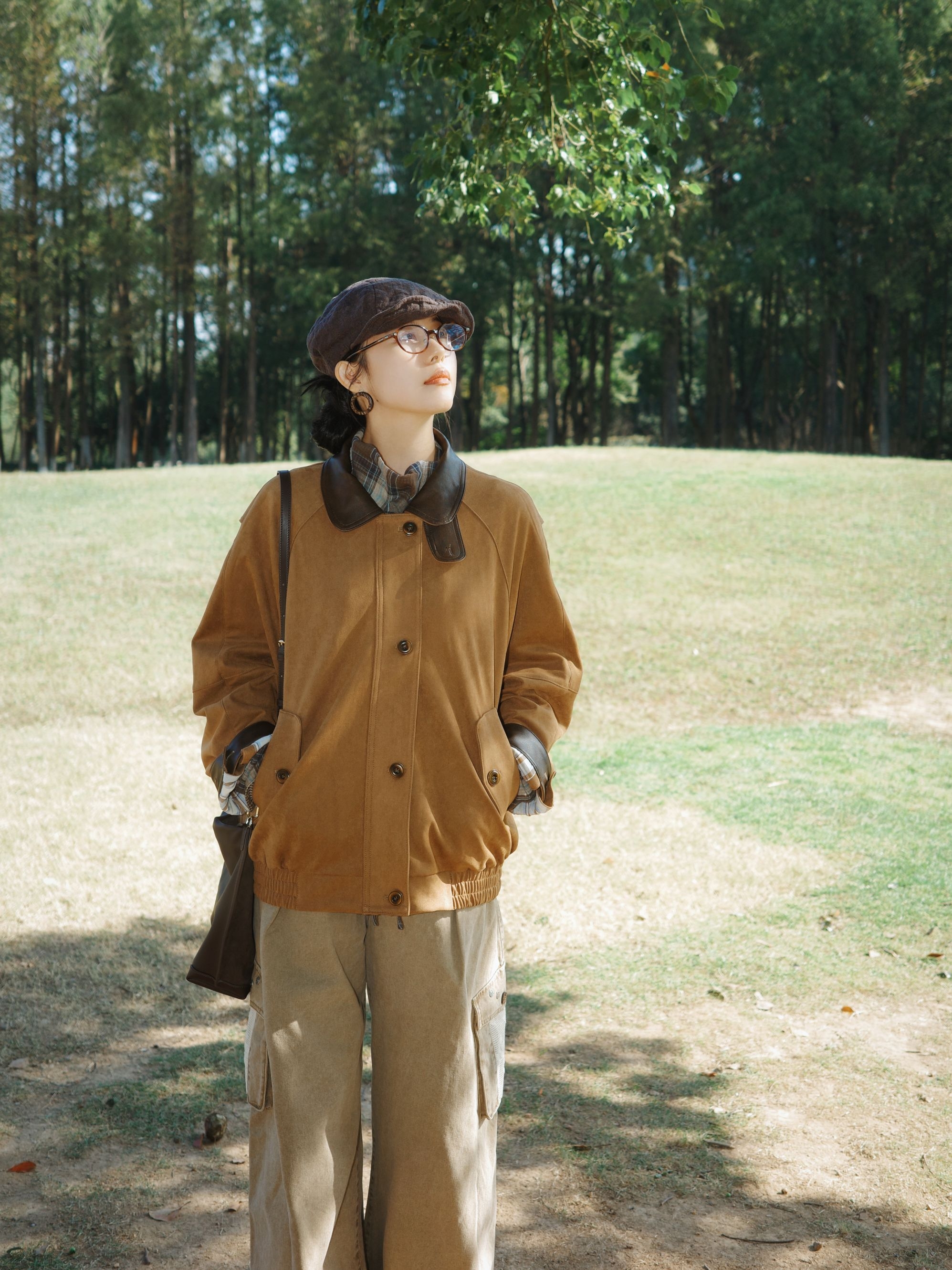 棕色灯芯绒外套质感软糯,领口拼接深棕皮料,扣上扣子自带复古工装的腔调,内搭灰棕格纹衬衫,领口随意散开的格纹像给秋天加了层复古滤镜,透气又有层次~ 浅卡其工装裤大口袋设计带点随性劲儿,裤脚垂坠感刚好遮住鞋面,配上棕色短靴,报童帽一戴,瞬间把氛围感拉回旧时光,肩上挎着同色系包包,整体大地色搭配在阳光下特别柔和,不张扬却处处有呼应。 外套的绒面泛着暖光,这种复古又自在的调调,真的很适合秋日晒太阳~
