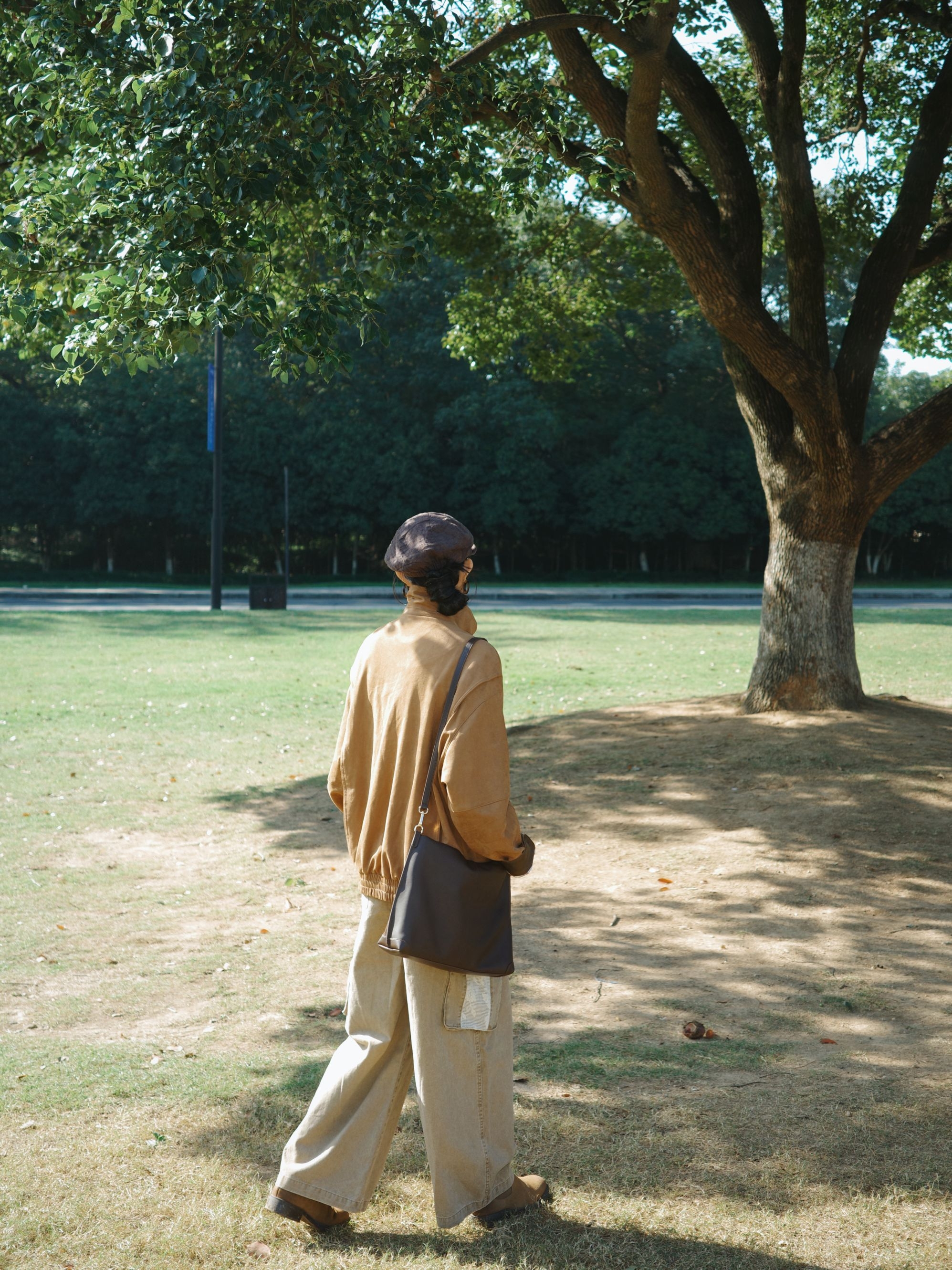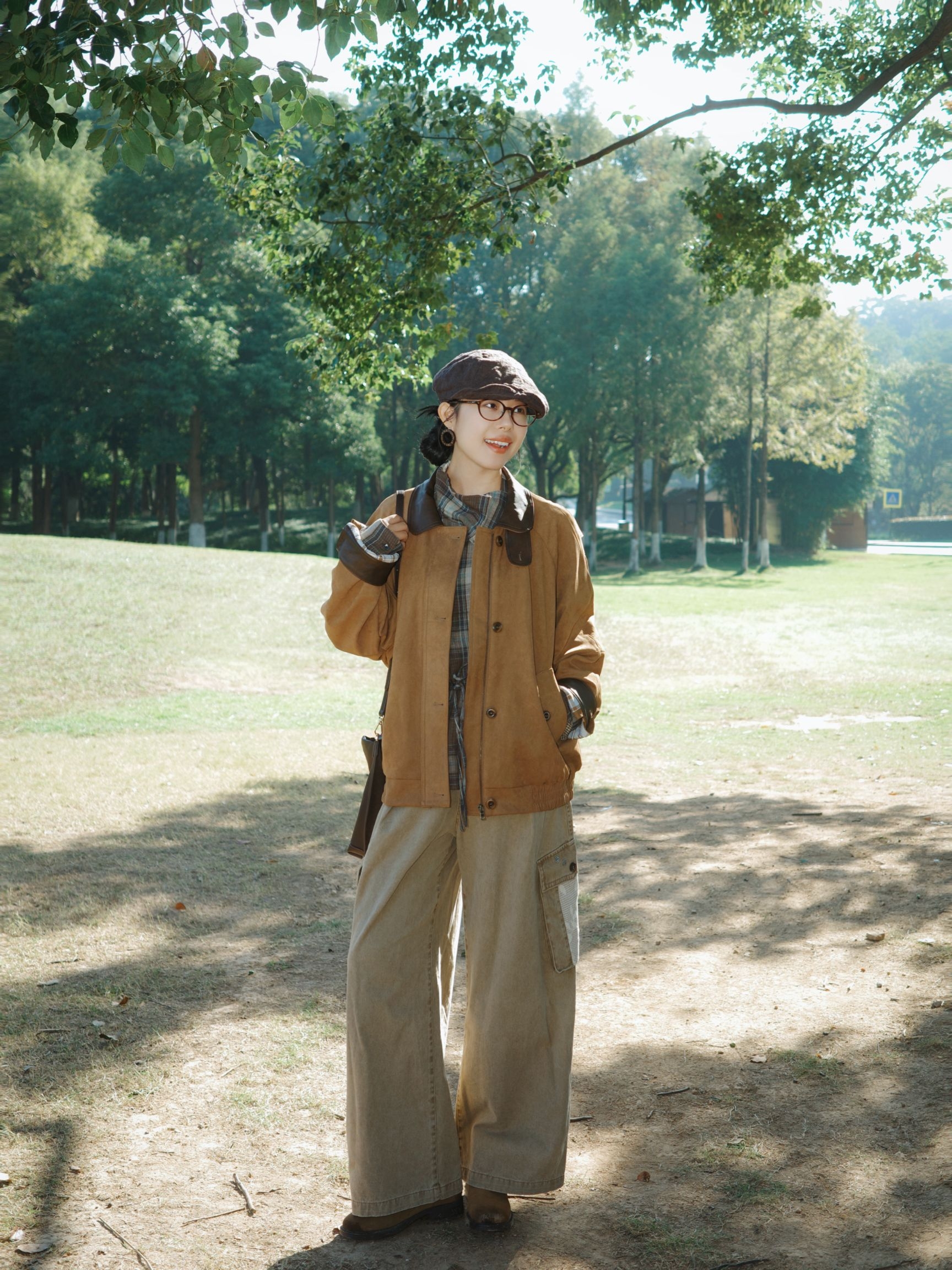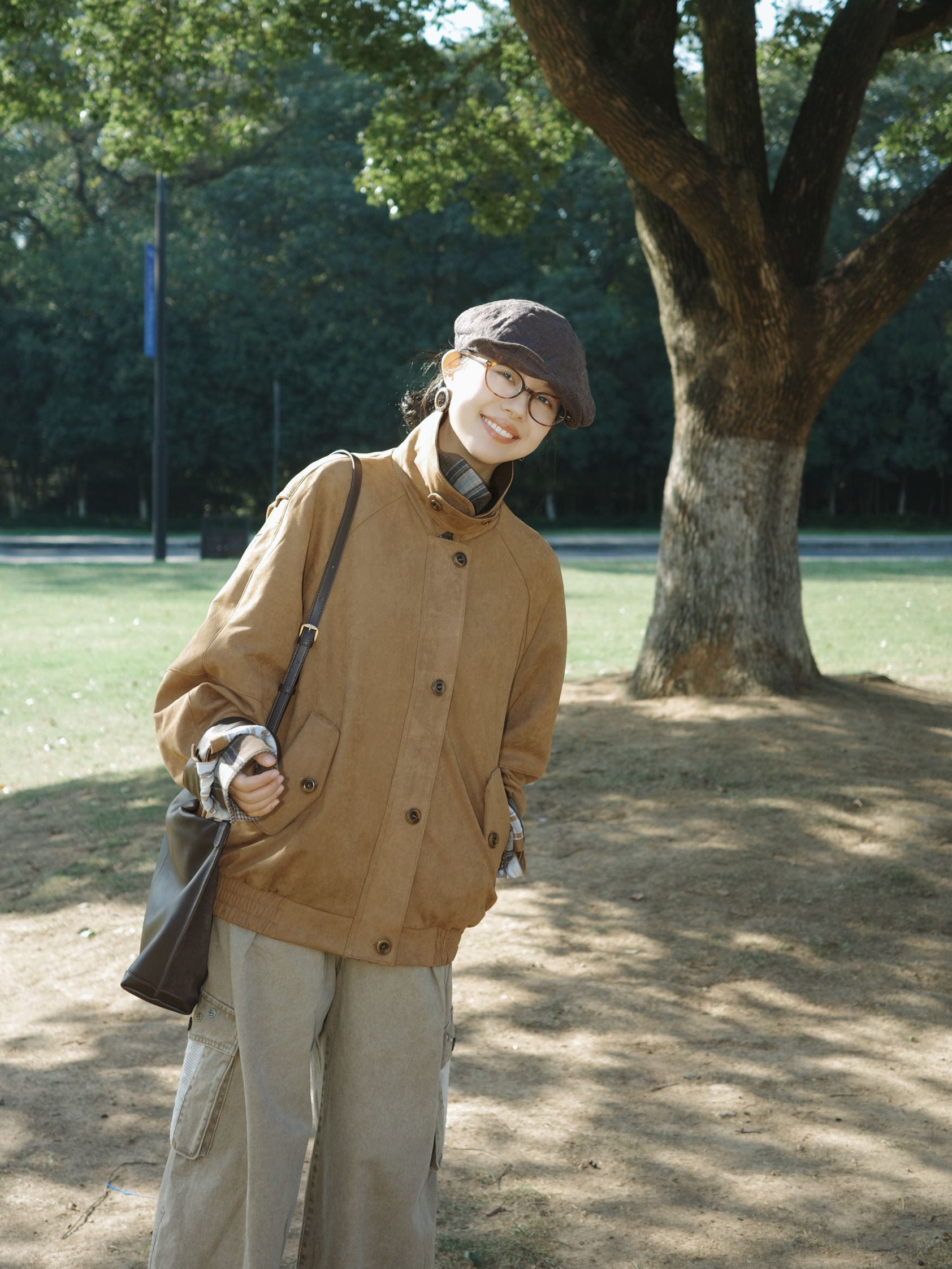 棕色灯芯绒外套质感软糯,领口拼接深棕皮料,扣上扣子自带复古工装的腔调,内搭灰棕格纹衬衫,领口随意散开的格纹像给秋天加了层复古滤镜,透气又有层次~ 浅卡其工装裤大口袋设计带点随性劲儿,裤脚垂坠感刚好遮住鞋面,配上棕色短靴,报童帽一戴,瞬间把氛围感拉回旧时光,肩上挎着同色系包包,整体大地色搭配在阳光下特别柔和,不张扬却处处有呼应。 外套的绒面泛着暖光,这种复古又自在的调调,真的很适合秋日晒太阳~