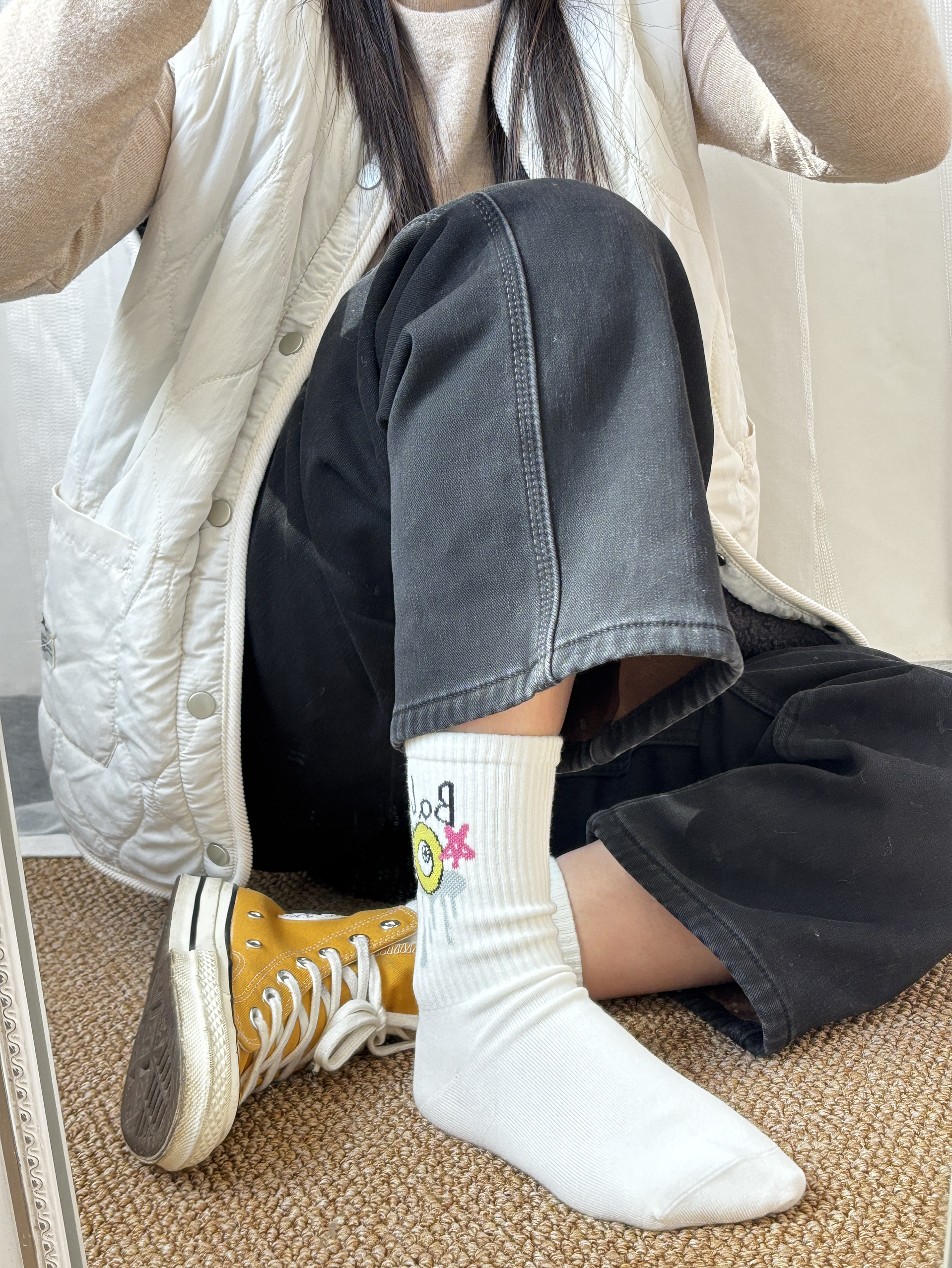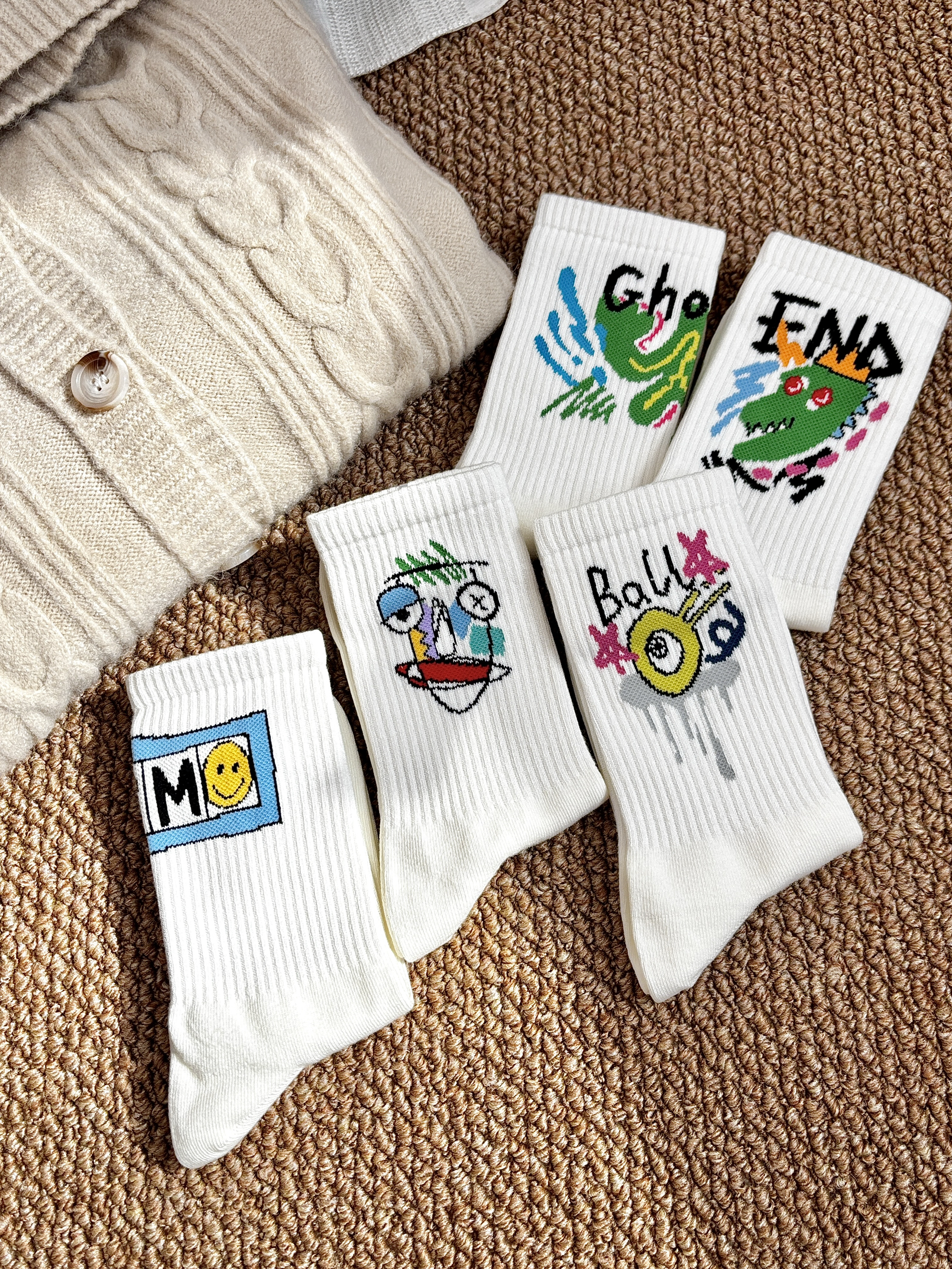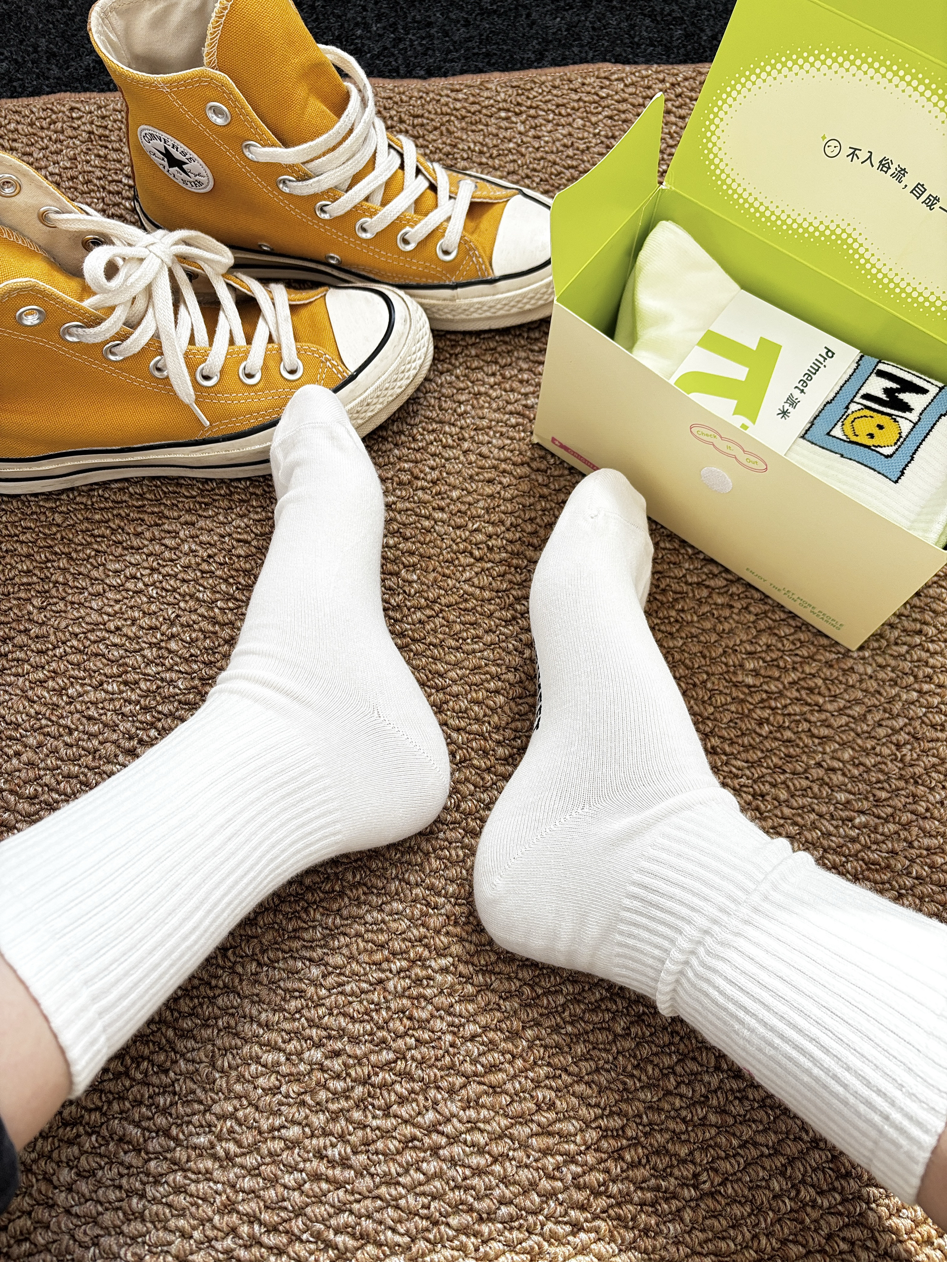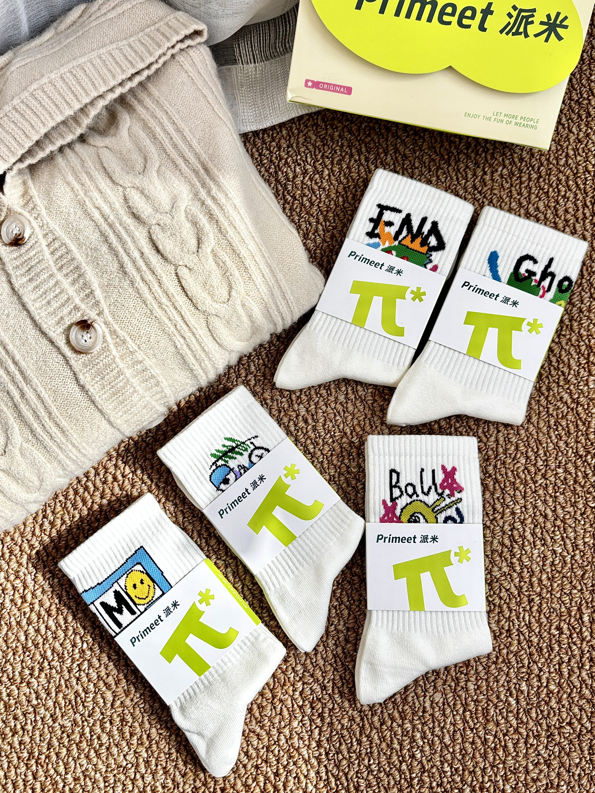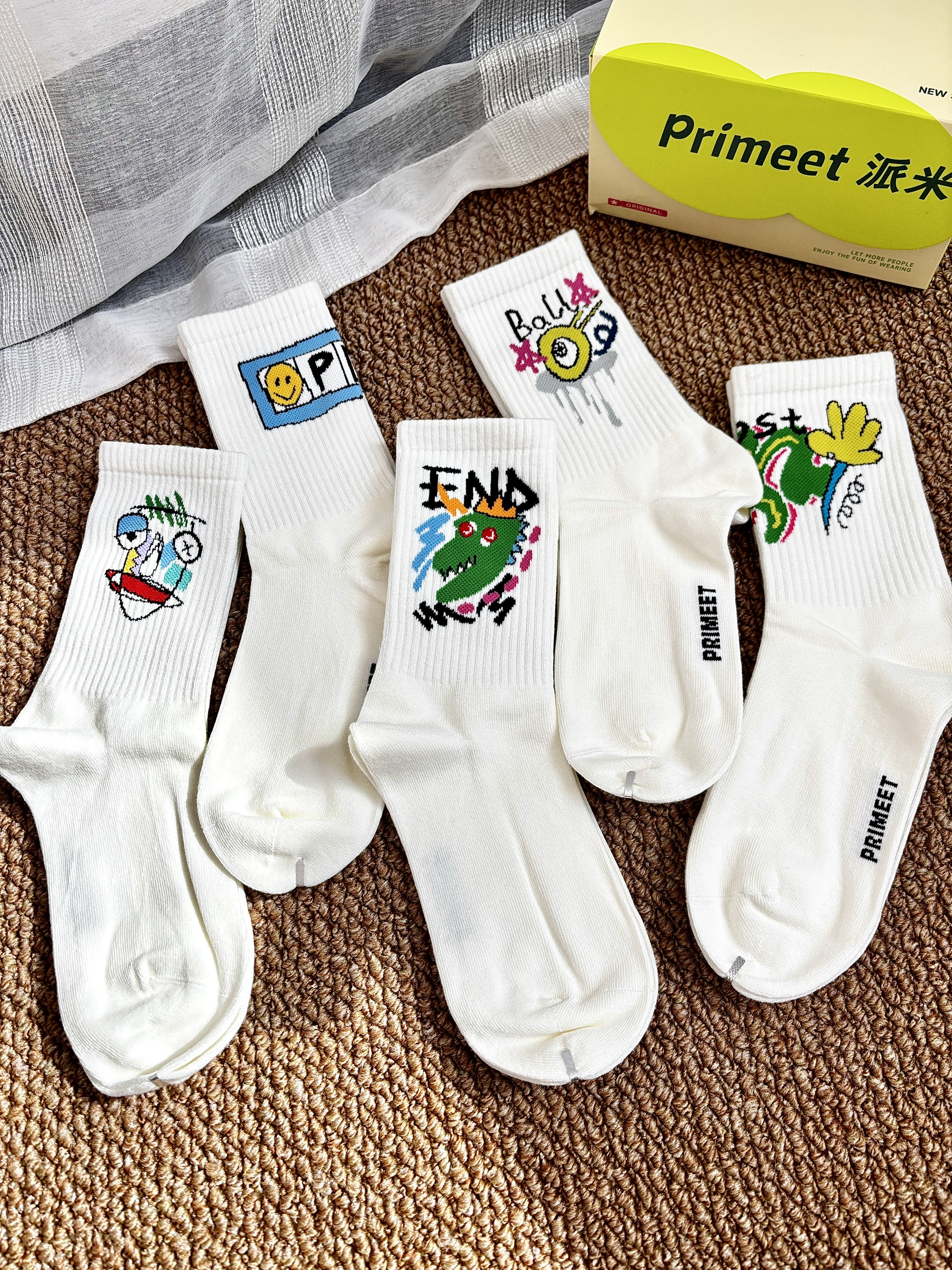 之前就买过 Primeet派米 家的袜子挺不错的 这次赶上双十一感觉这个很有设计感又剁手了 白色的袜身袜筒上搭配有趣可爱的图案 这样本来简约的袜子变得可爱又俏皮 hin 有设计感细节做的也不错 也很好搭配日常穿板鞋运动鞋都欧克✌️