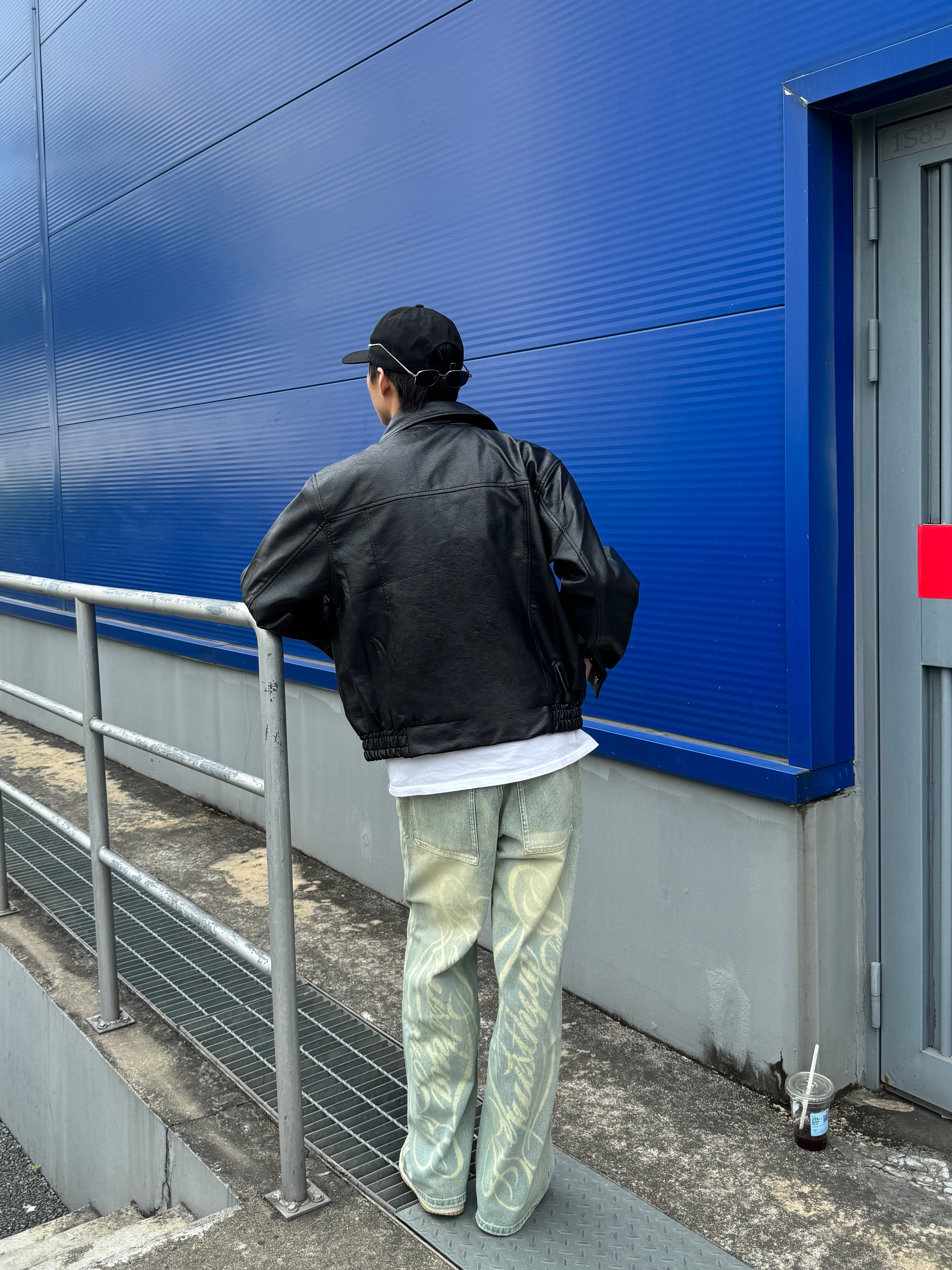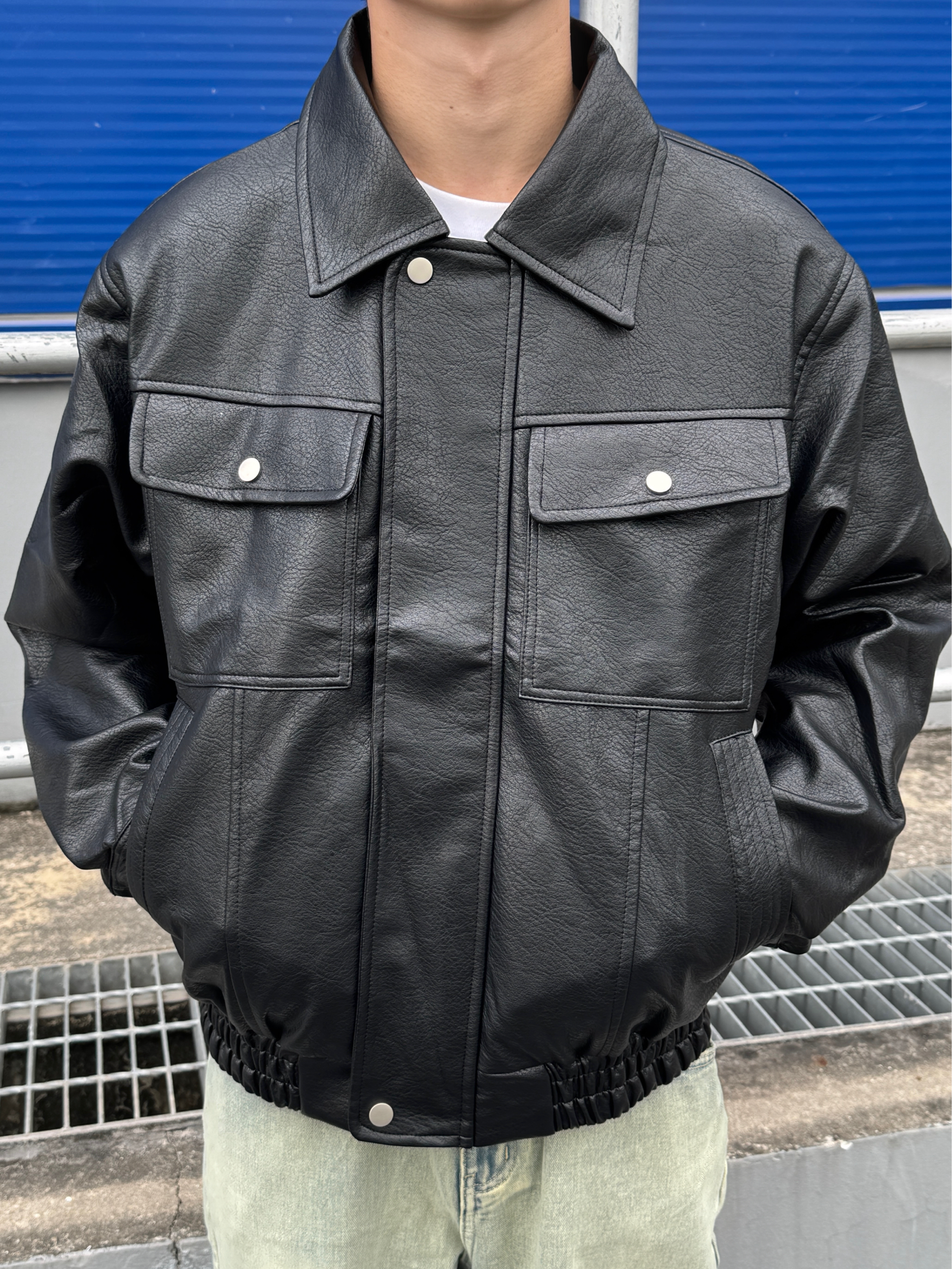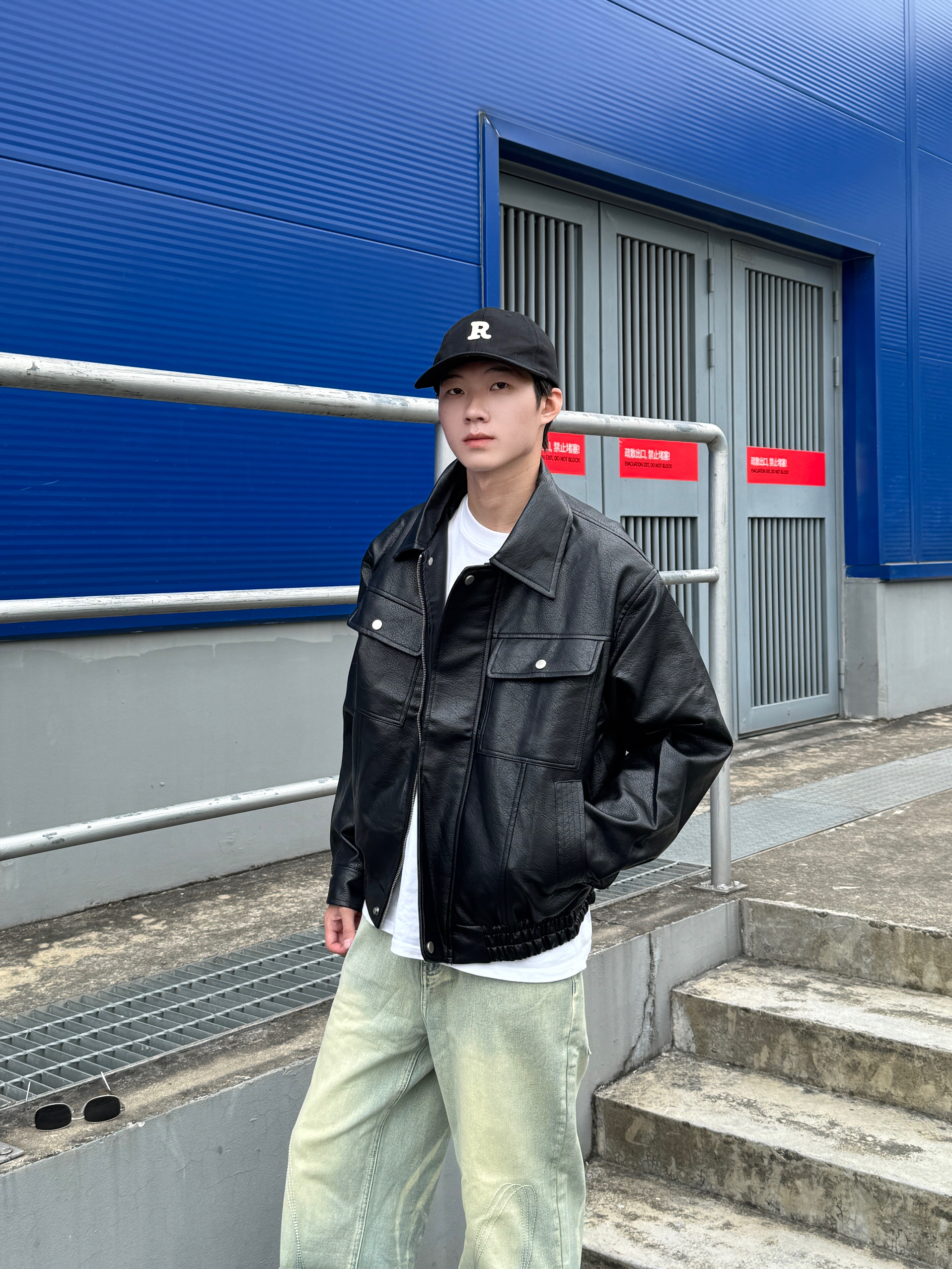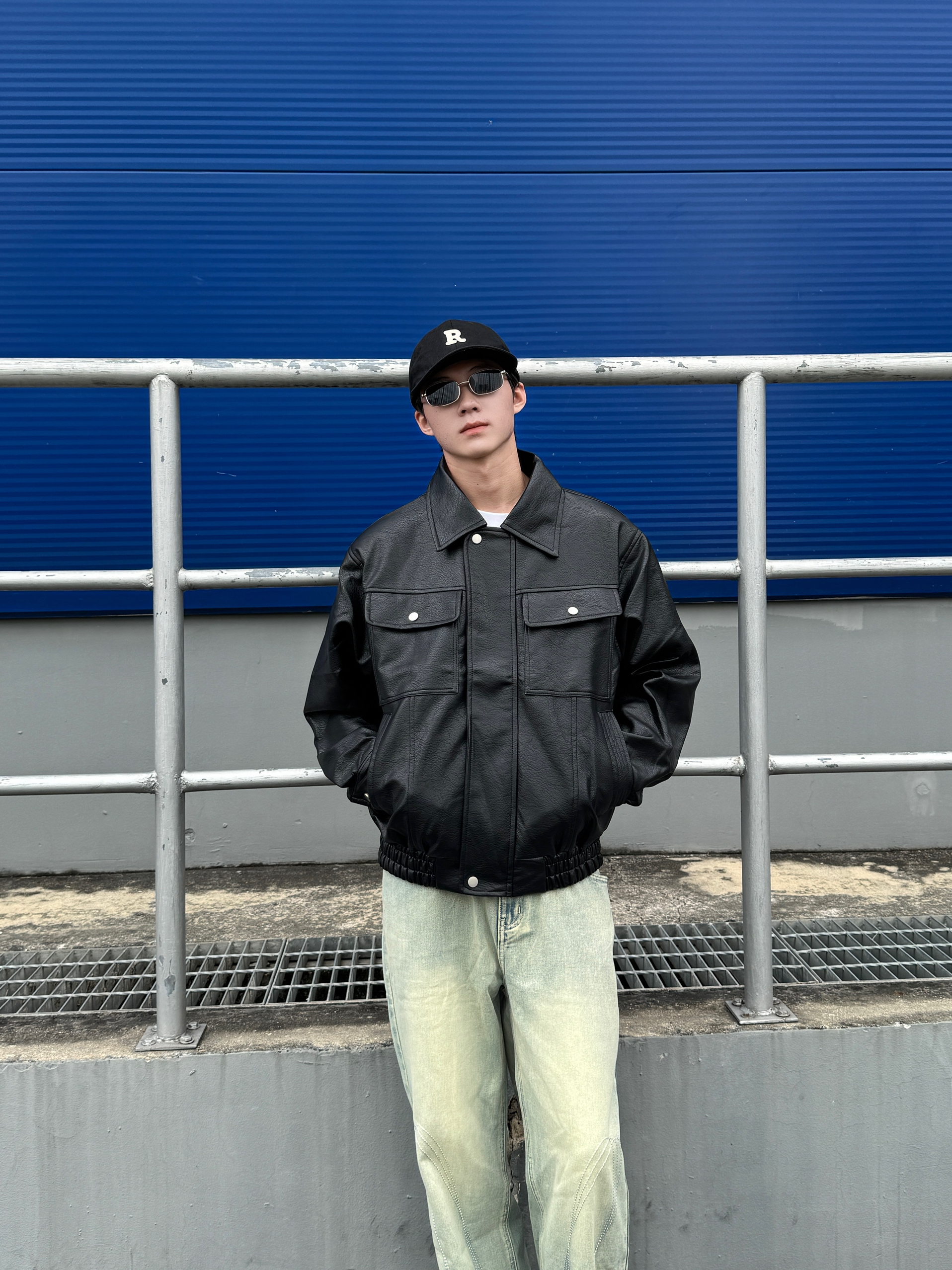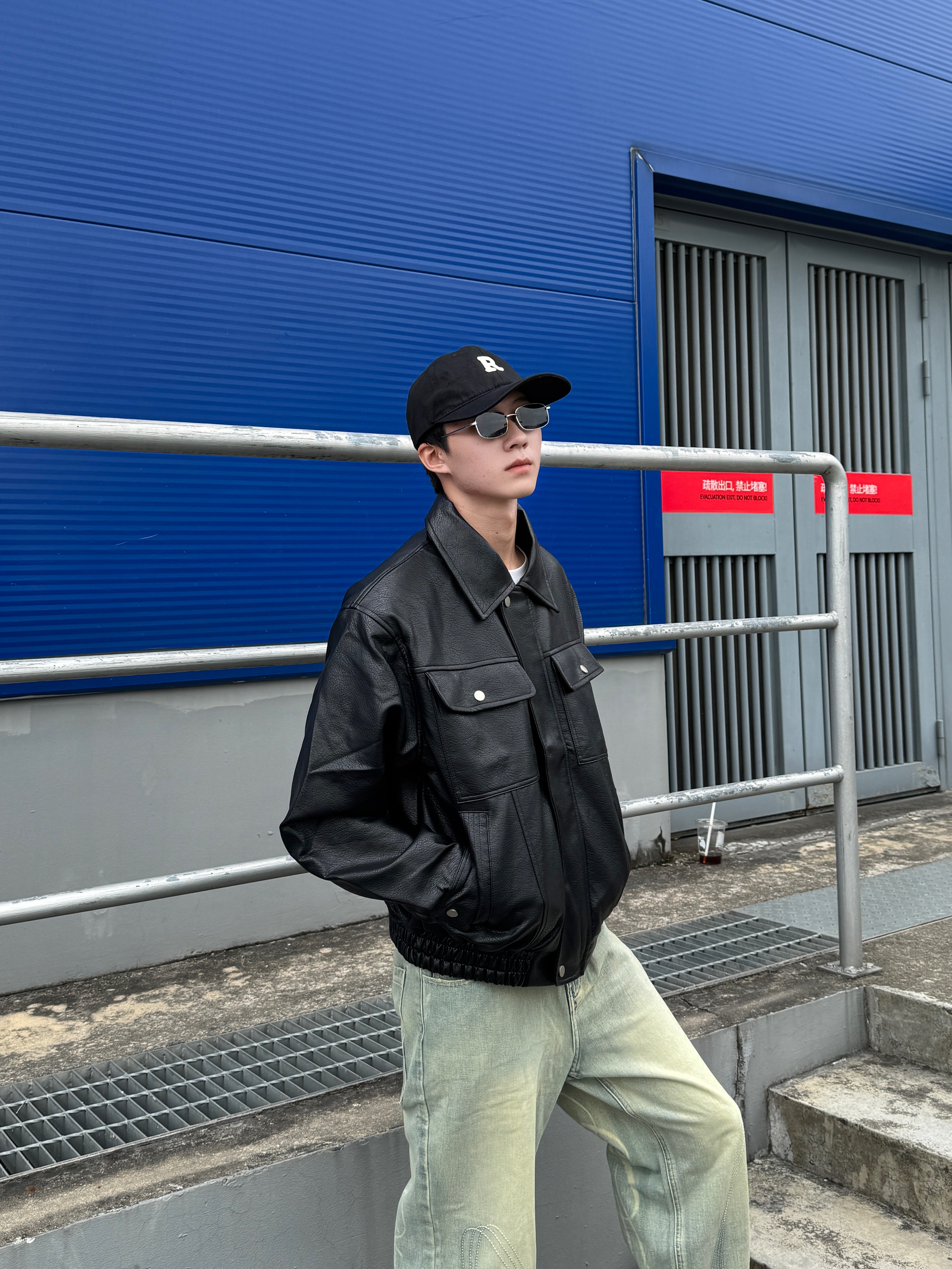 黑色墨镜一戴 生人勿近的气场直接拉满😎 外搭黑色美式皮衣 皮质光泽高级感满分 版型利落不臃肿~ 内搭纯白T恤轻松提亮层次 下身浅蓝弯刀牛仔裤独特剪裁修饰腿型 水洗色调清爽不沉闷 整身黑蓝配色又酷又清爽 出街直接锁定焦点✨