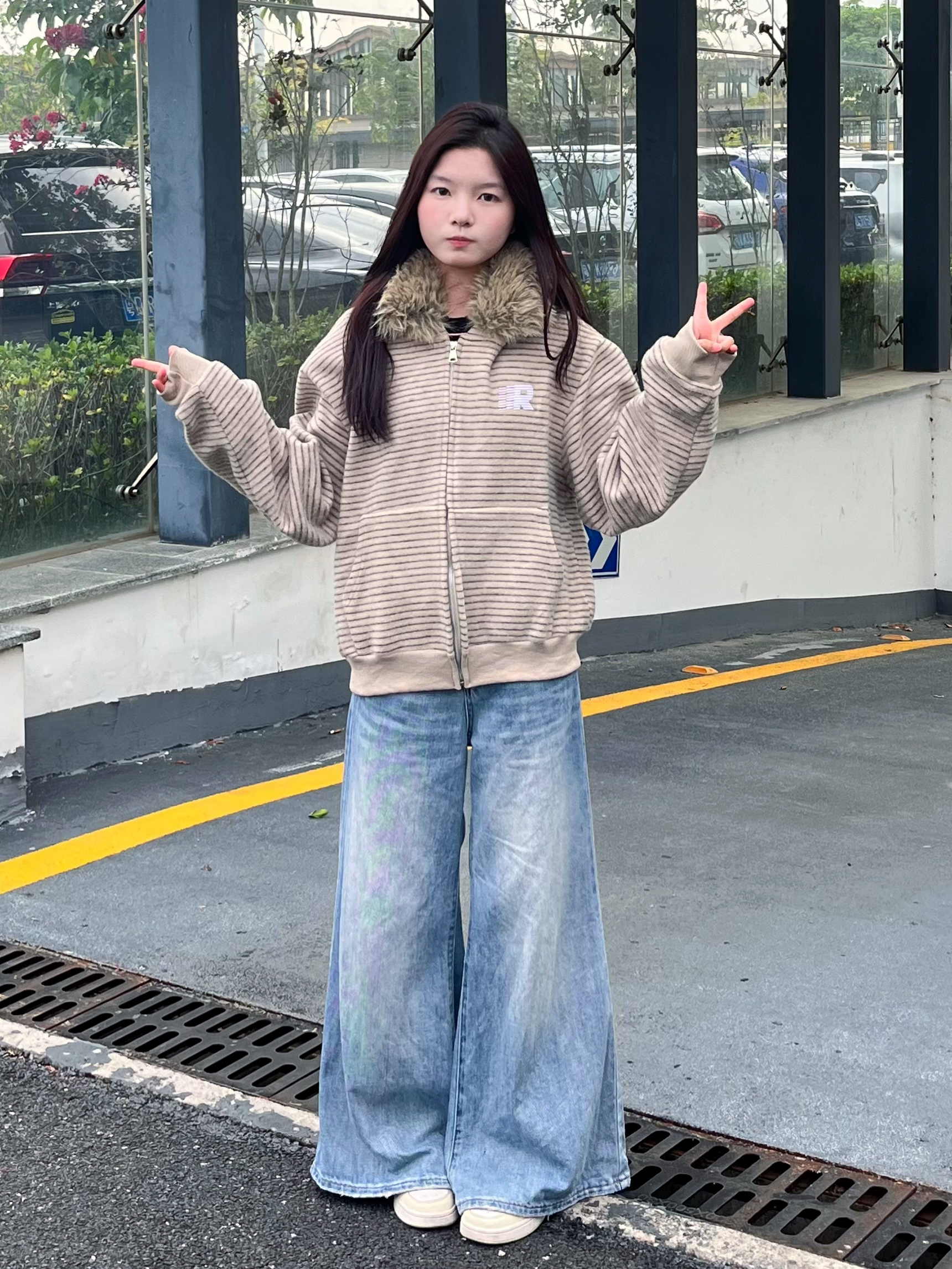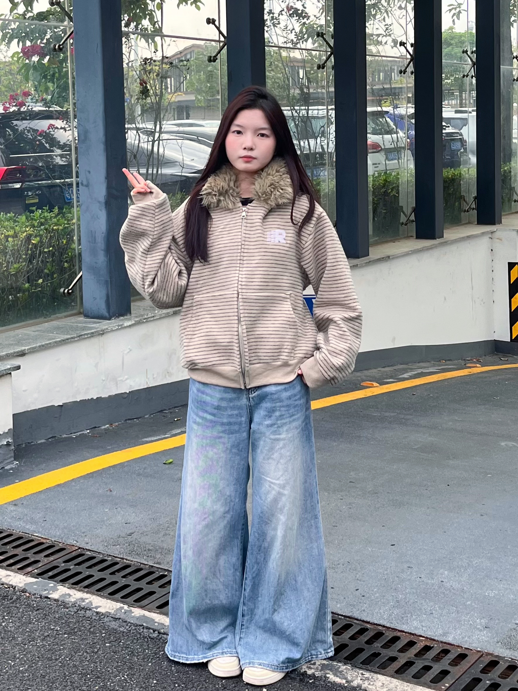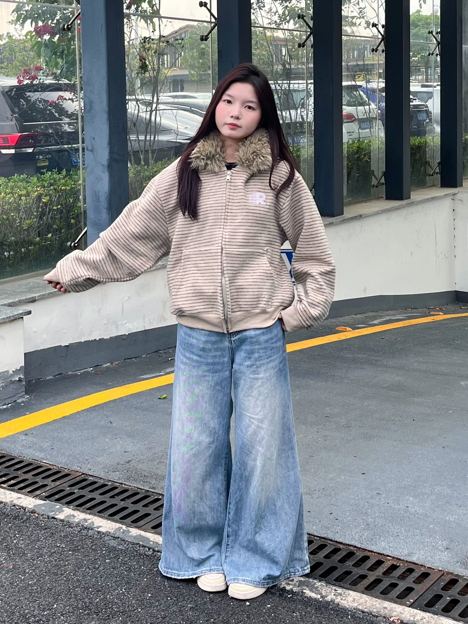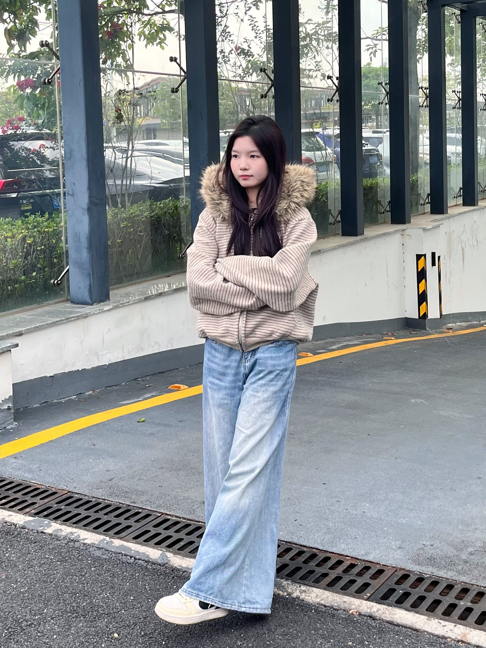 姐妹们 看看我今日搭配怎么样? 杏色的条纹外套+阔腿牛仔裤+百搭的小白鞋 外套面料厚实 有点重 不过超级保暖 温度低的时候穿它就很合适 你们觉得这件外套配什么裤子更好看呢? 欢迎在评论区留下你宝贵的建议