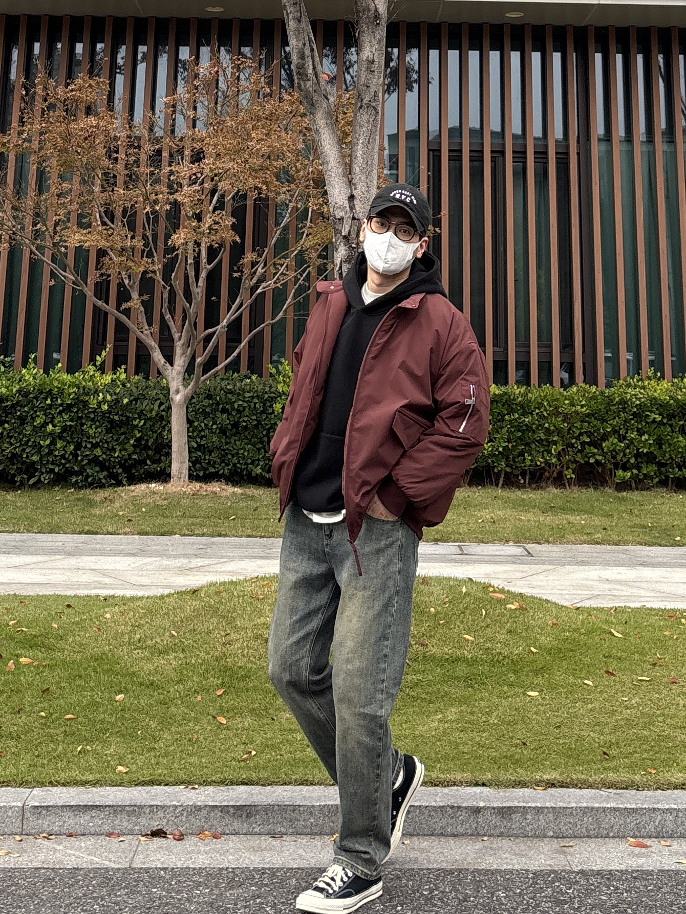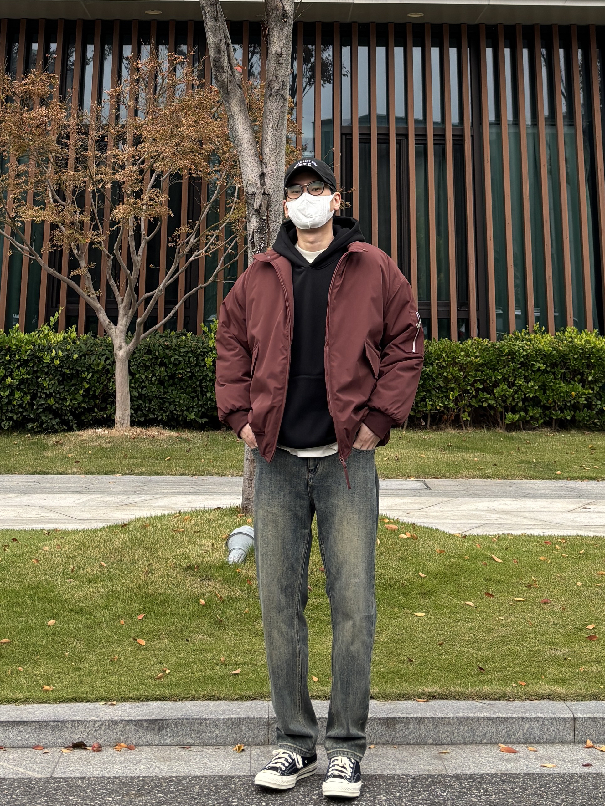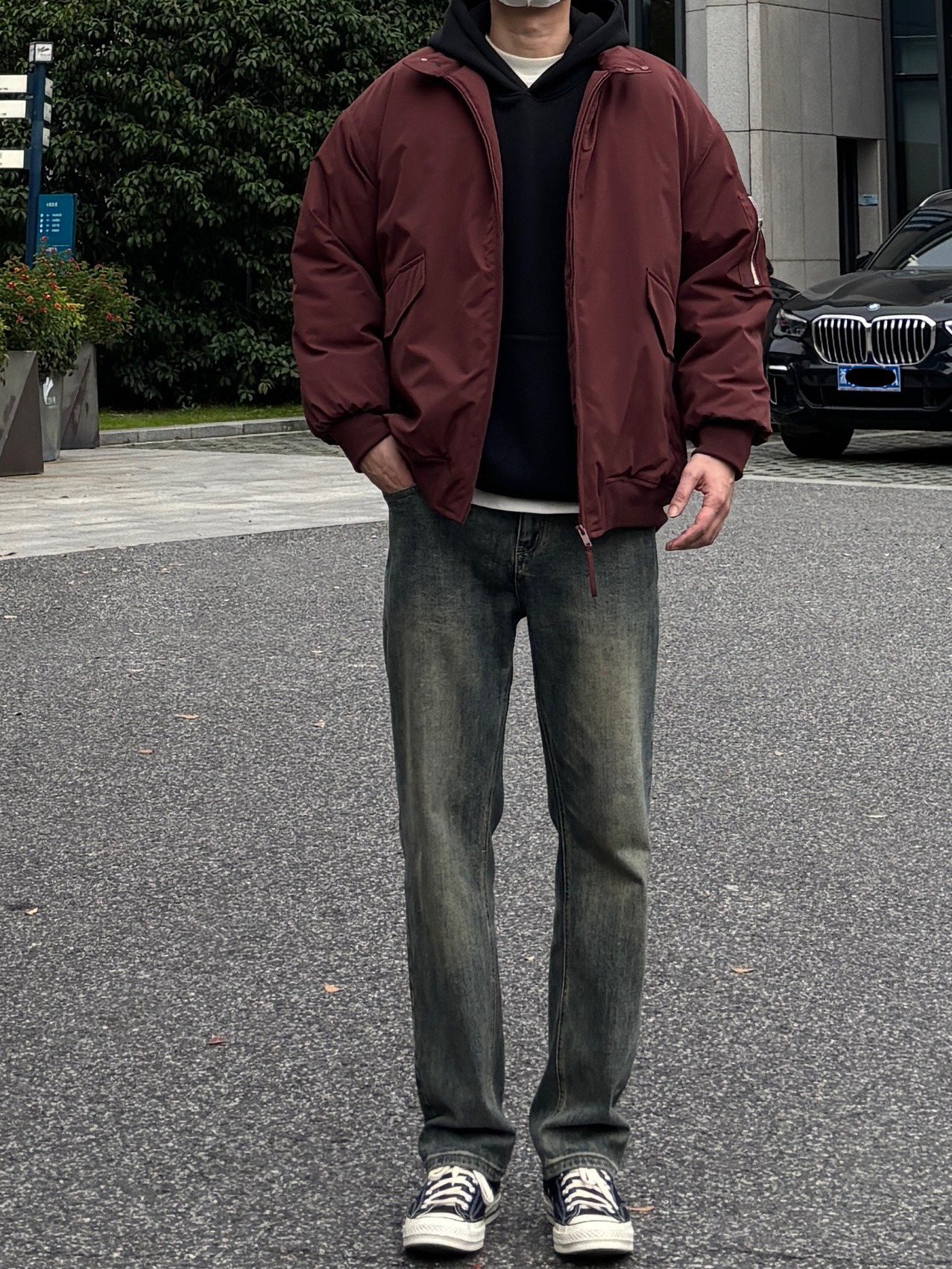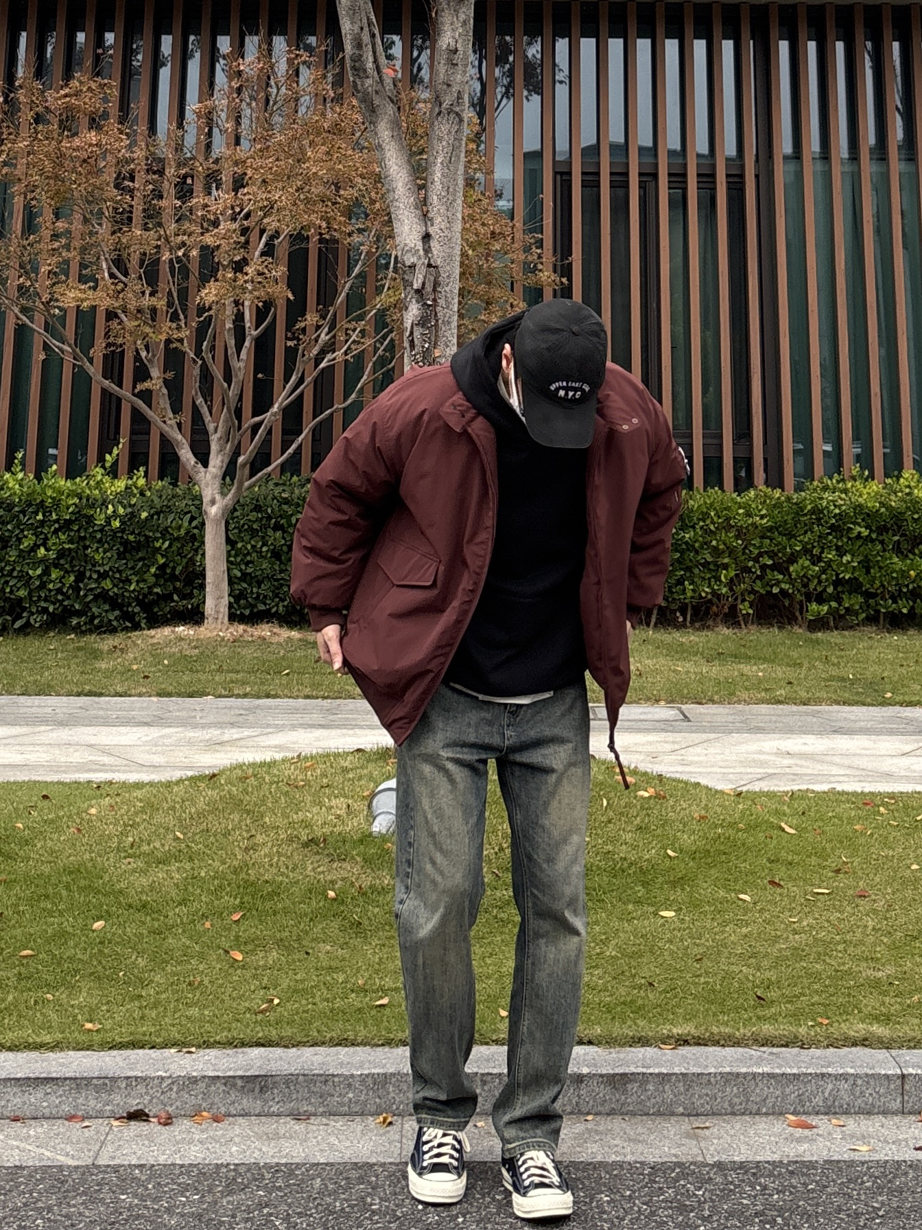 谁说工装风只能走硬汉路线?酒红色棉服也能穿出少年感。 酒红色立领复古翻领工装棉服+黑色连帽卫衣,宽松版型叠穿卫衣,层次感拉满还很保暖。 蓝色复古直筒牛仔裤+黑白低帮帆布鞋,最后搭配一顶棒球帽瞬间减龄,学生党、通勤族这样穿都很NICE👌 - 今日穿搭 衣服裤子:NICE LILI 鞋子:匡威1970s黑白