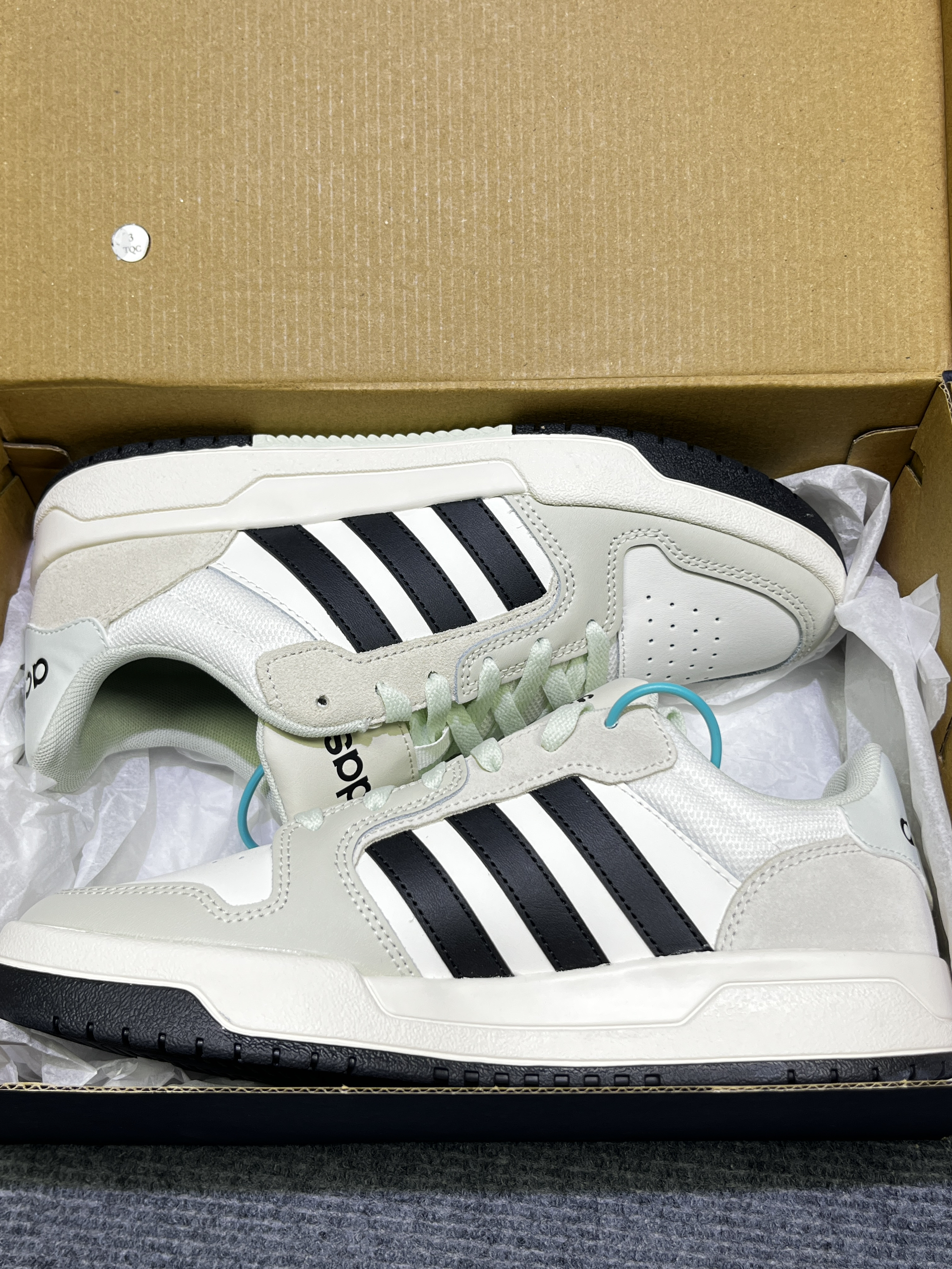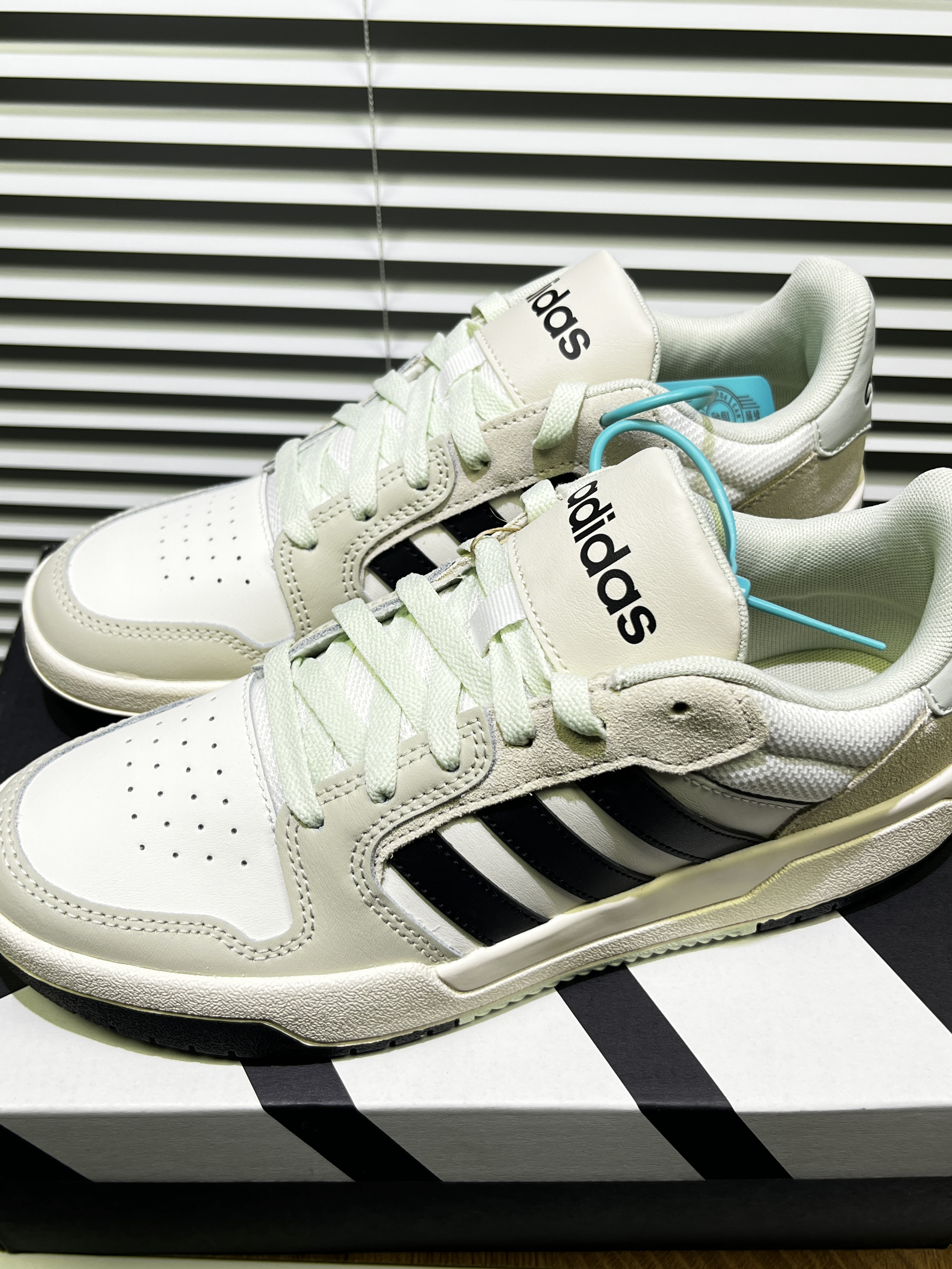 刚拆箱就被这奶白+浅灰的配色戳中,拼接材质软乎乎的不磨脚,鞋型是那种显瘦不笨重的款,脚宽星人友好~ 黑三条杠经典但不烂大街,鞋带和鞋尾那抹浅蓝绿是小心机,搭牛仔裤、运动裤都适配。鞋底厚度刚好,走路不板脚,透气孔设计春夏穿也不闷。