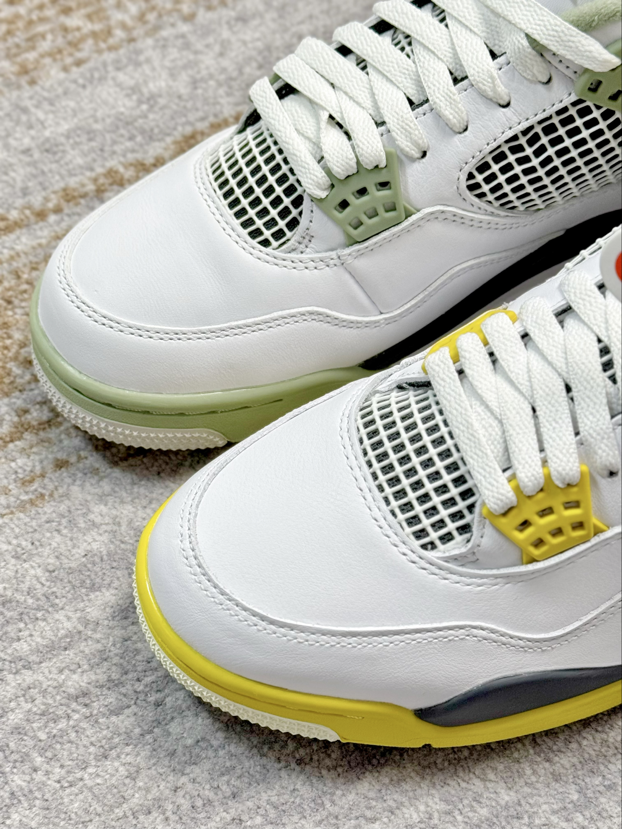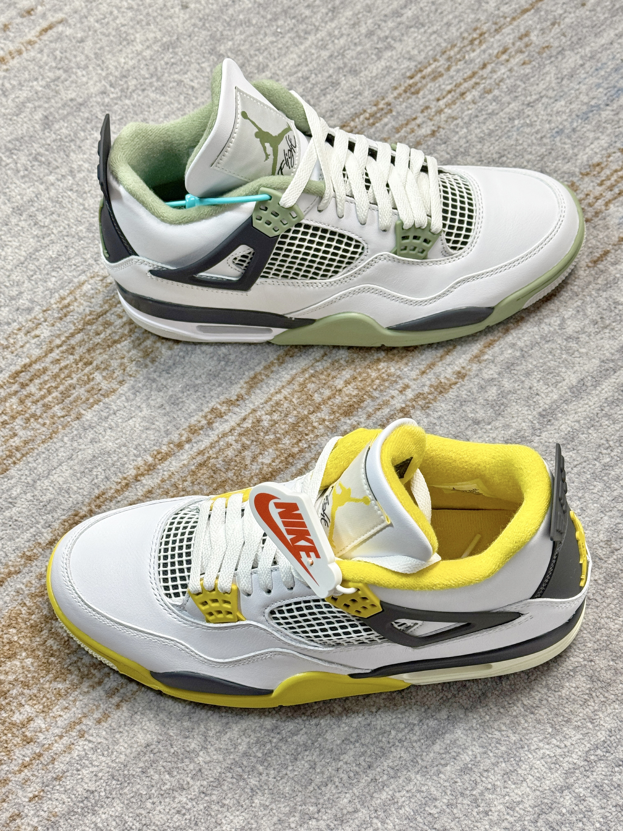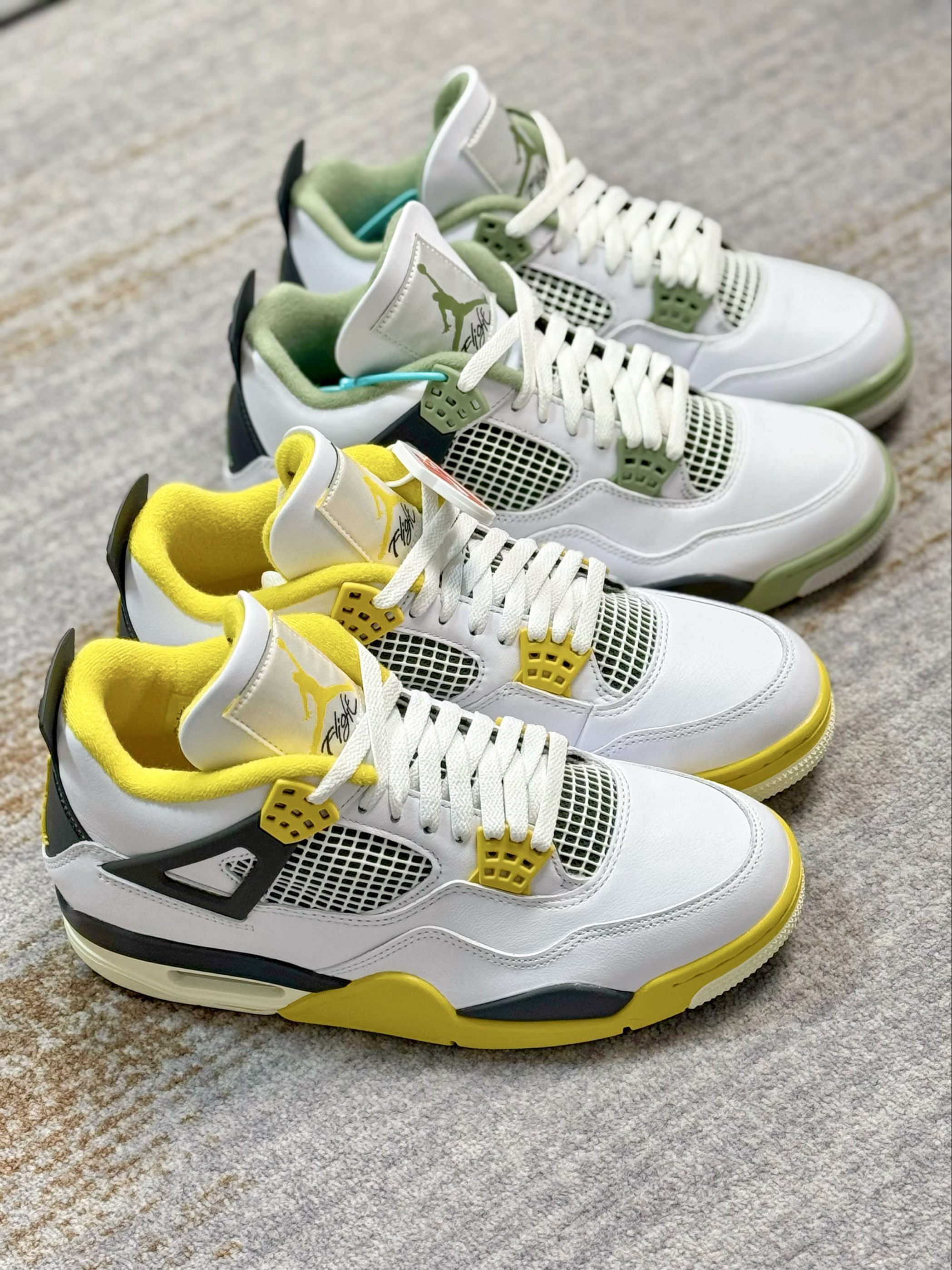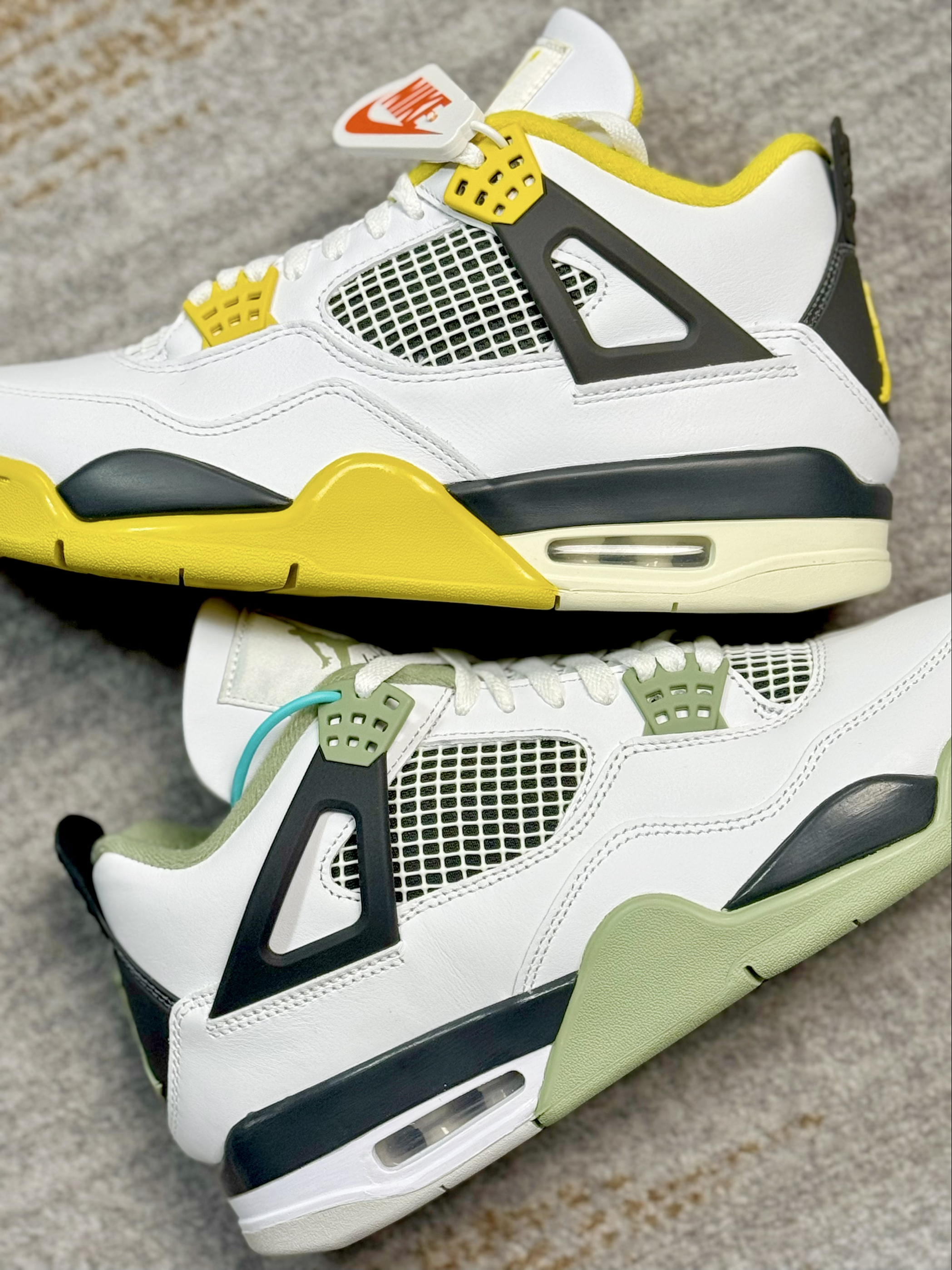 这两双AJ4在设计上基本上一摸一样 一双是鼠尾草绿,一双是黄色 在皮质和材质上来对比也是一样 给人的视觉效果上来说,略有不同 白黄配色中底做了氧化,看起来复古感十足 鼠尾草绿整体看起来干净清爽一些 上脚穿搭都是好看的,驾驭难度都不高 大家会喜欢哪一双,欢迎评论区留言讨论👏