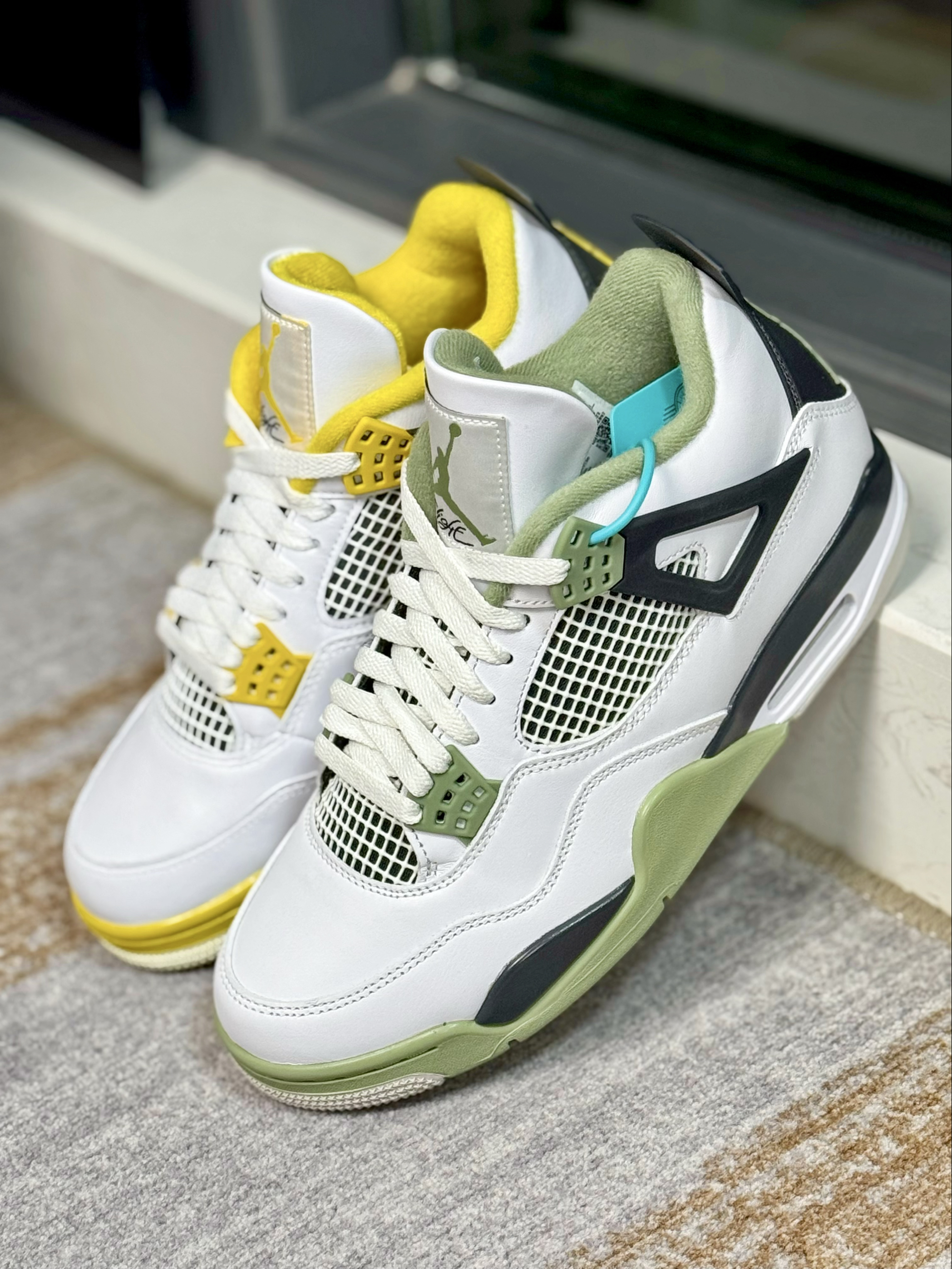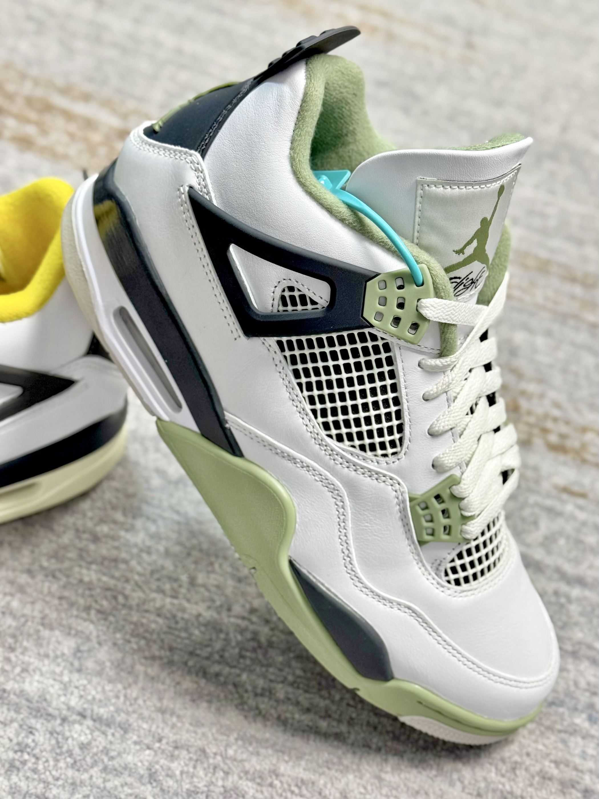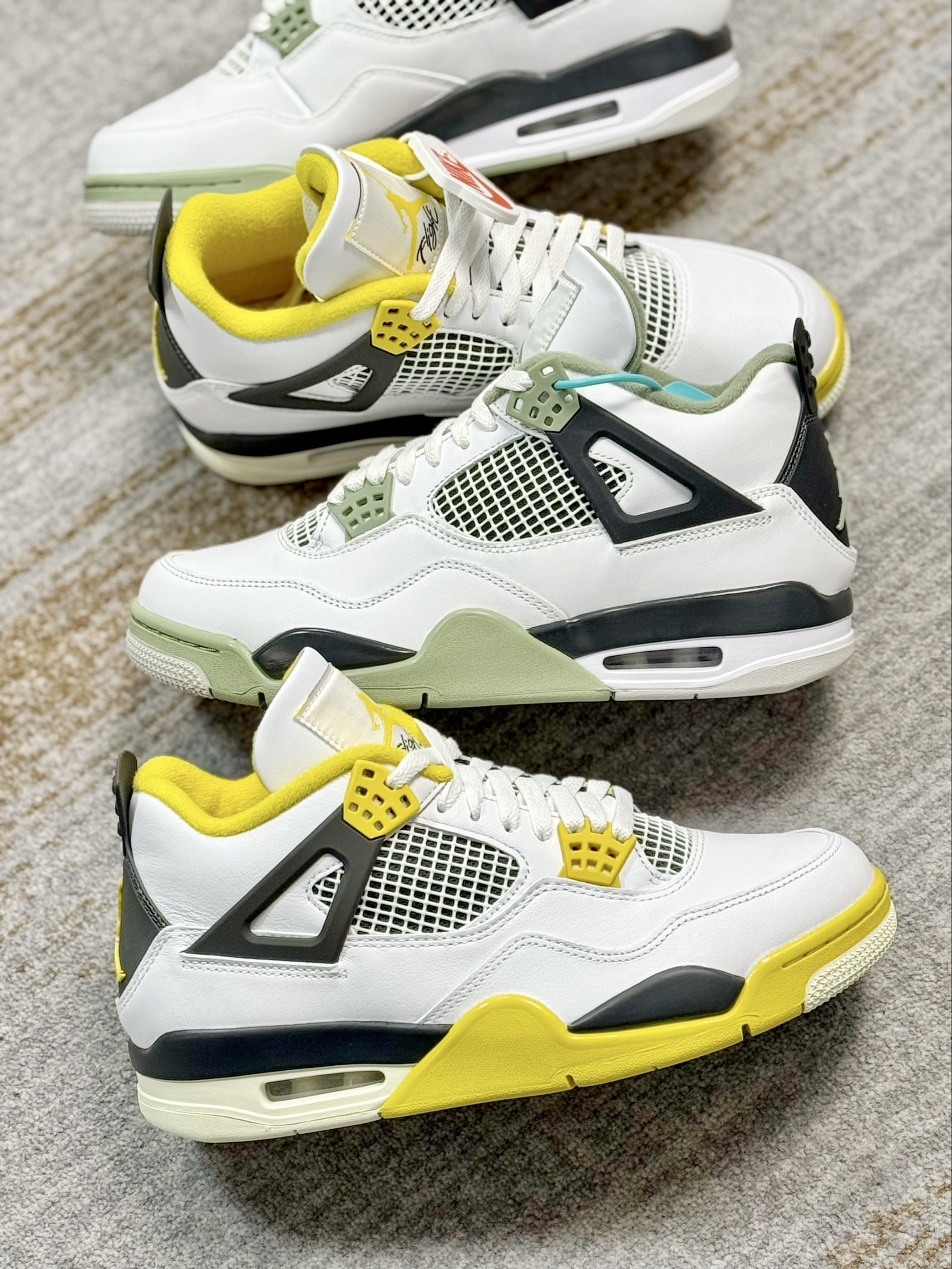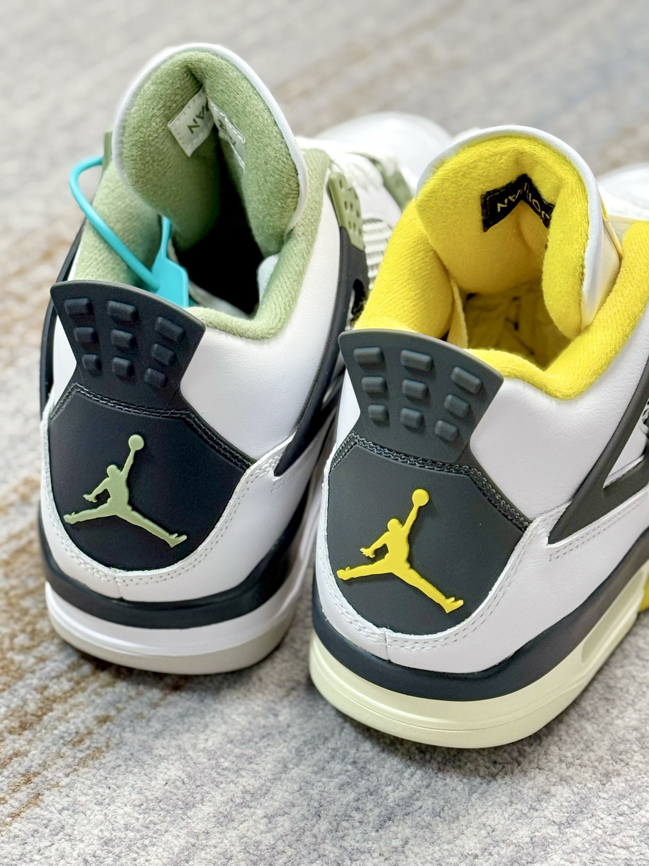 这两双AJ4在设计上基本上一摸一样 一双是鼠尾草绿,一双是黄色 在皮质和材质上来对比也是一样 给人的视觉效果上来说,略有不同 白黄配色中底做了氧化,看起来复古感十足 鼠尾草绿整体看起来干净清爽一些 上脚穿搭都是好看的,驾驭难度都不高 大家会喜欢哪一双,欢迎评论区留言讨论👏