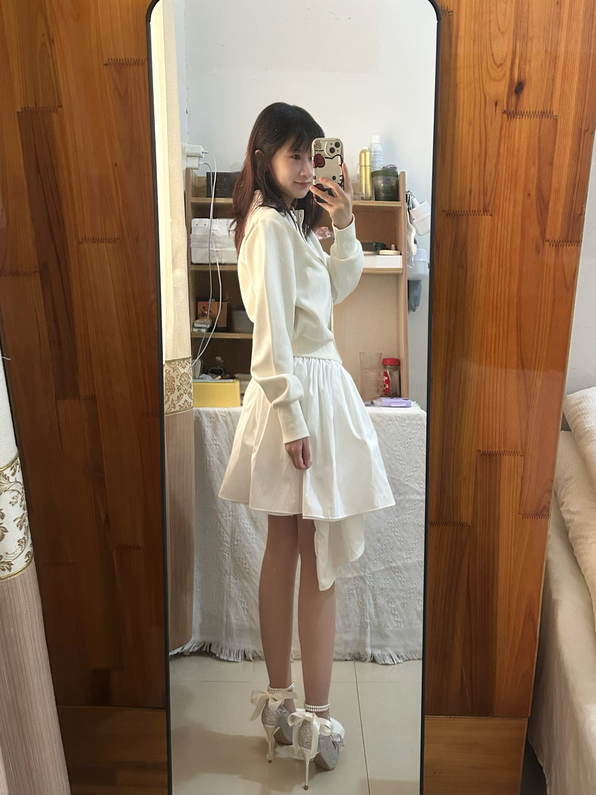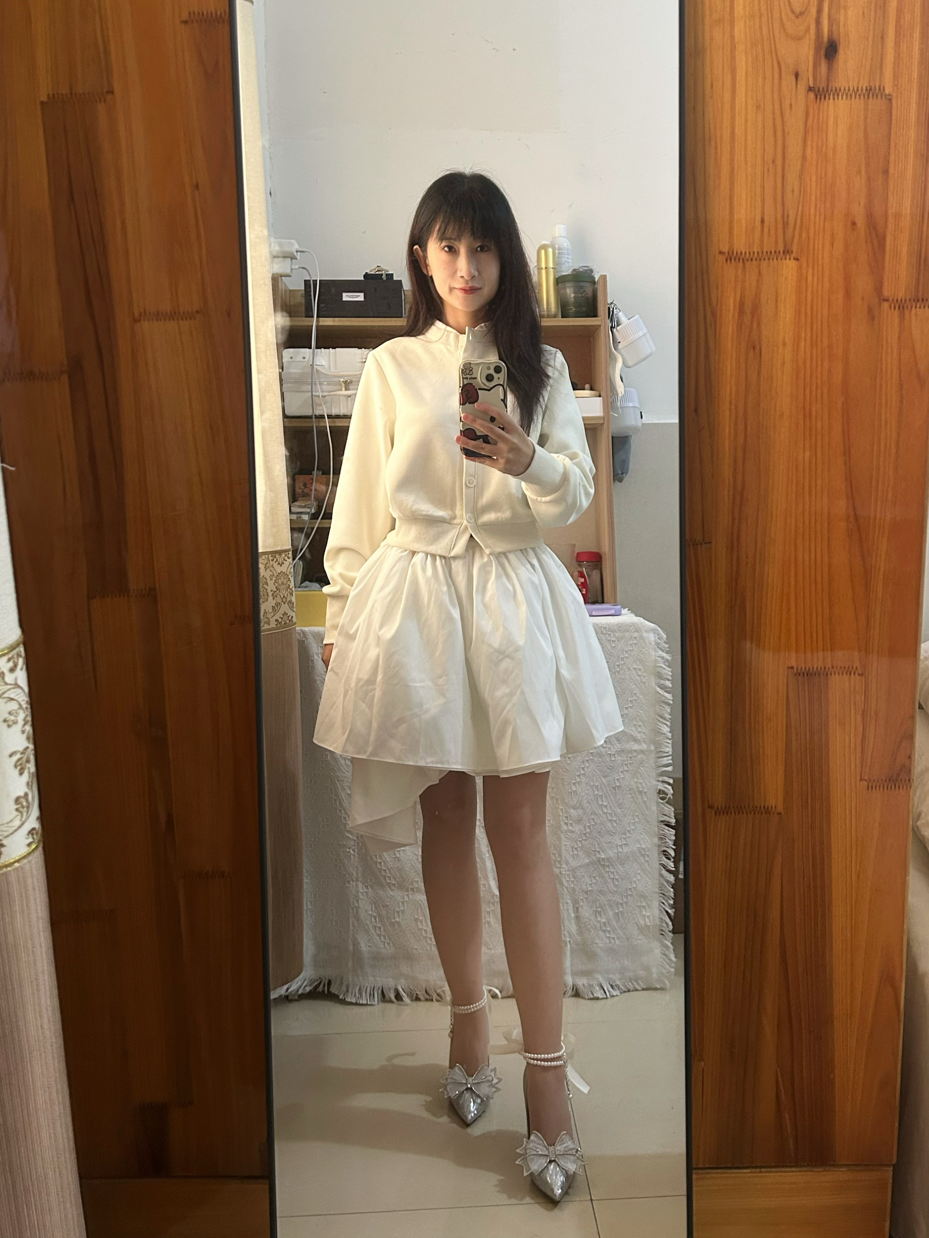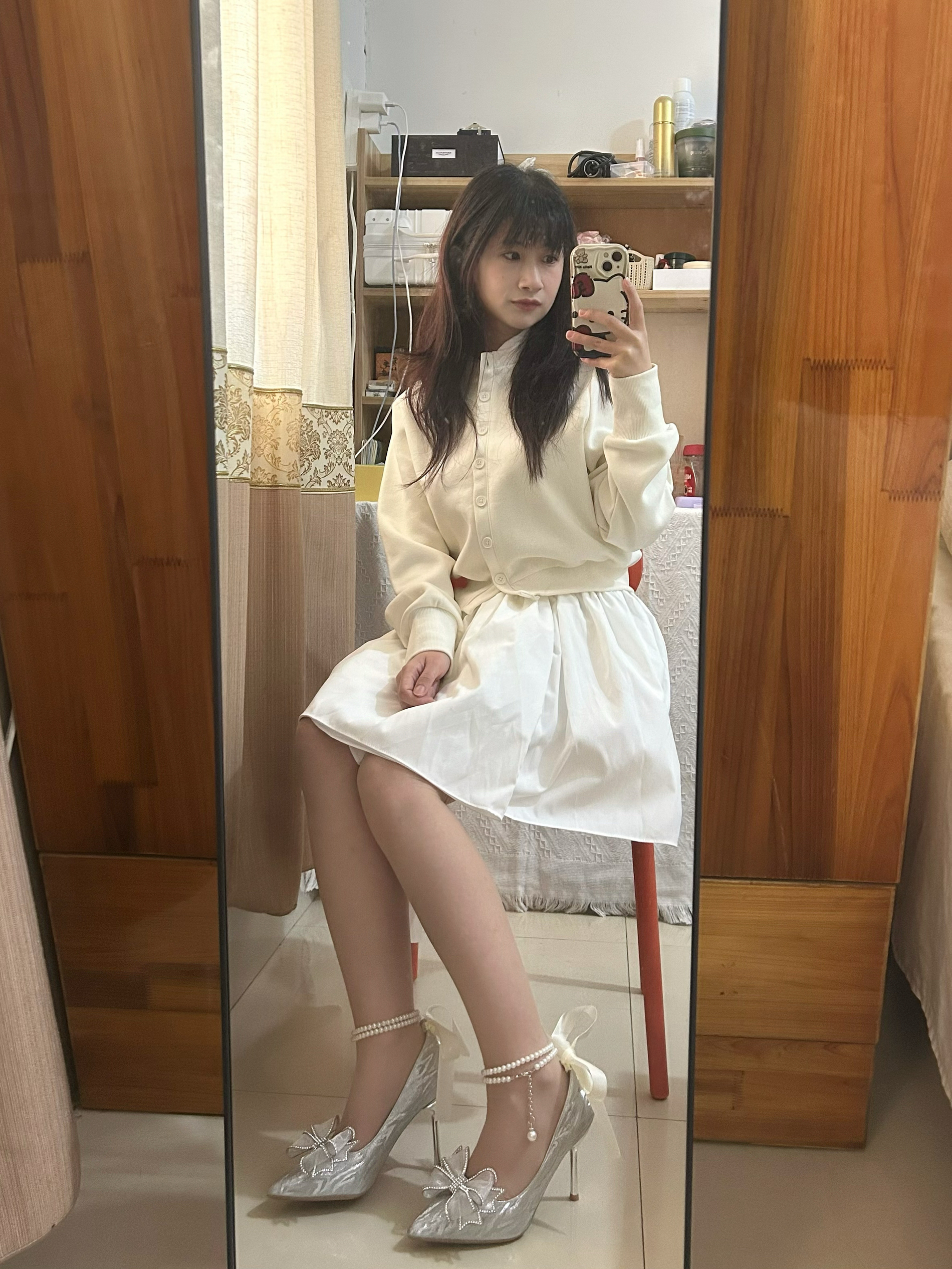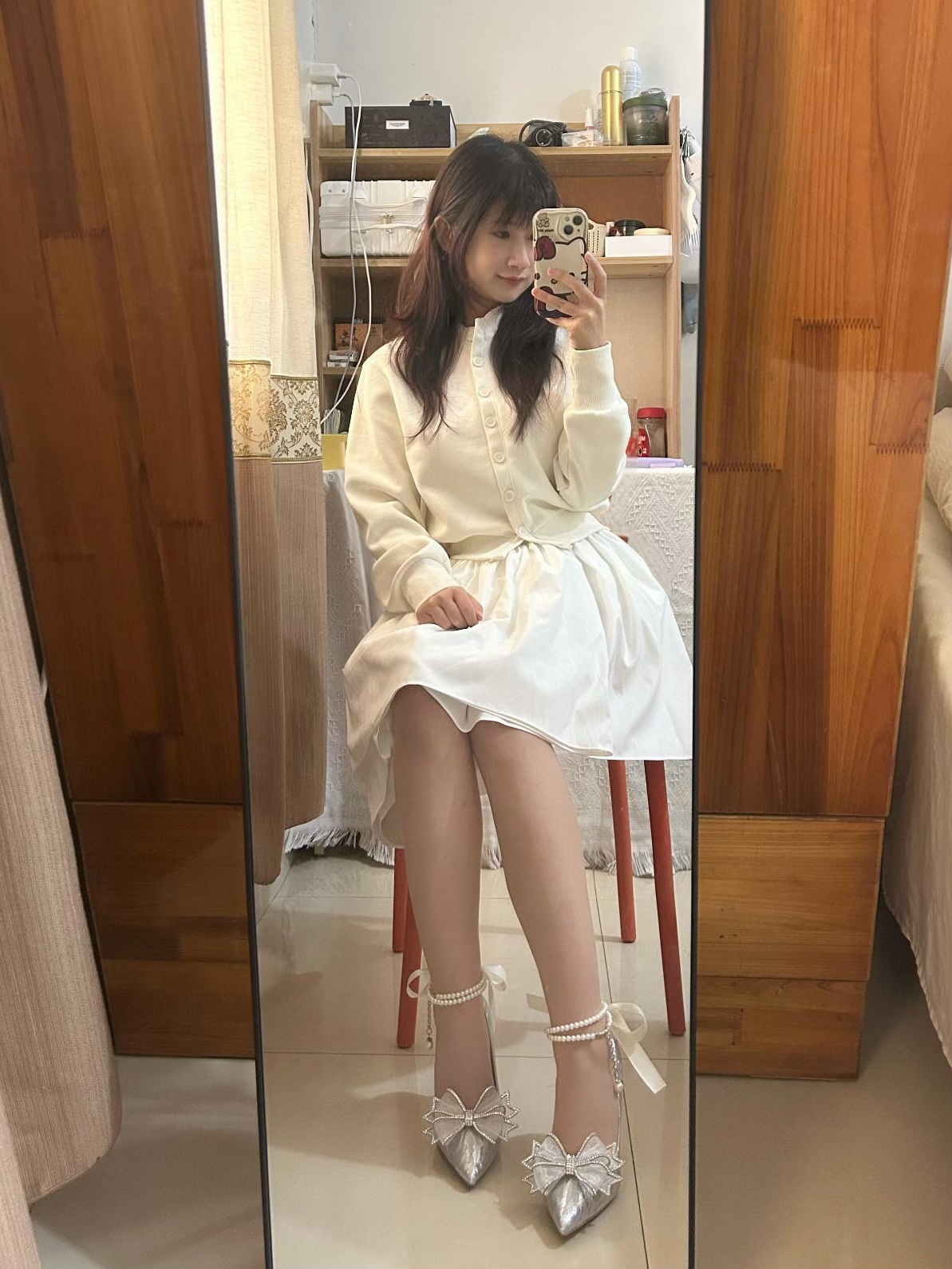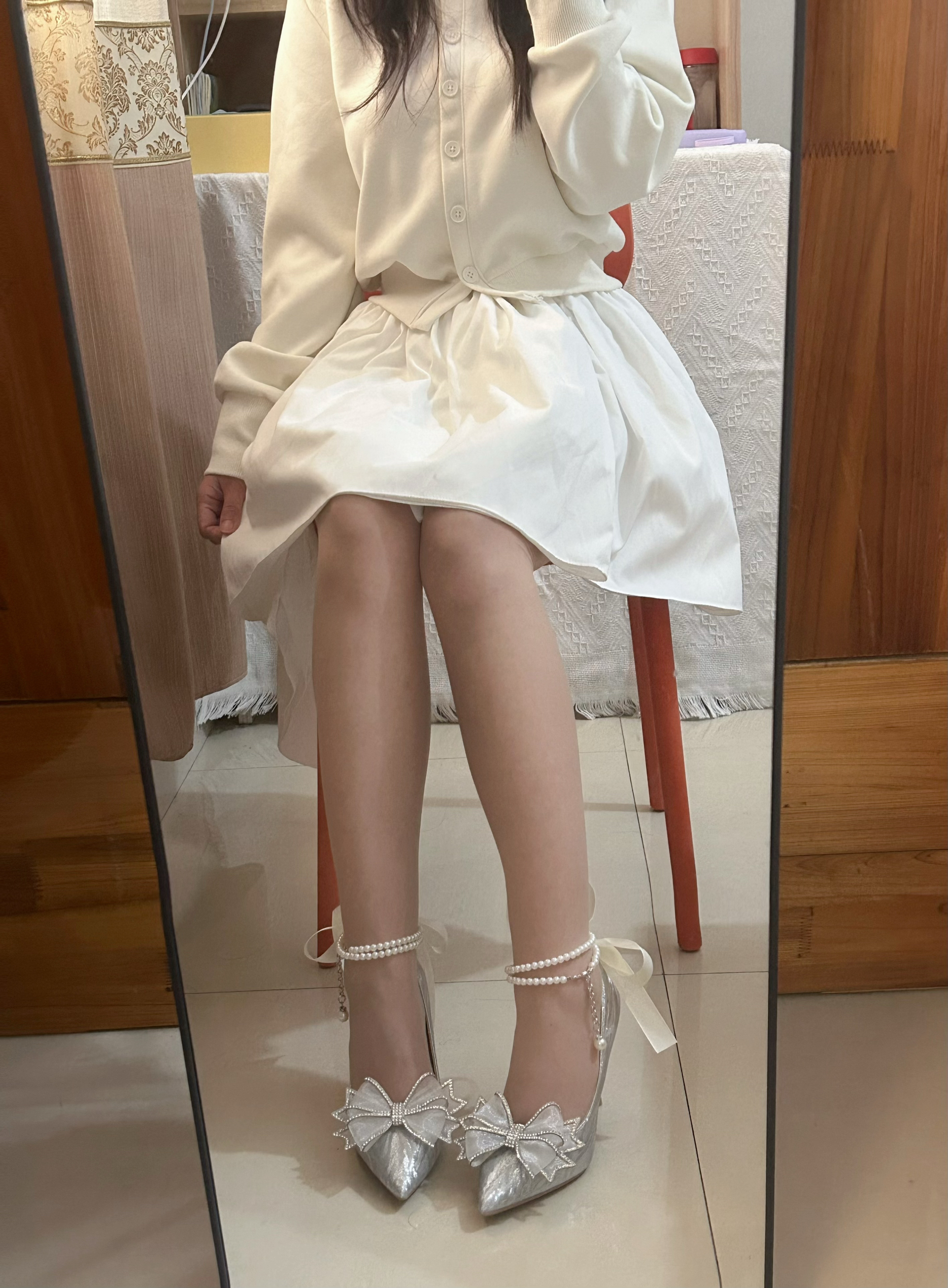 穿了一套温柔的米白色套裙 搭配这双 小香风高跟鞋 银色蝴蝶结装饰🎀搭配珍珠链 Blingbling的好有贵气感 我觉得小细跟儿还挺显腿型的🥰 这一套妥妥的精致大小姐范