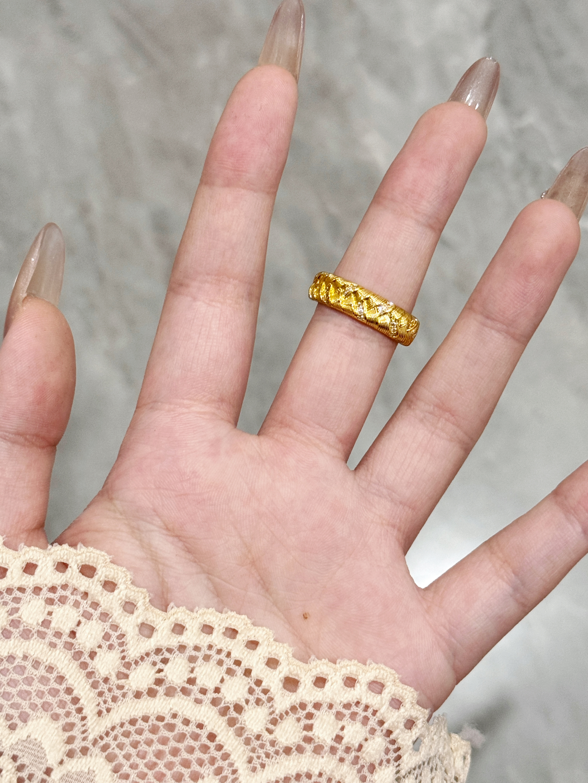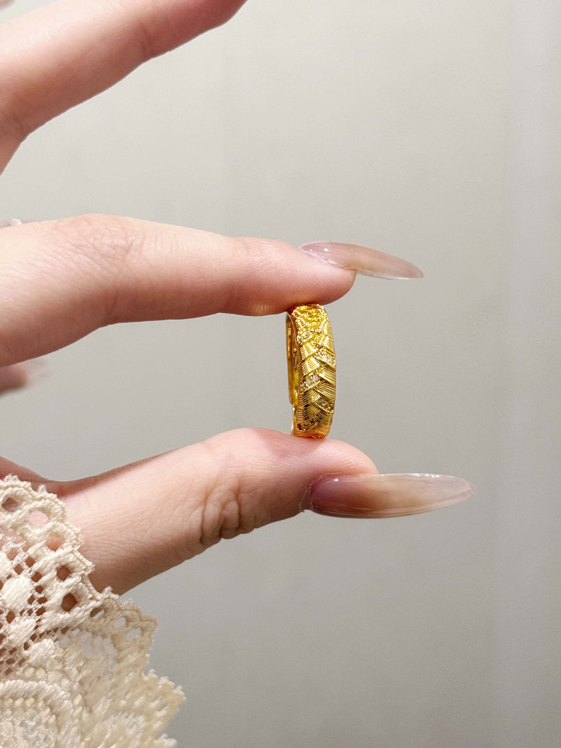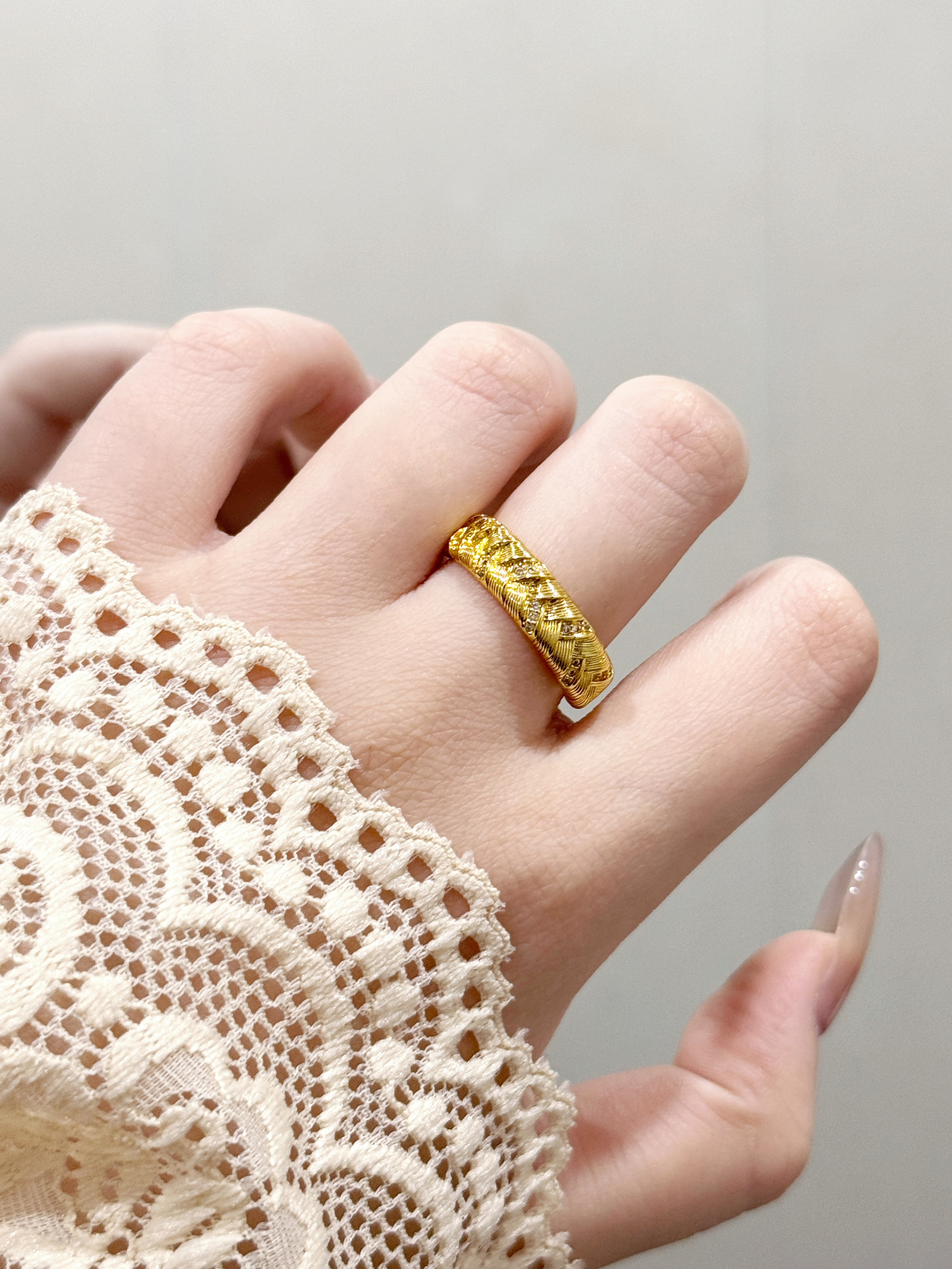 不是刻板的厚重金饰,是带着手工纹理的松弛感—— 像把细碎的光编进纹路里,戴在手上是低调的闪,却又藏不住质感的暖。 配裸色美甲是精致,搭蕾丝袖口是温柔,日常抬手时的光泽,比刻意的华丽更戳人。 不用等特殊日子,这枚戒指就是给生活的小点缀: 把“贵气”揉成日常,让每一次抬手都有细碎的欢喜~