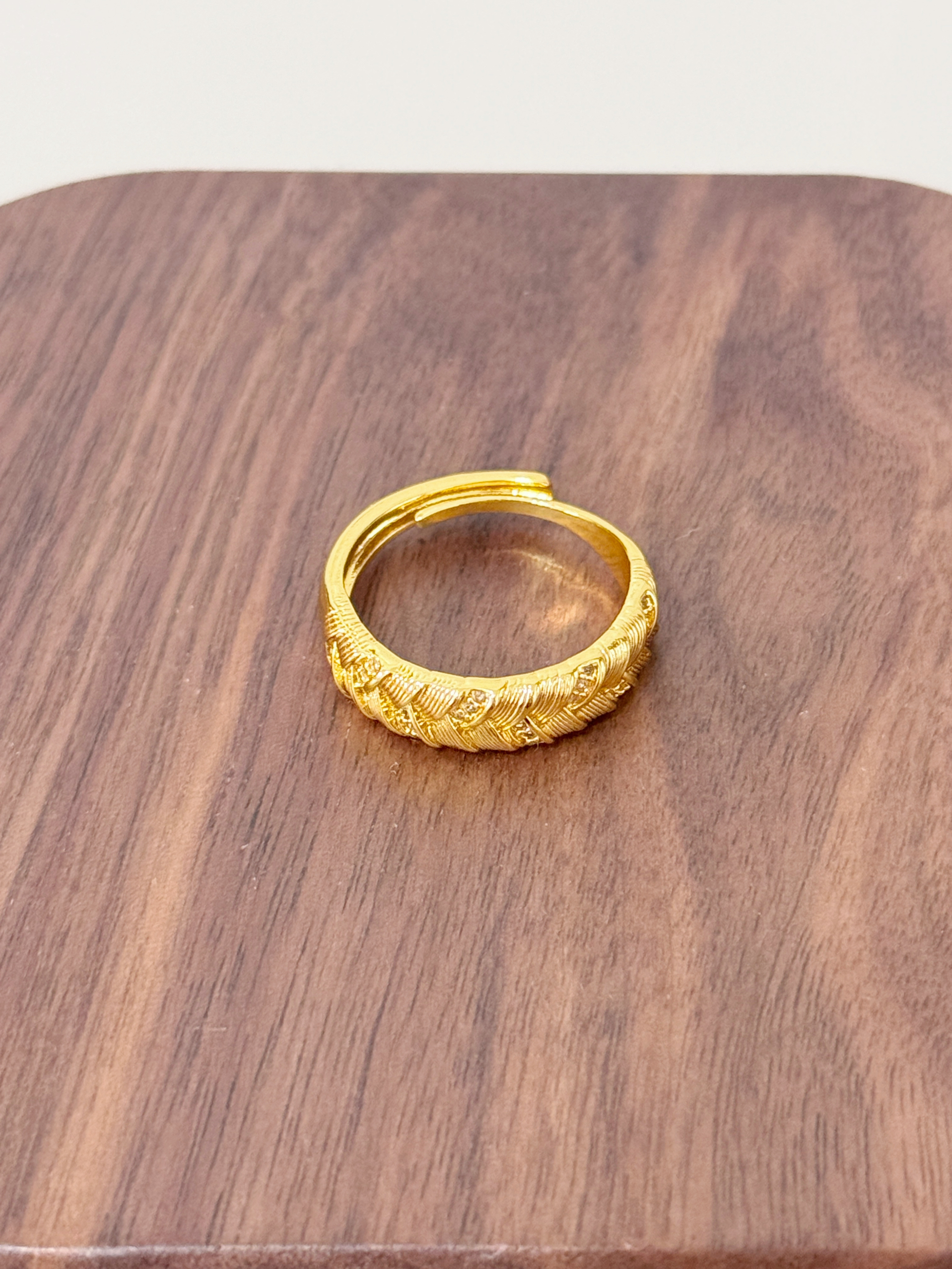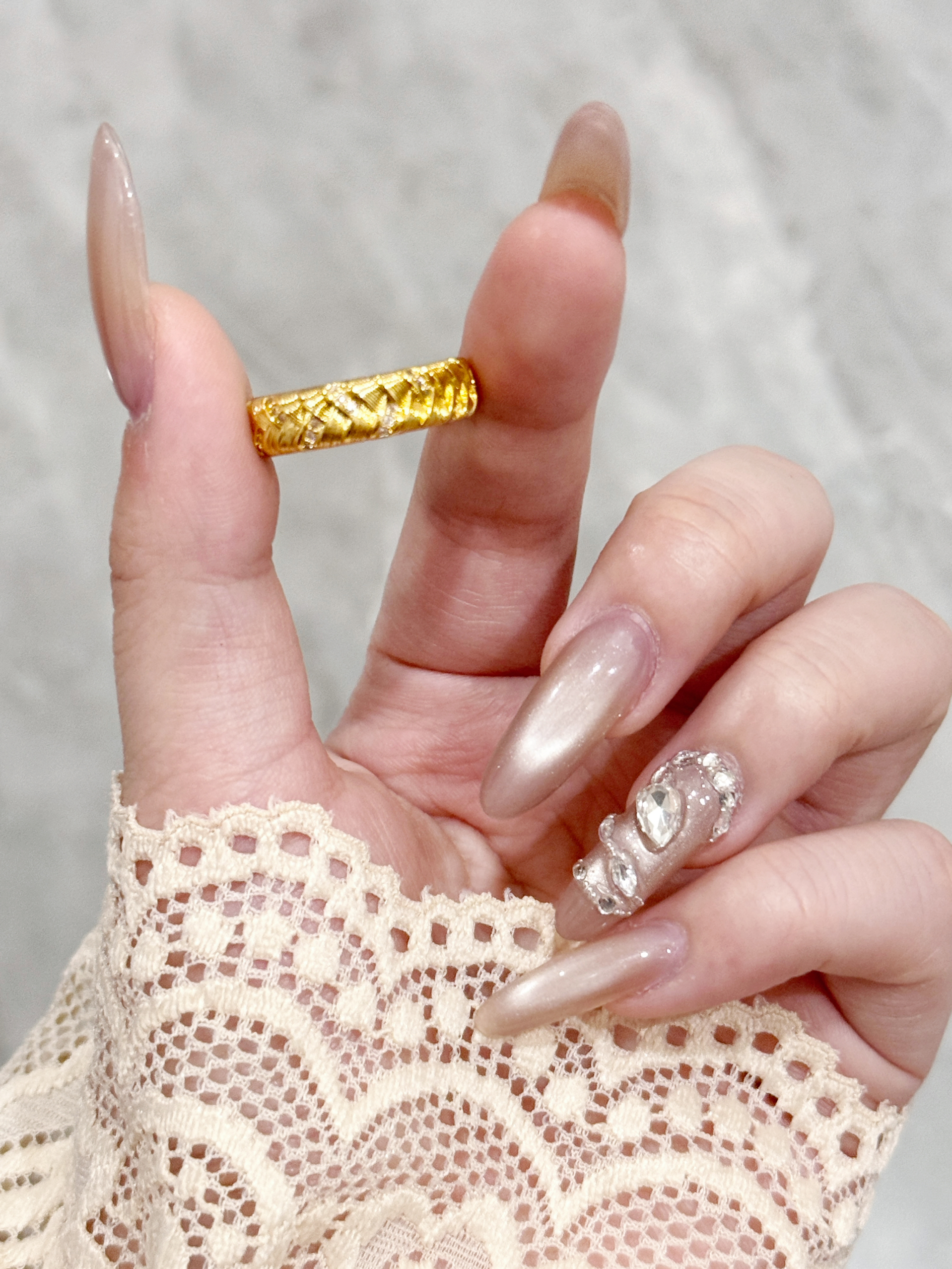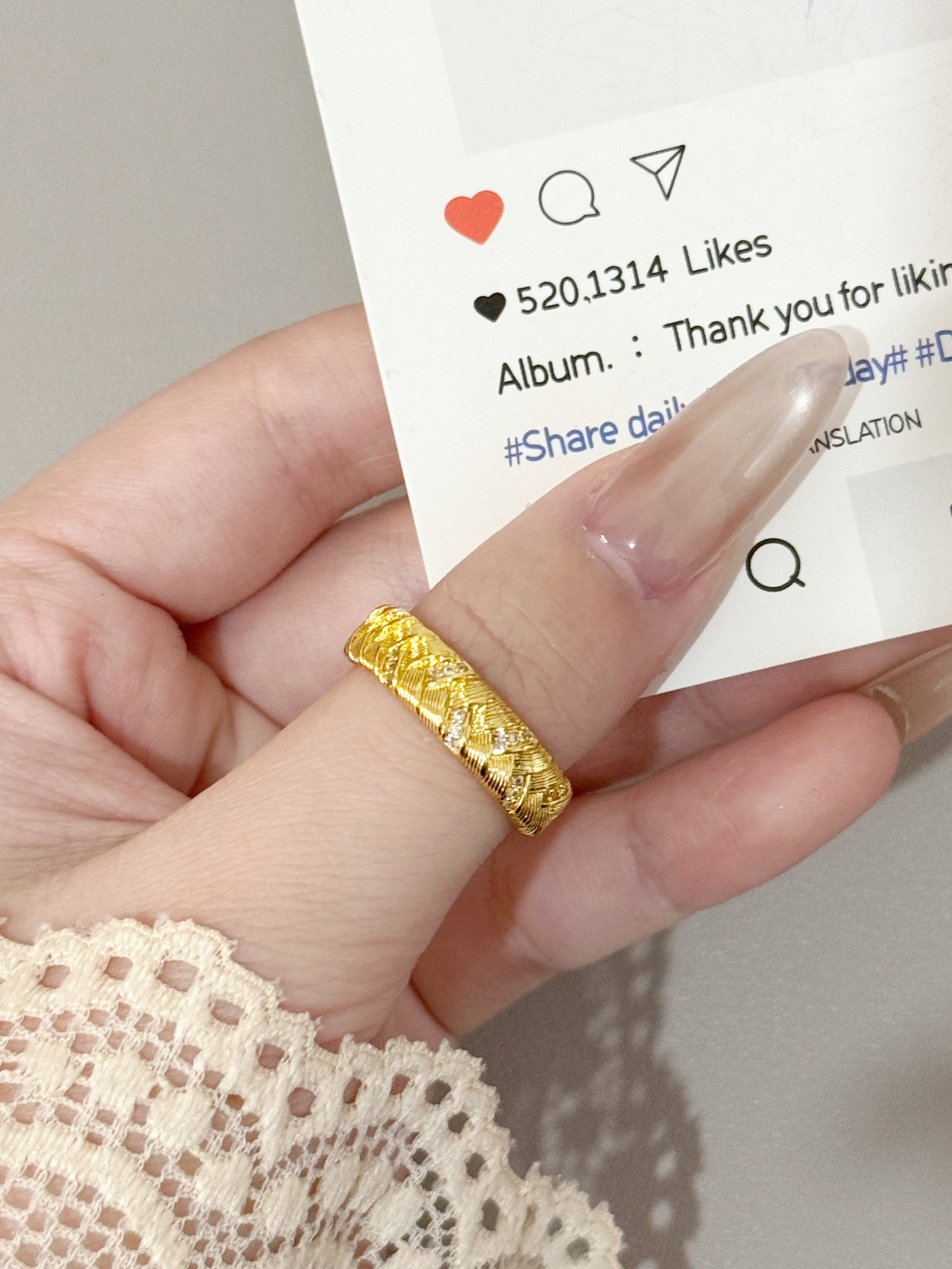 不是刻板的厚重金饰,是带着手工纹理的松弛感—— 像把细碎的光编进纹路里,戴在手上是低调的闪,却又藏不住质感的暖。 配裸色美甲是精致,搭蕾丝袖口是温柔,日常抬手时的光泽,比刻意的华丽更戳人。 不用等特殊日子,这枚戒指就是给生活的小点缀: 把“贵气”揉成日常,让每一次抬手都有细碎的欢喜~