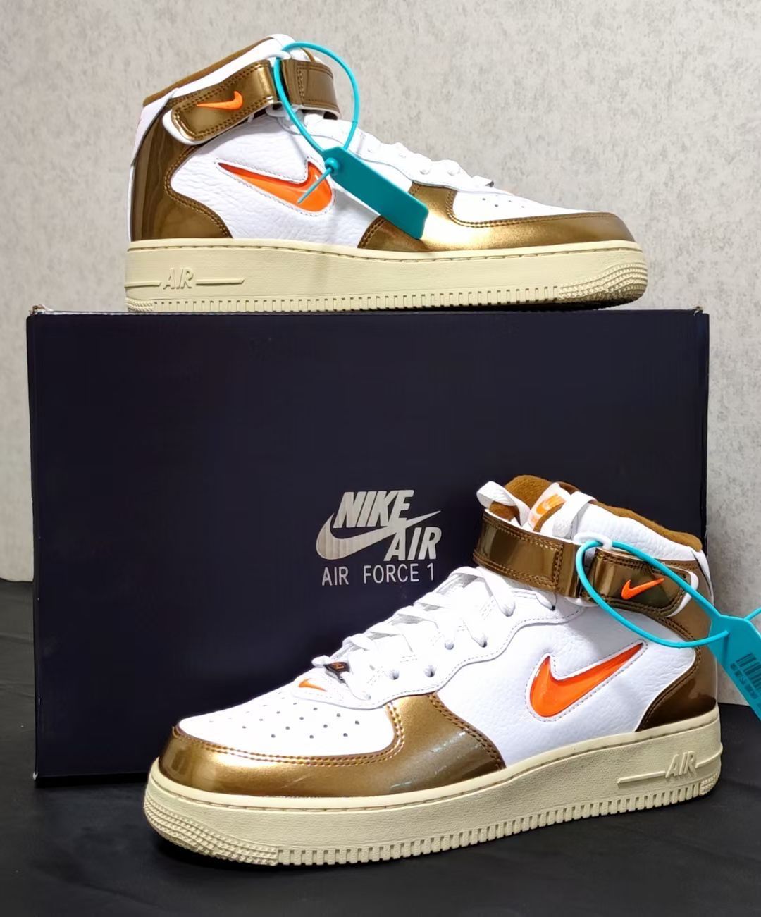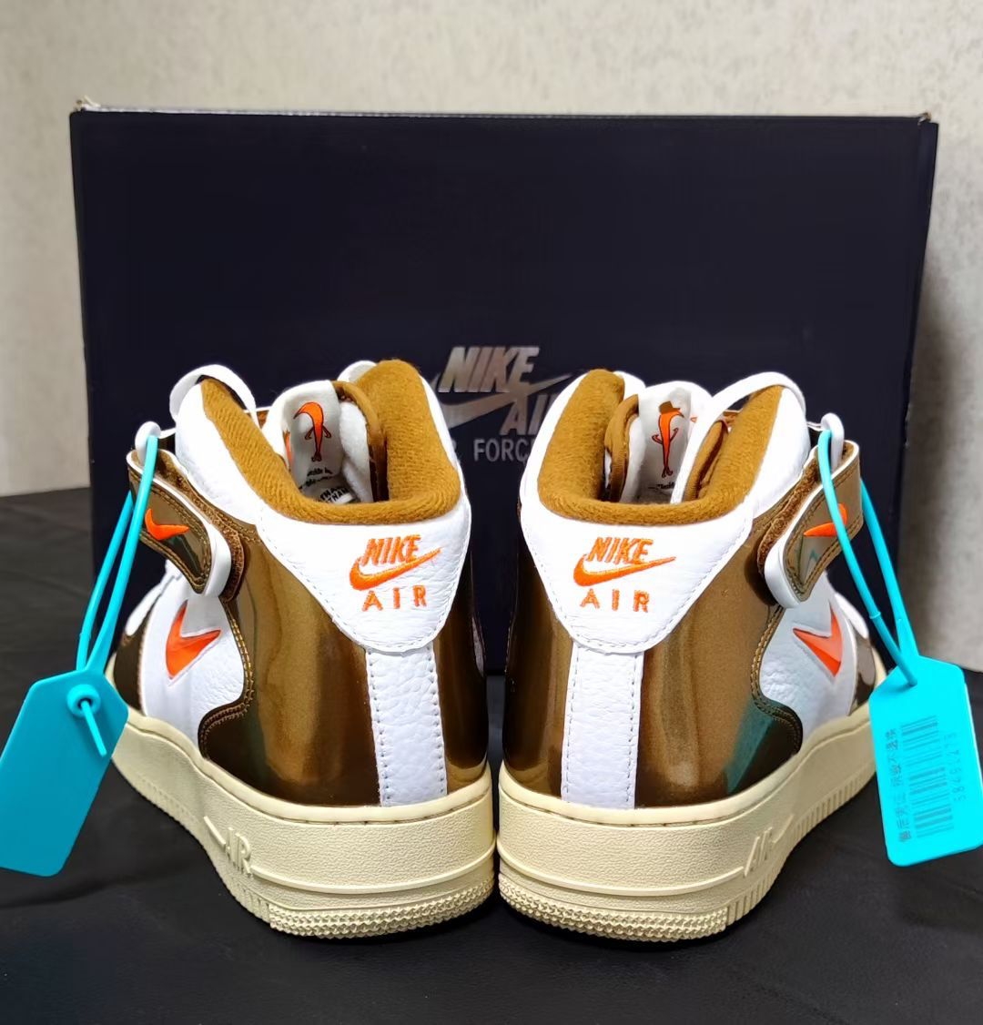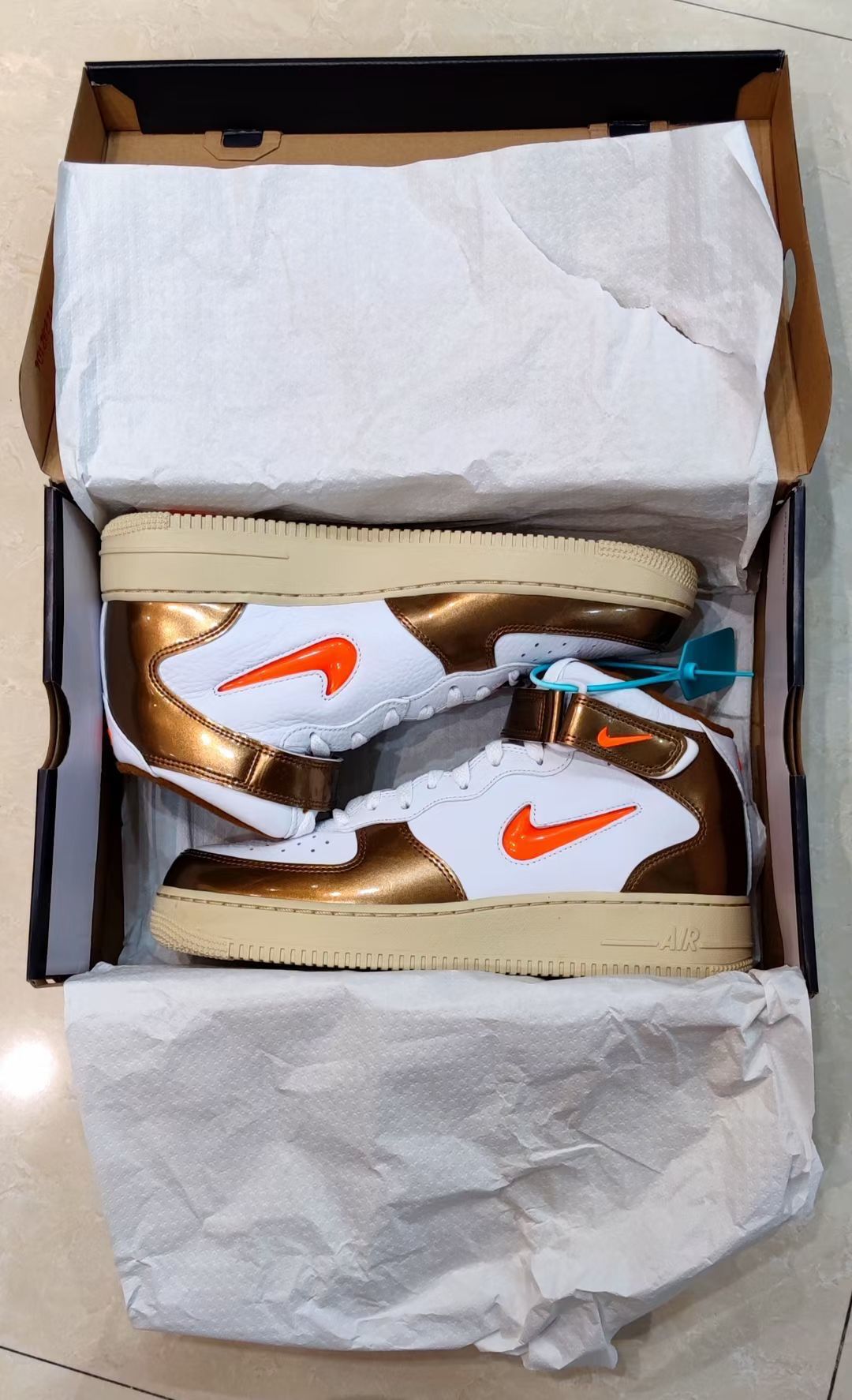 Nike Air Force 1 空军中帮板鞋评测 配色:白/金棕/橙 | 尺码:43码 | 款式:中帮 外观设计:复古高级感,细节拉满 这双AF1以白色皮革为基础,鞋头、鞋帮及侧身拼接金棕色光面皮革,搭配亮橙色Swoosh标志,整体色调复古又不失活力。金色部分在不同光线下呈现细腻光泽,与白色鞋面形成层次感。中帮版型兼顾脚踝包裹性与穿搭灵活性,鞋舌、后跟的“NIKE AIR”标识以橙色点缀,...