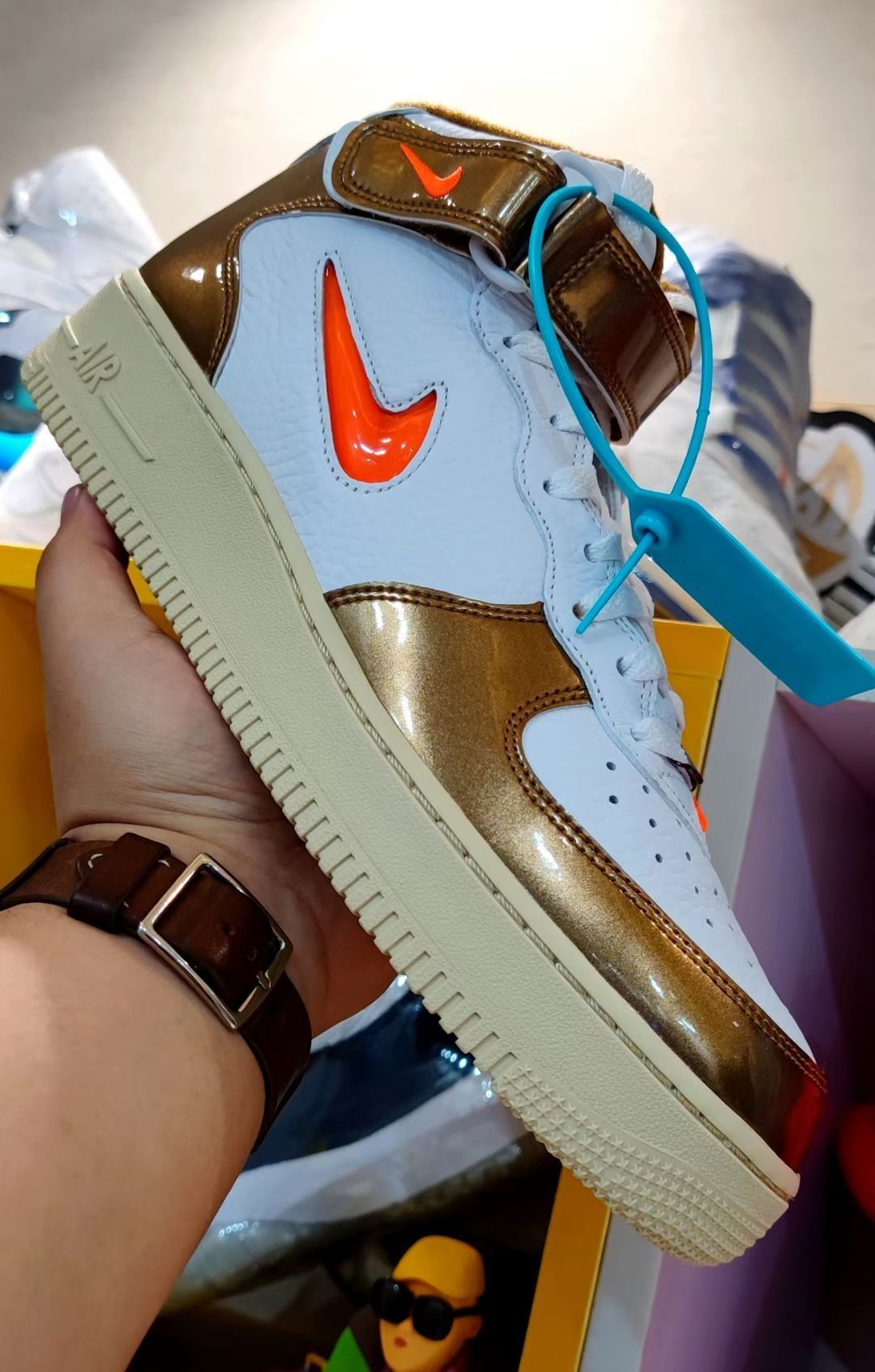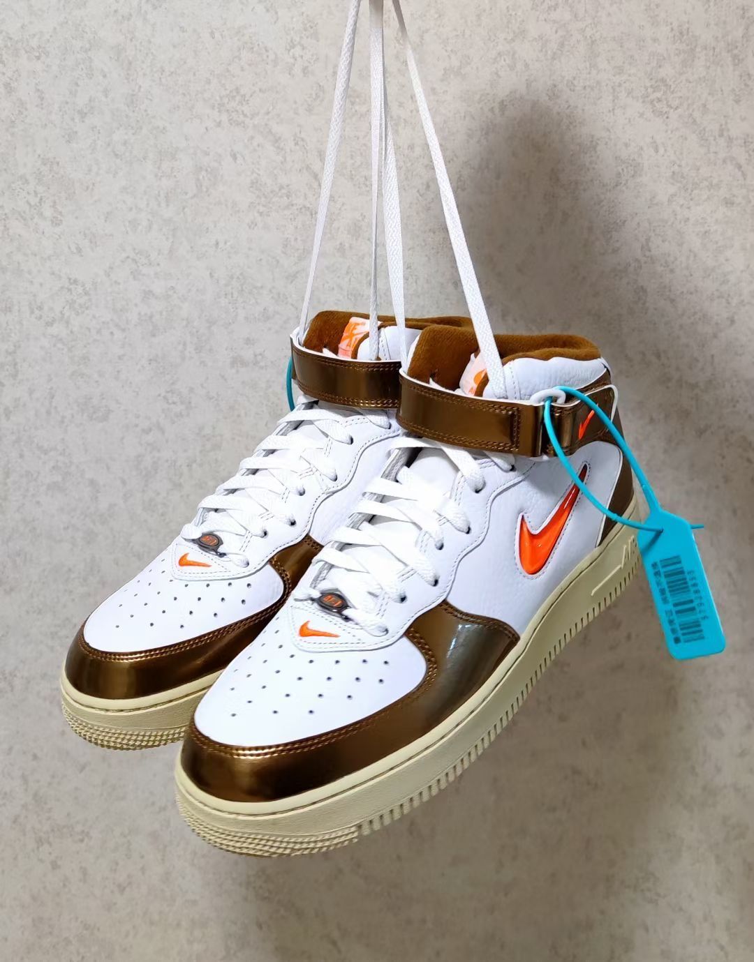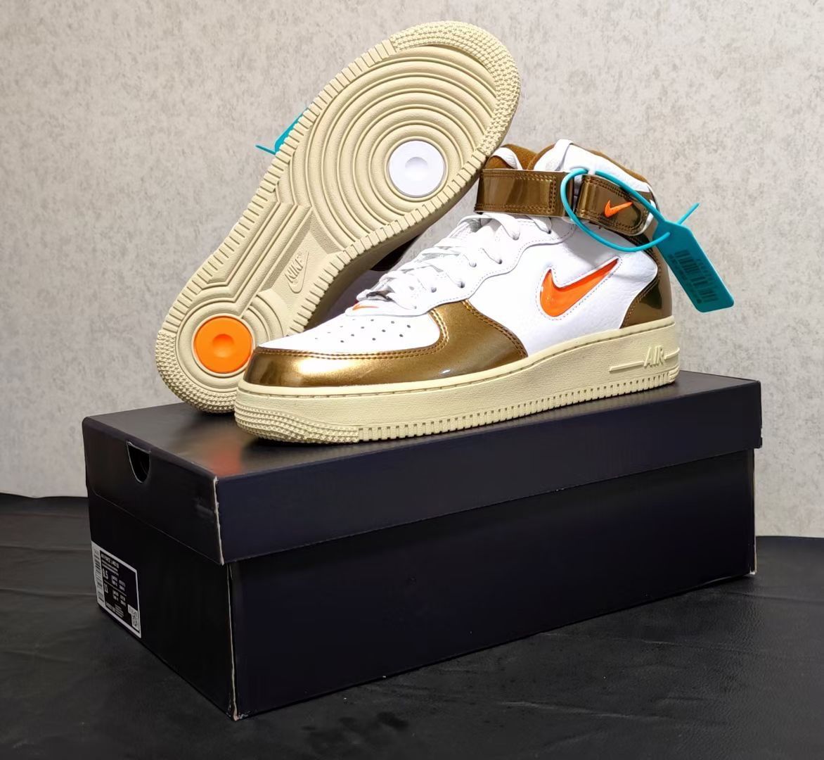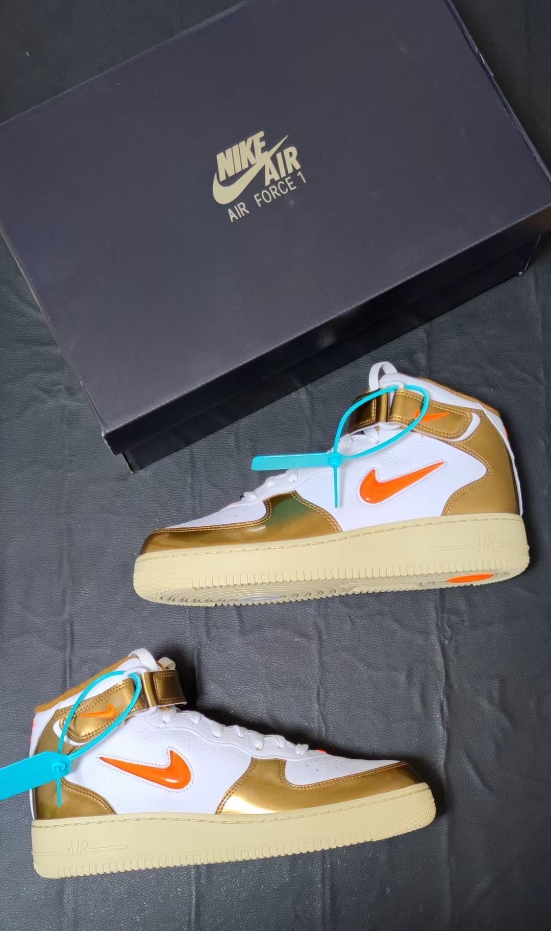 Nike Air Force 1 空军中帮板鞋评测 配色:白/金棕/橙 | 尺码:43码 | 款式:中帮 外观设计:复古高级感,细节拉满 这双AF1以白色皮革为基础,鞋头、鞋帮及侧身拼接金棕色光面皮革,搭配亮橙色Swoosh标志,整体色调复古又不失活力。金色部分在不同光线下呈现细腻光泽,与白色鞋面形成层次感。中帮版型兼顾脚踝包裹性与穿搭灵活性,鞋舌、后跟的“NIKE AIR”标识以橙色点缀,...