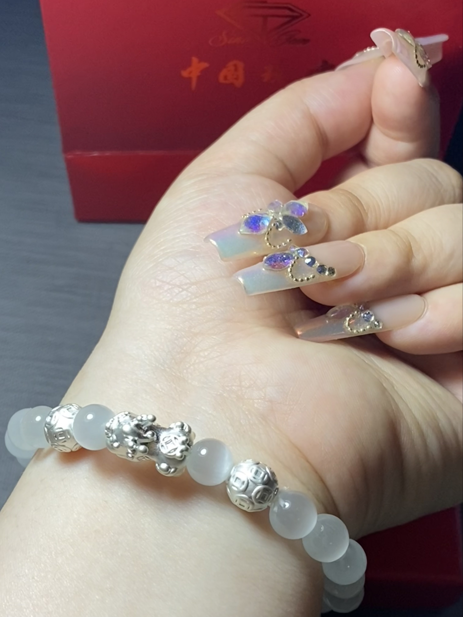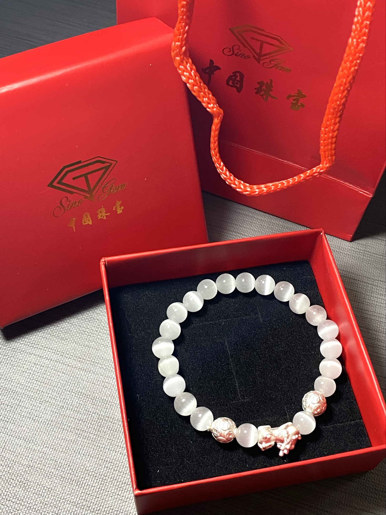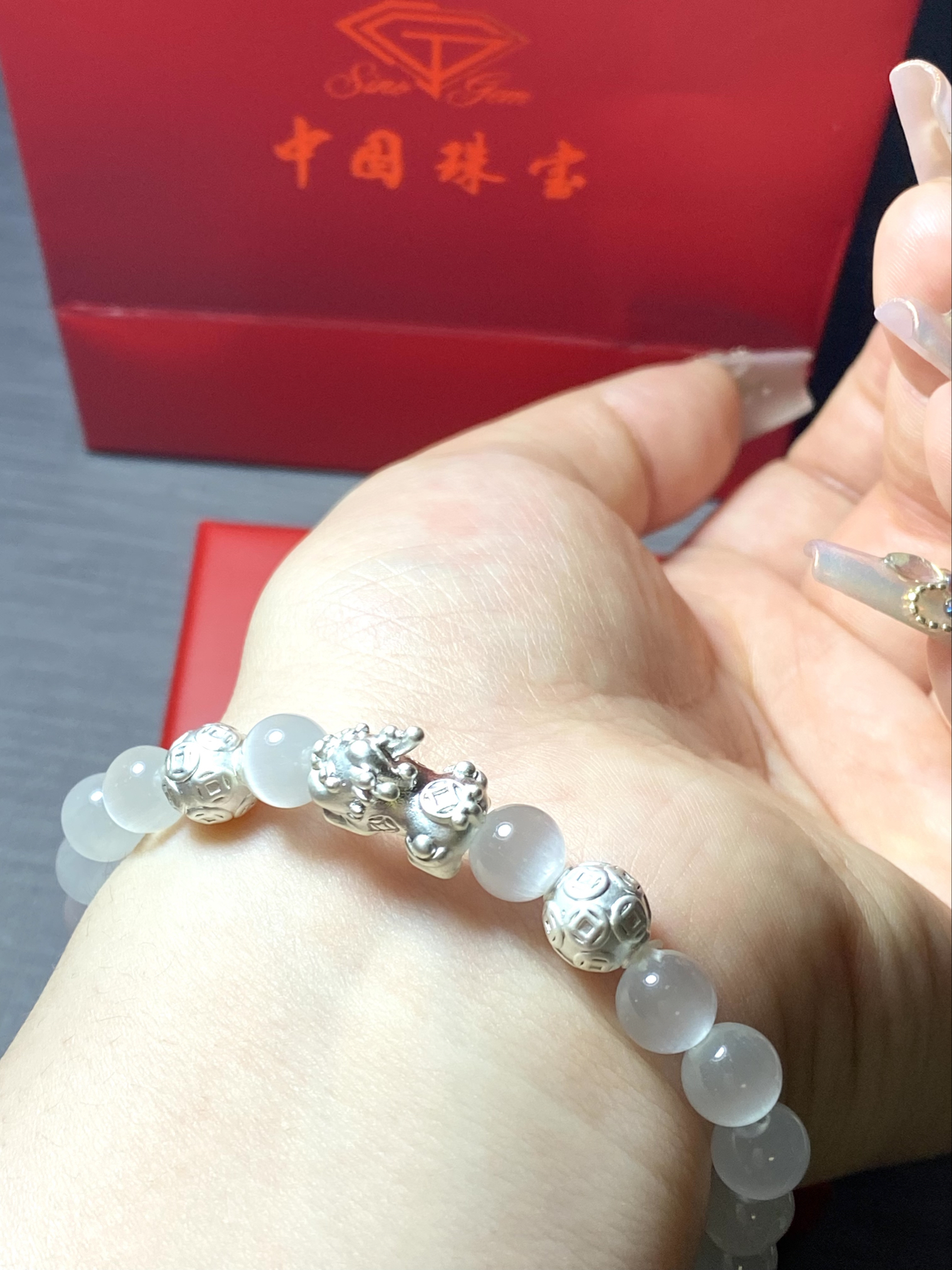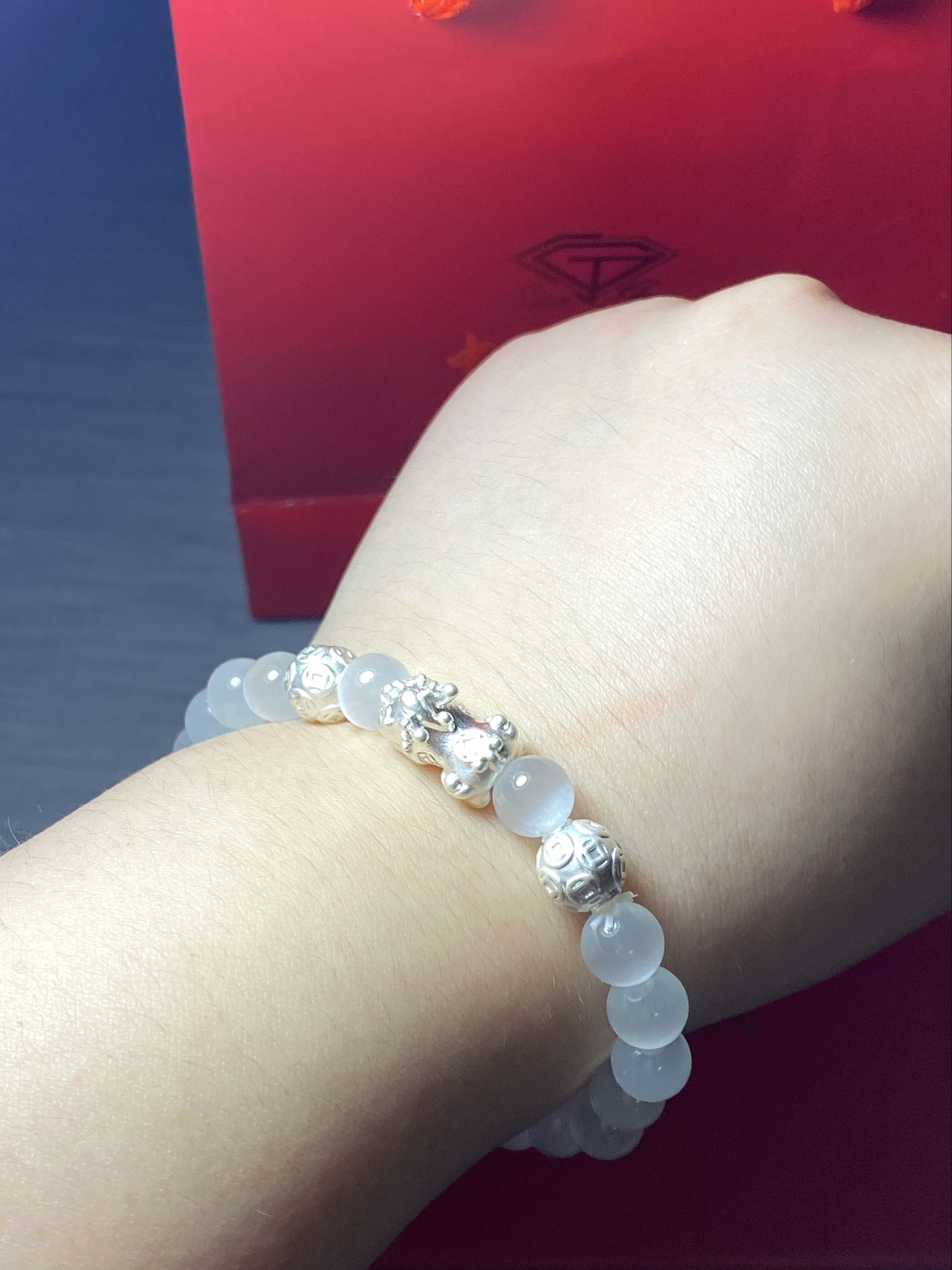 双十一入手了 中国珠宝 家的这款貔貅手串 搭配小裙子也很好看 拿到实物后感觉很喜欢 貔貅雕刻很精美 银珠上还有雕刻的小铜板 感觉很精致 手串上的猫眼转运珠在灯光下看起来 金莹剔透 特别纯净 作为情侣手串很合适 戴在手上也很显白 很有气质的感觉国风感满满 还有小礼盒 很大气