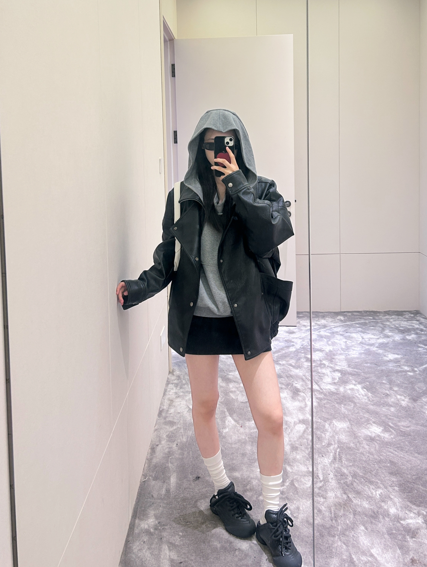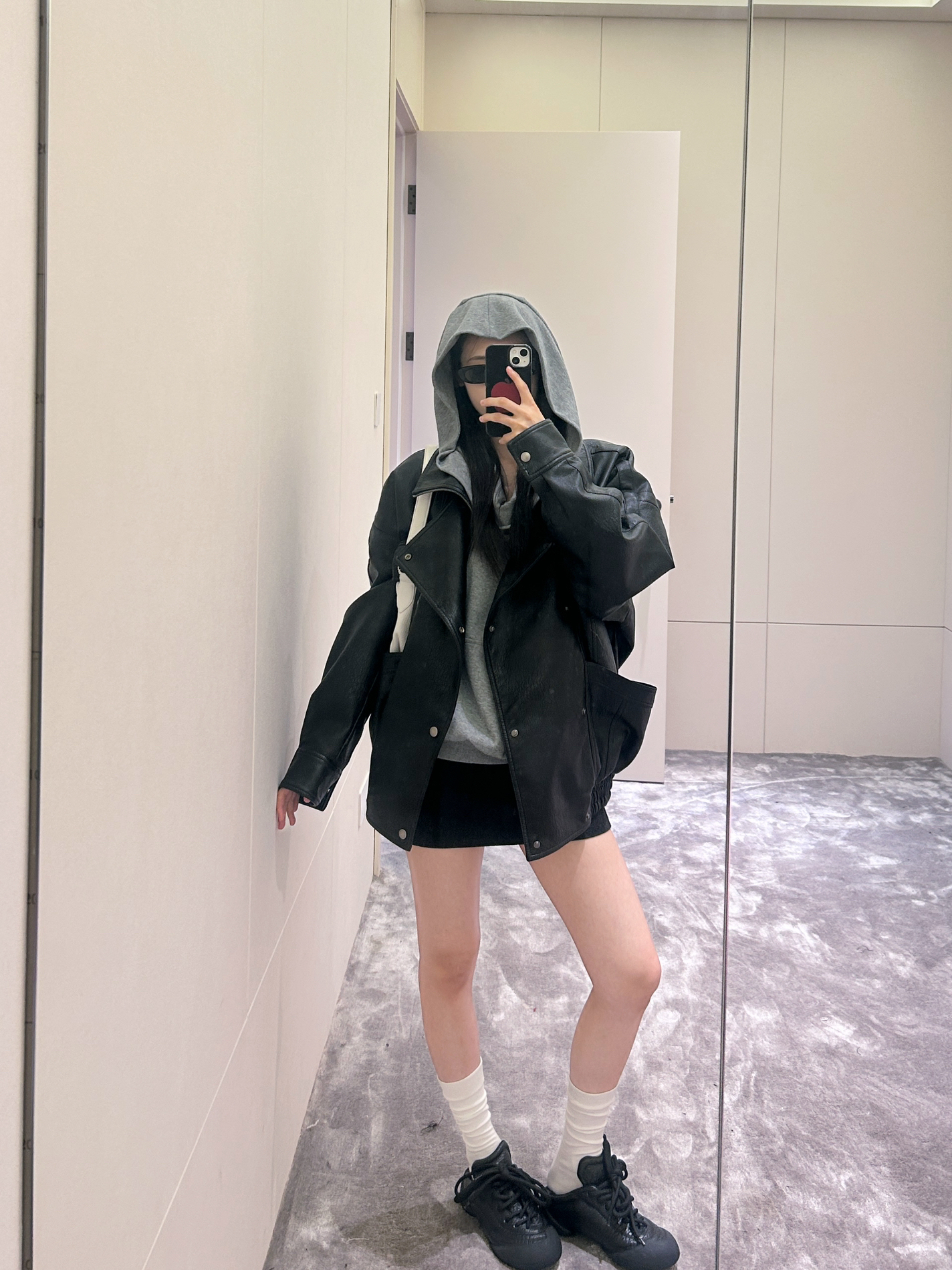 版型宽松不压个子,内搭灰连帽卫衣, 甜酷感直接拉满~ 下装搭黑皮裙+堆堆袜+黑球鞋,甜辣又舒服, 挎个白包提亮,出门戴个墨镜, 回头率直接翻倍,是那种“又帅又甜”的穿搭~