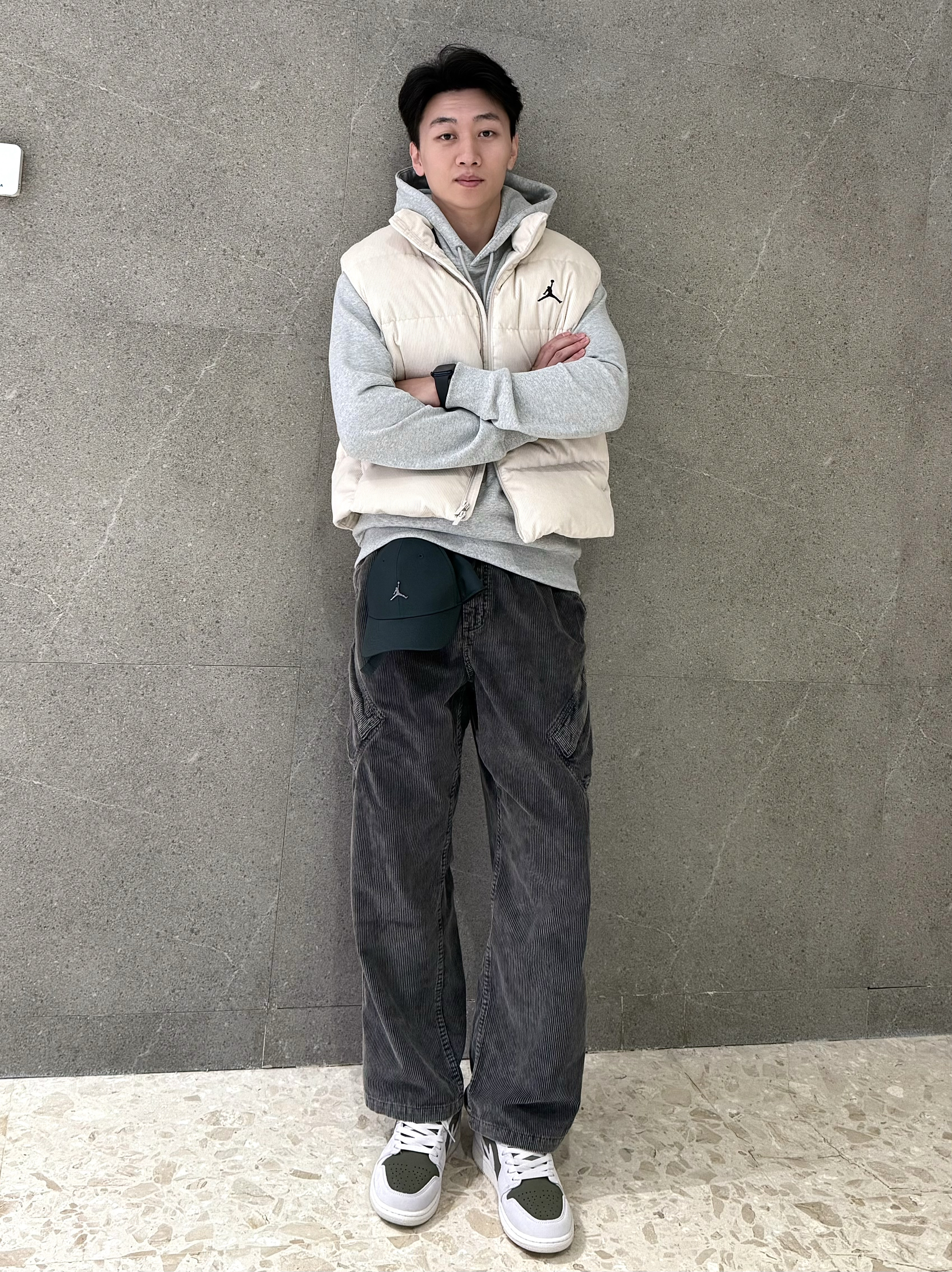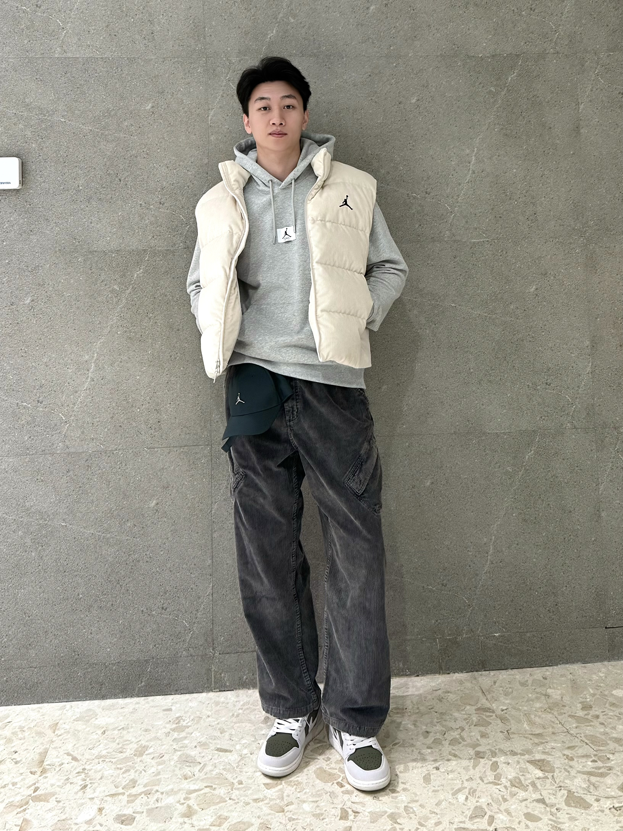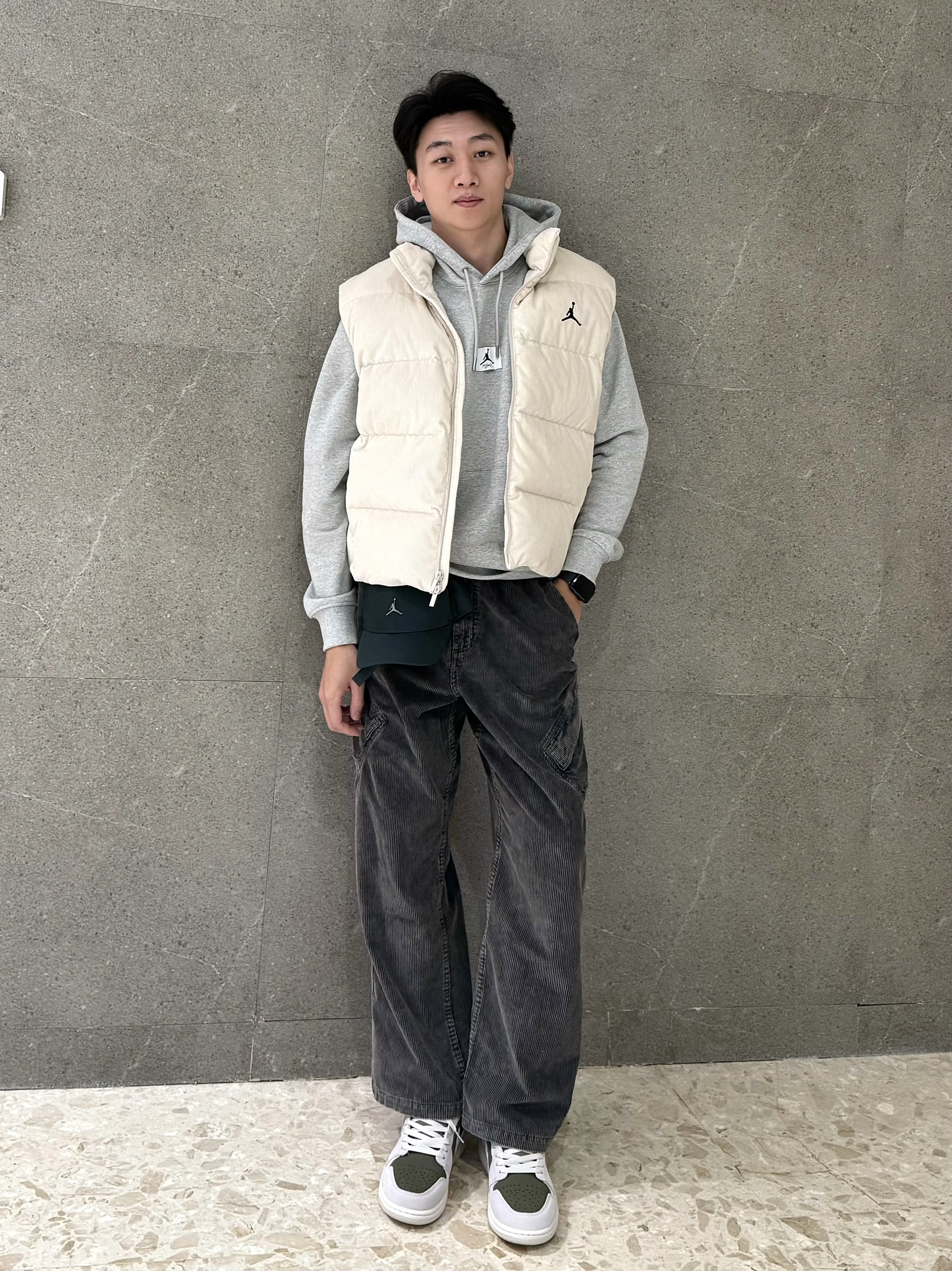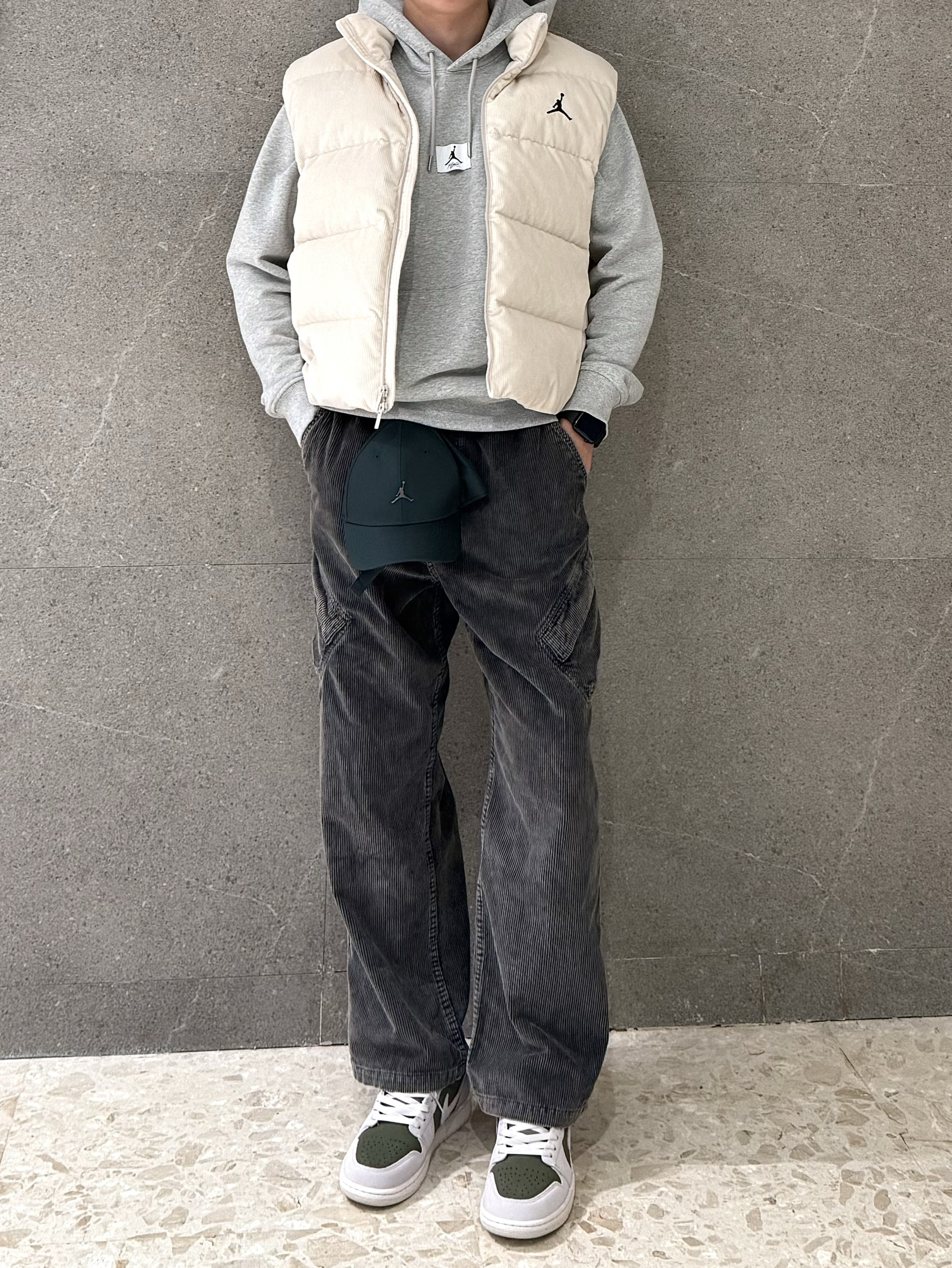 灯芯绒材质太适合秋冬季节啦!这个材质会给人一种很温暖舒适的感觉~ Jordan这一季推出的灯芯绒套装不要太好搭,整体的搭配思路是黑白灰经典的配色,灯芯绒裤子是直筒的版型,可以很好的修饰腿型!