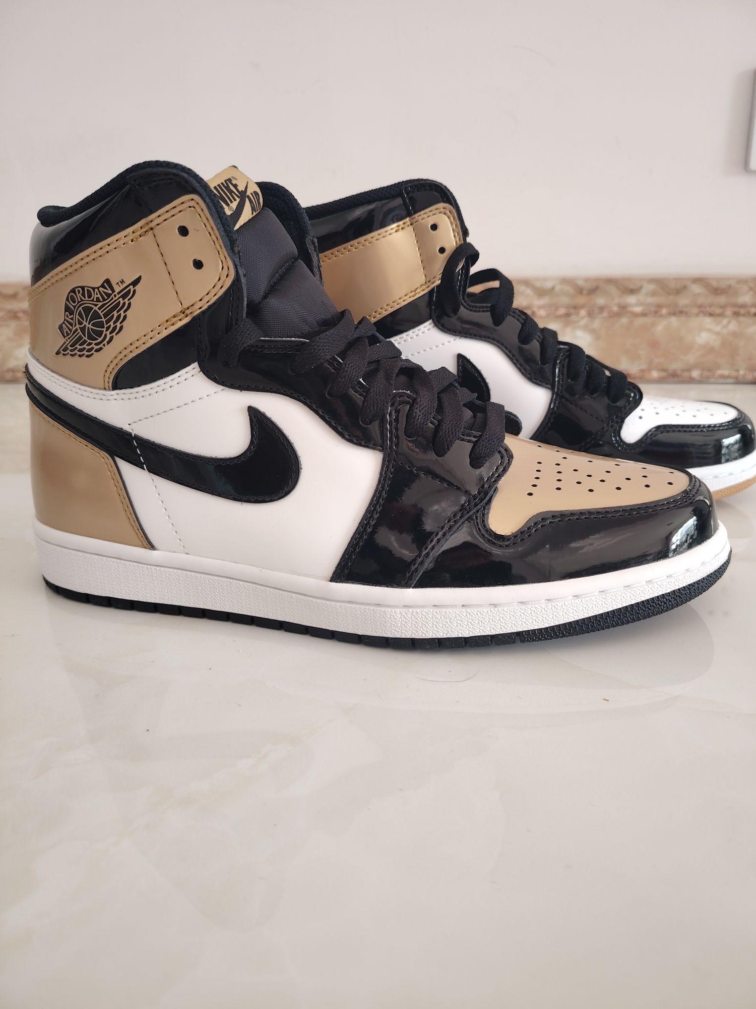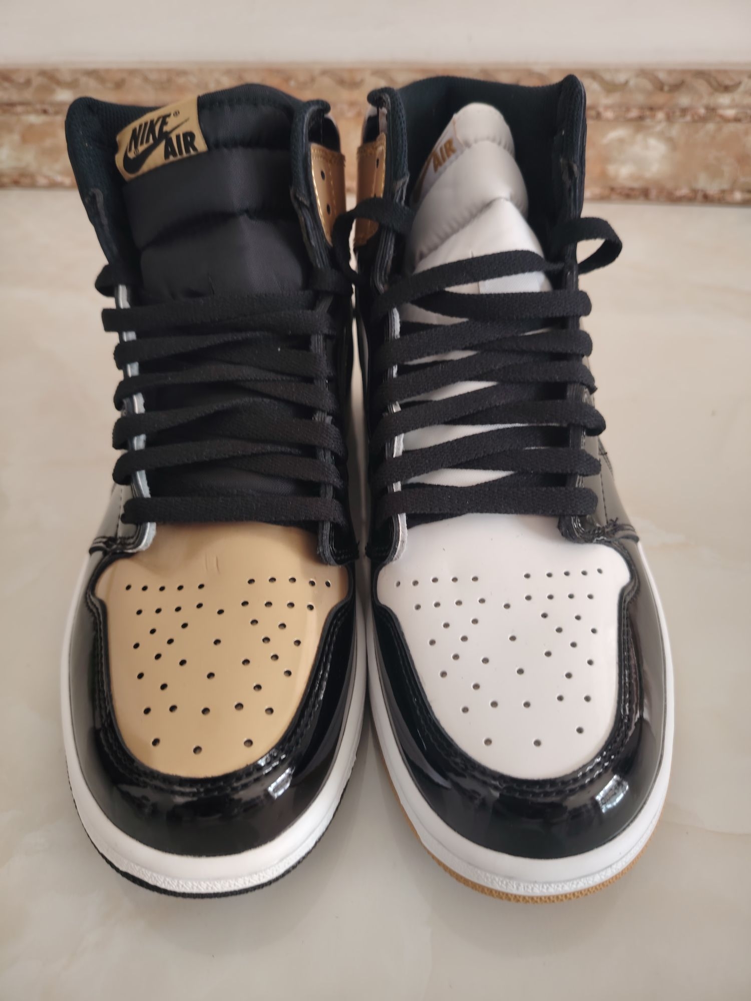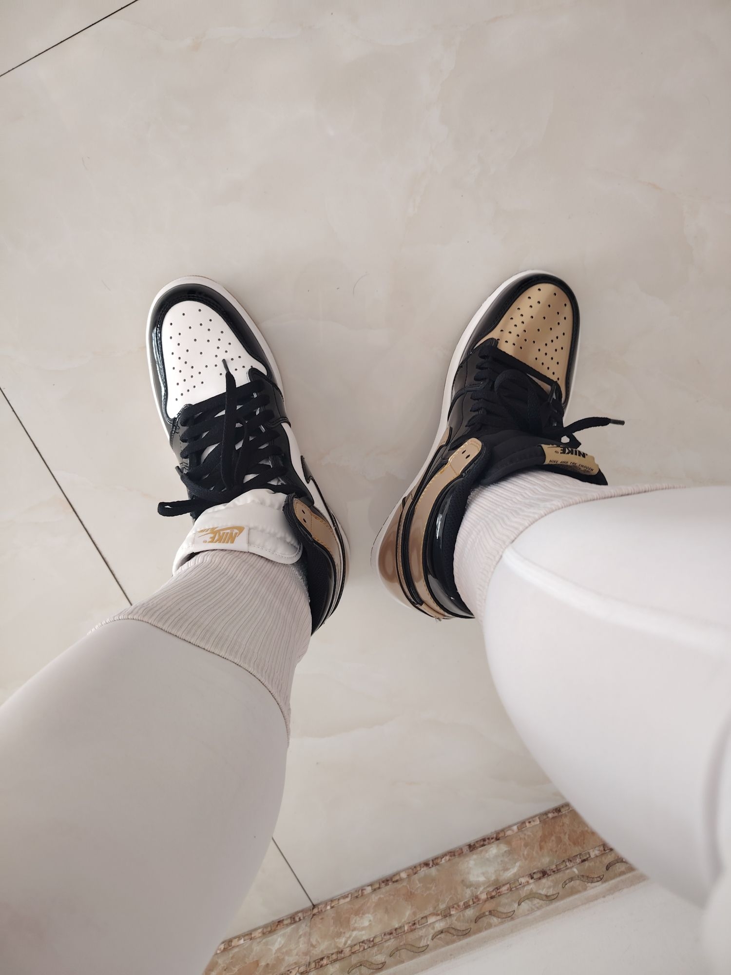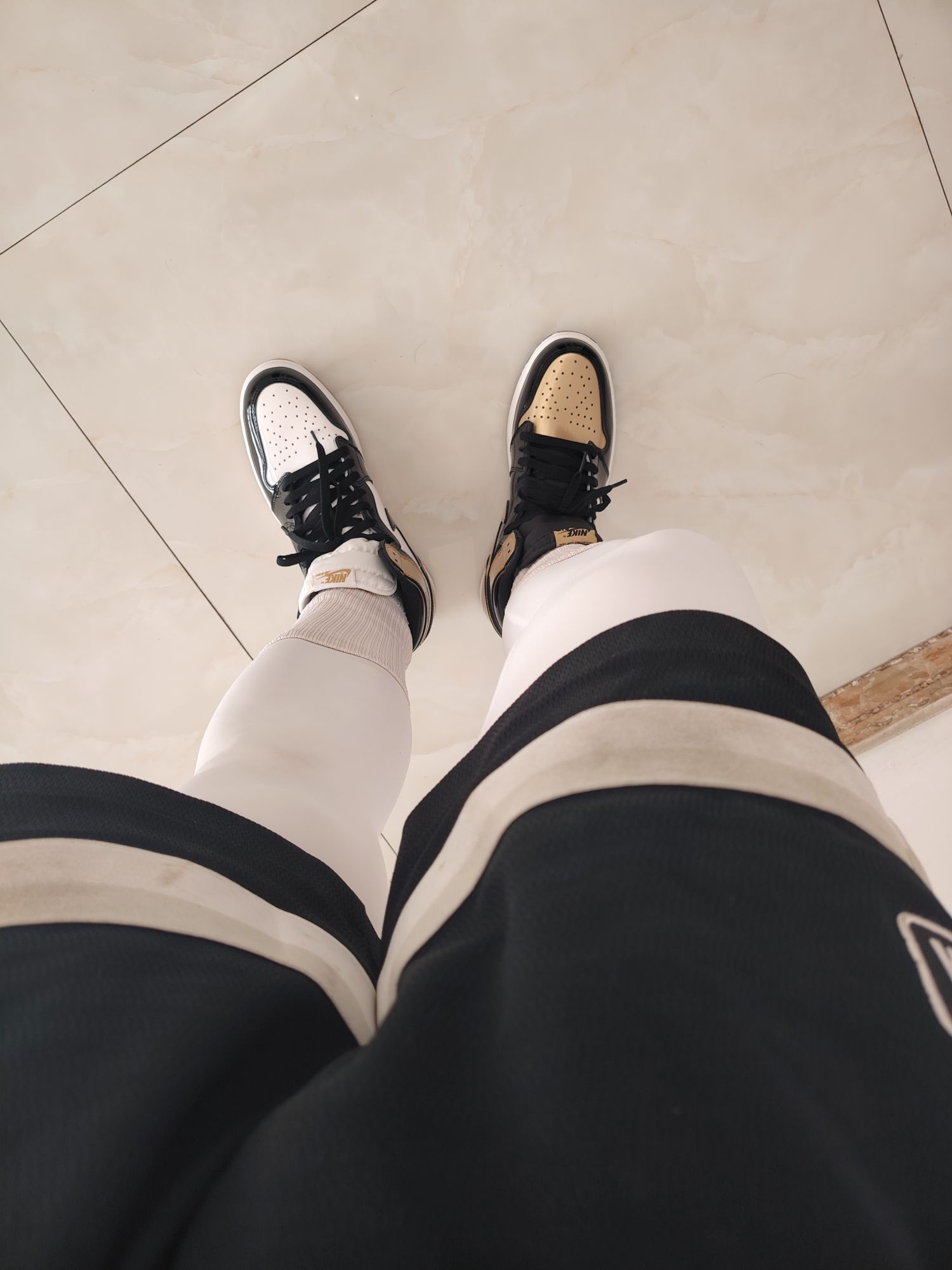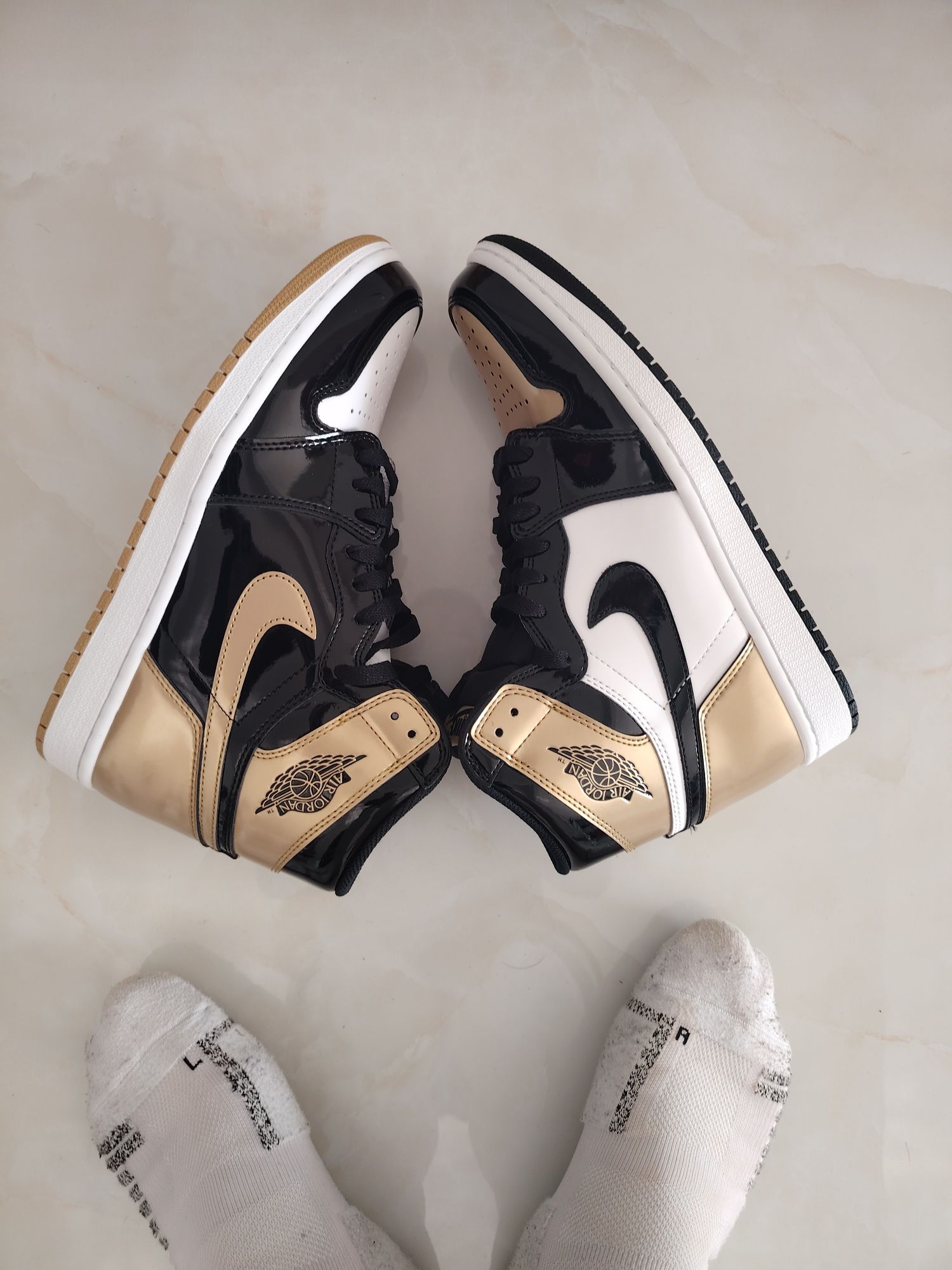 拿到手里的时候金光闪闪亮晶晶的,真的是好看。鞋子采用黑白金三个简约又气质不凡的色调相互搭配,并注入漆皮材质提升豪华质感,鞋身内外两侧分以两种不同装扮的姿态呈现,帅气非凡!非常百搭,我就没见过AJ1不可以搭的东西,aj的脚感还是很不错的,不多说,喜欢的兄弟可以冲!#我的宝藏AJ分享 #挺好的一款AJ黑金 #AJ1黑金脚趾