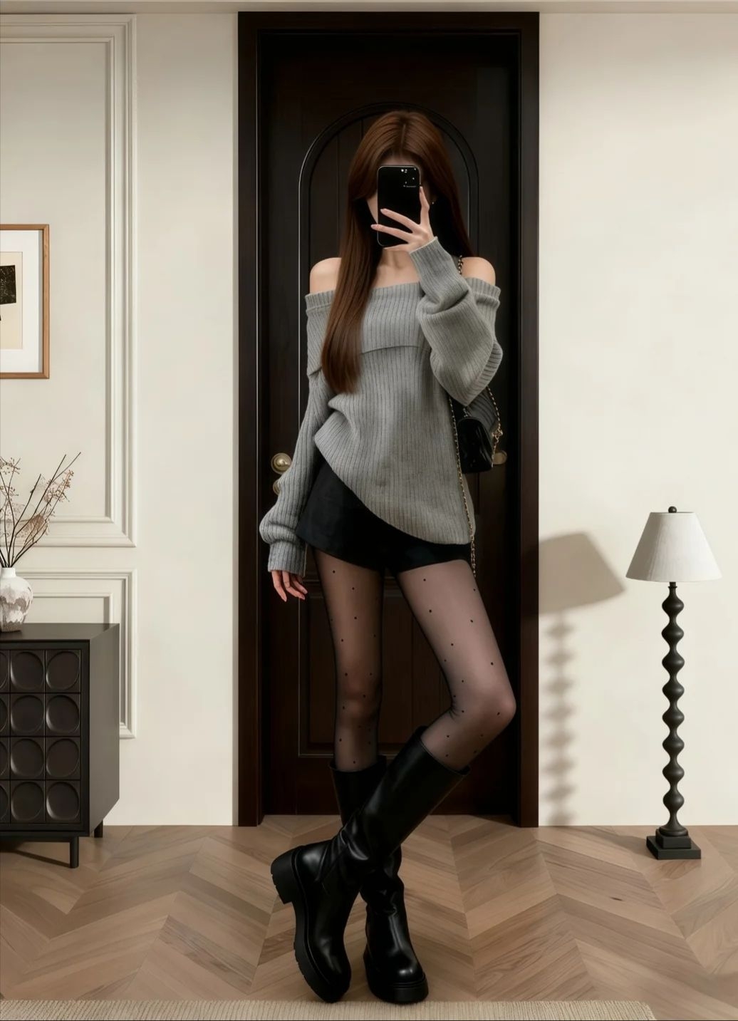 #元气秋冬暖出型 这组穿搭太戳秋冬氛围感!露肩灰毛衣+波点袜+厚底靴,慵懒又带点甜酷,随手拍都出片~#晒晒你的秋冬慵懒毛衣穿搭 #慵懒氛围感宝藏毛衣 #宝藏毛衣分享穿搭 #晒晒酷飒女孩的宝藏毛衣
