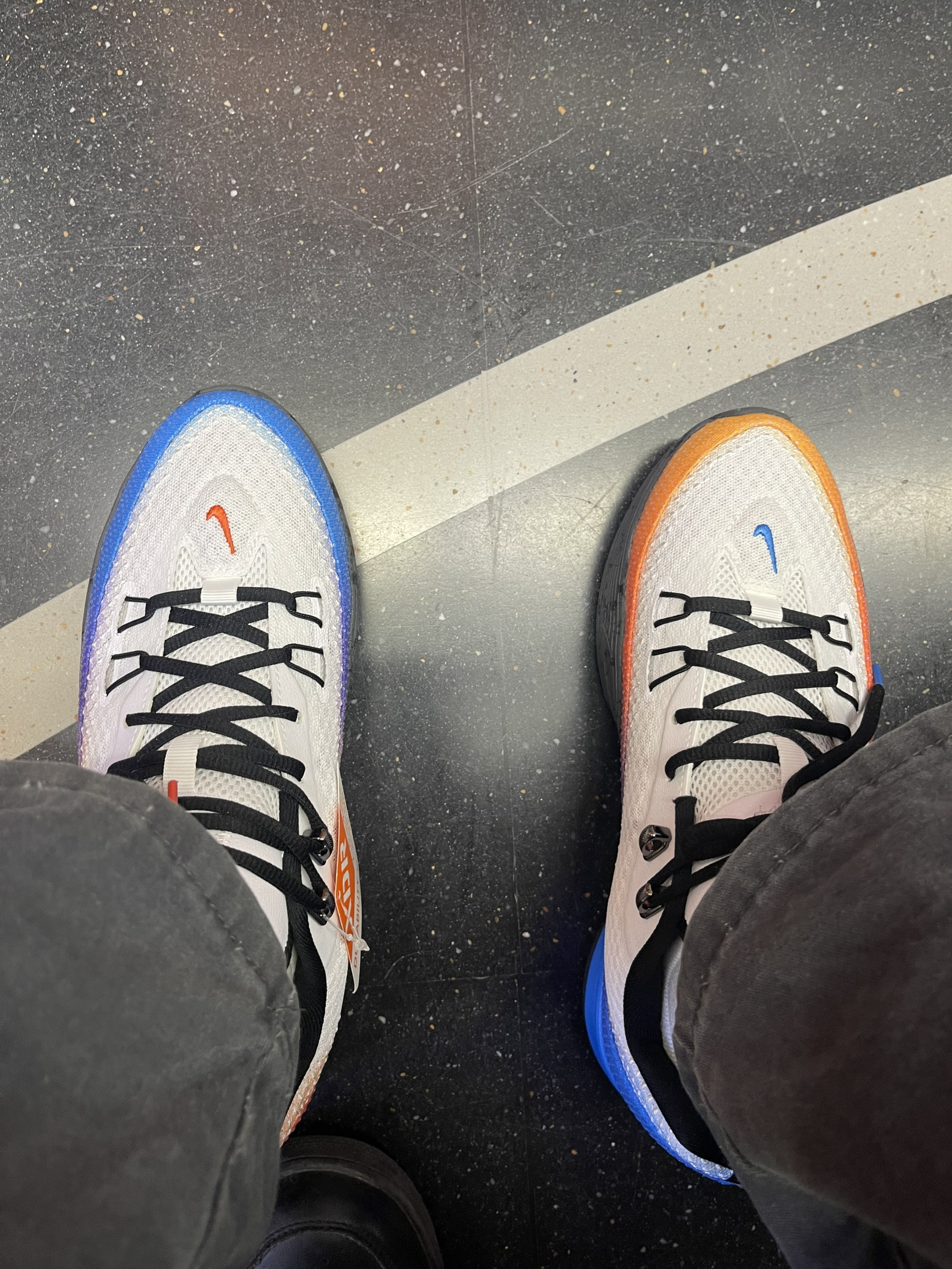 Nike S.T. Flare 白蓝橙,男女穿都挺搭上脚第一感受很舒服前掌气垫撑着感觉太舒服了!!! 1、优点:上脚能感觉到前掌回弹,后掌缓震也是实实在在的,外底纹路扎实,耐磨是没问题的,在室内试了一下,抓地挺给劲儿,防侧翻加宽了点,很硬实不用担心崴脚啥的 2、缺点也得说:脚踝处包裹感偏中等,脚踝周围会有点松快的感觉,有点摸跟腱 3、适合人群:更适合主打灵活走位、体重中等的选手~ 4、...