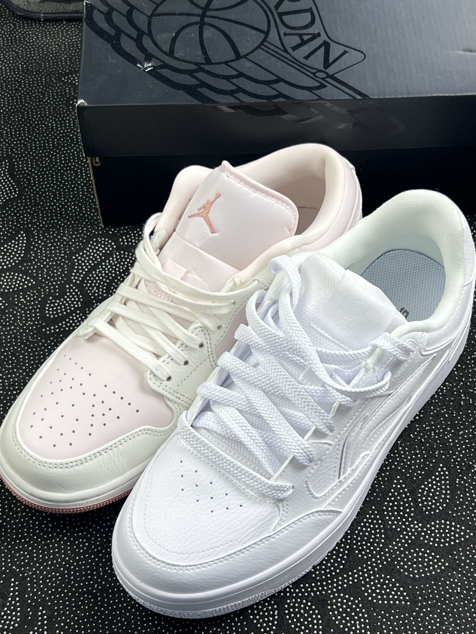 左边纯白那双,鞋面是软皮的,刚穿前半天脚踝有点磨(可能我脚型偏瘦),但踩下去软度刚好,走路半小时脚底板不会酸。右边粉白那双鞋头透气孔是真的,走快了脚汗能散掉点,但鞋边容易沾灰,昨天踩了点水渍,擦半天还有印子。 鞋底不算薄,矮个子穿能垫点高度,但走路急了有点点晃(没那么跟脚)。鞋带系紧点会好点,不过勒久了脚背有点闷。 日常搭浅色系裤子还行,就是白色那双容易脏,出门得小心点。如果是随便穿穿通勤...