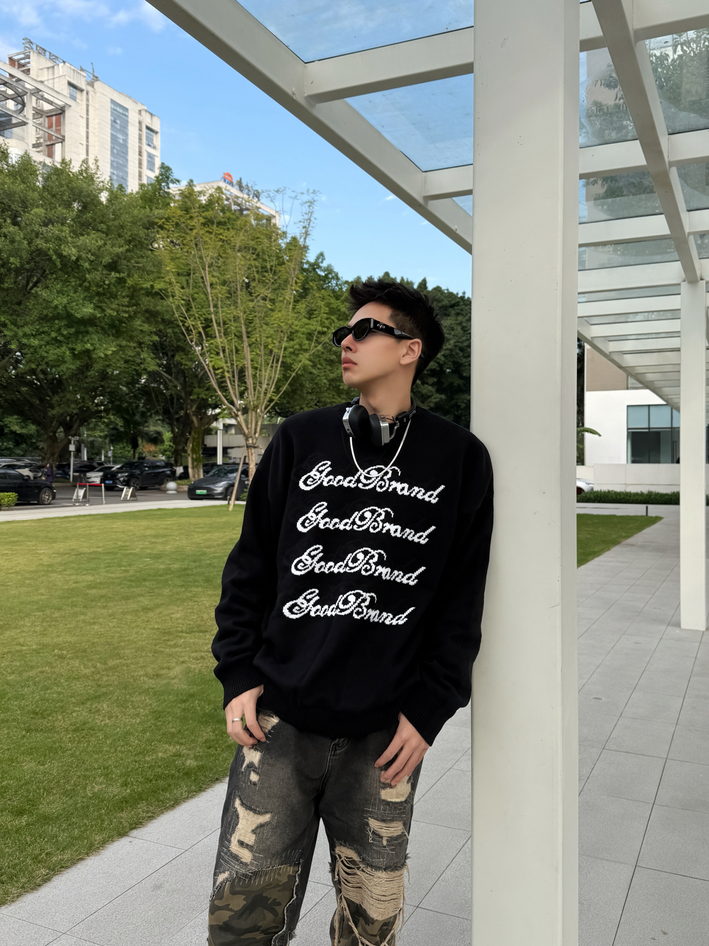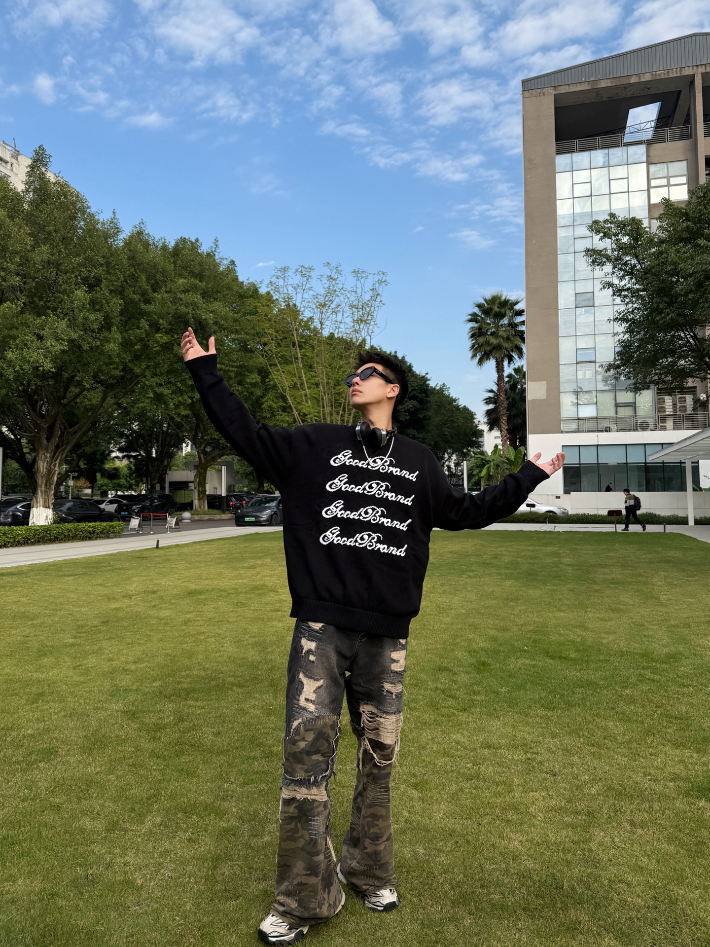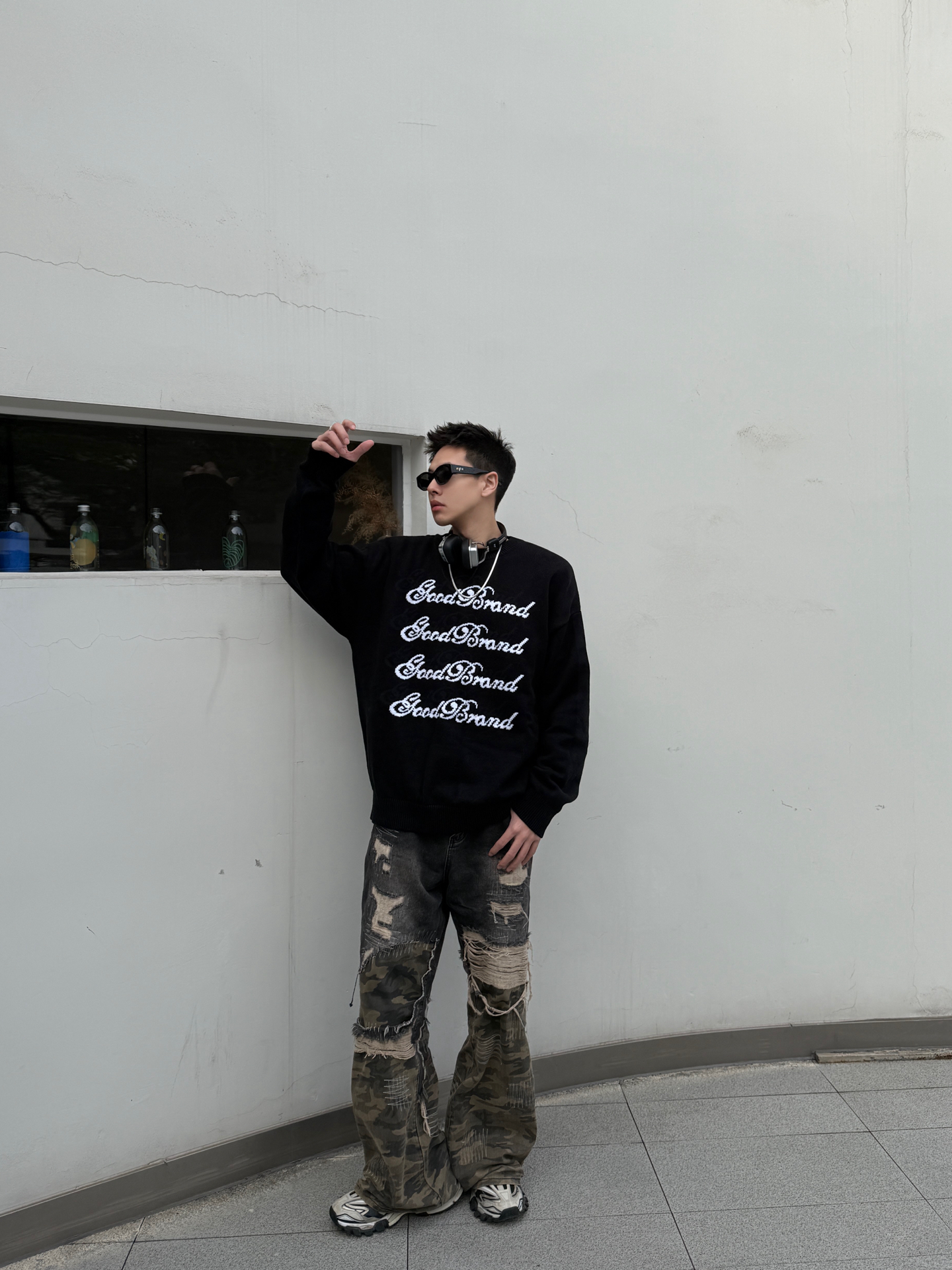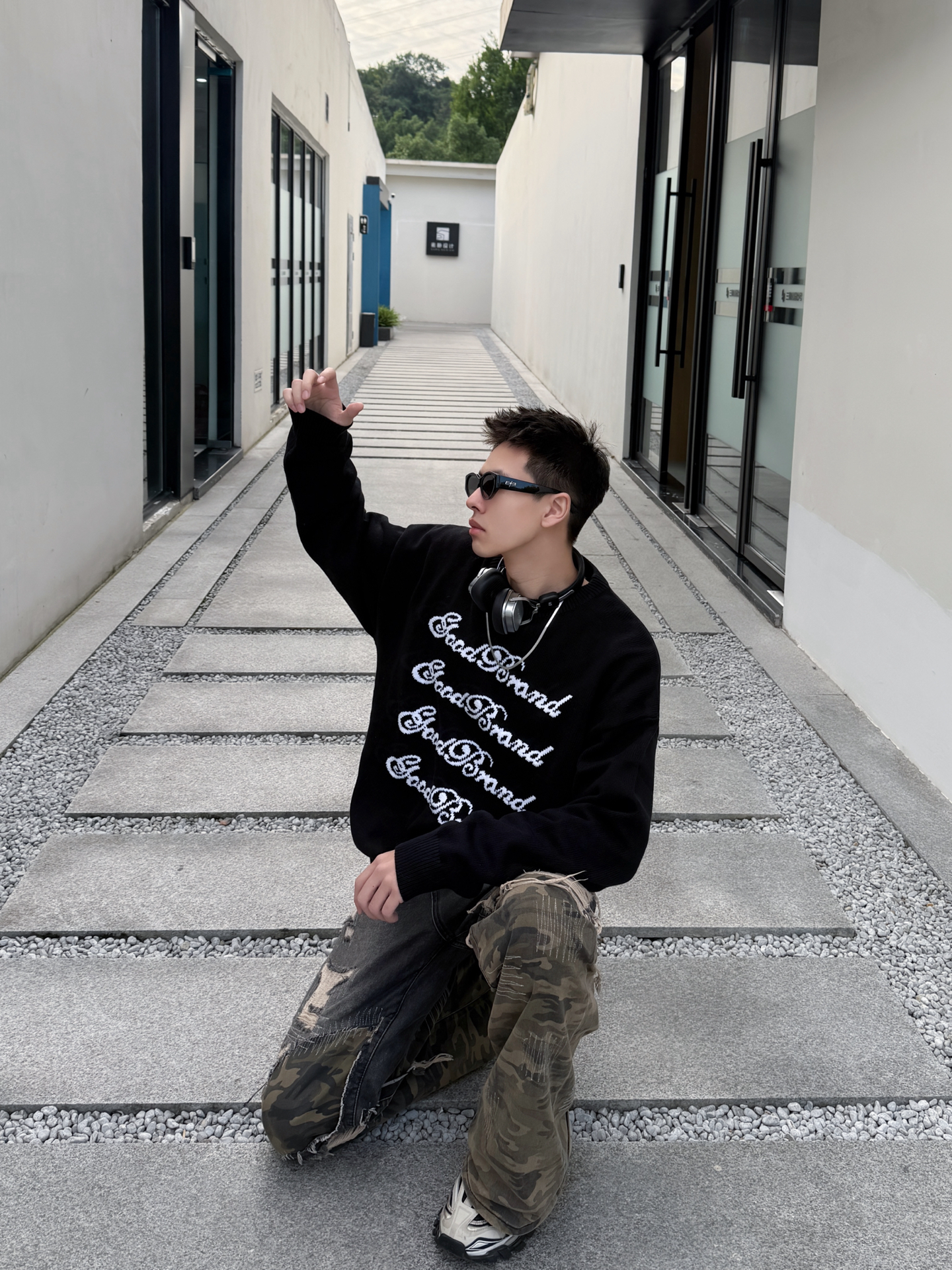 谁懂啊!秋天的毛衣居然能这么搭!GOODBRAND这件黑色字母毛衣+迷彩阔腿裤,直接把街头潮感拉满~ 这件GOODBRAND毛衣质感绝了!黑色底叠印字母设计,美式复古味超浓,面料软乎乎的贴身穿不扎,宽松版型不挑身材,藏肉又显瘦,日常穿舒适感拉满~ 搭配的迷彩阔腿裤太有腔调了!做旧破洞细节自带随性酷感,阔腿版型显腿直又长,和毛衣搭在一起,松弛感与潮感直接焊死,秋日街头出片率满分~ 脚上的拼色老...