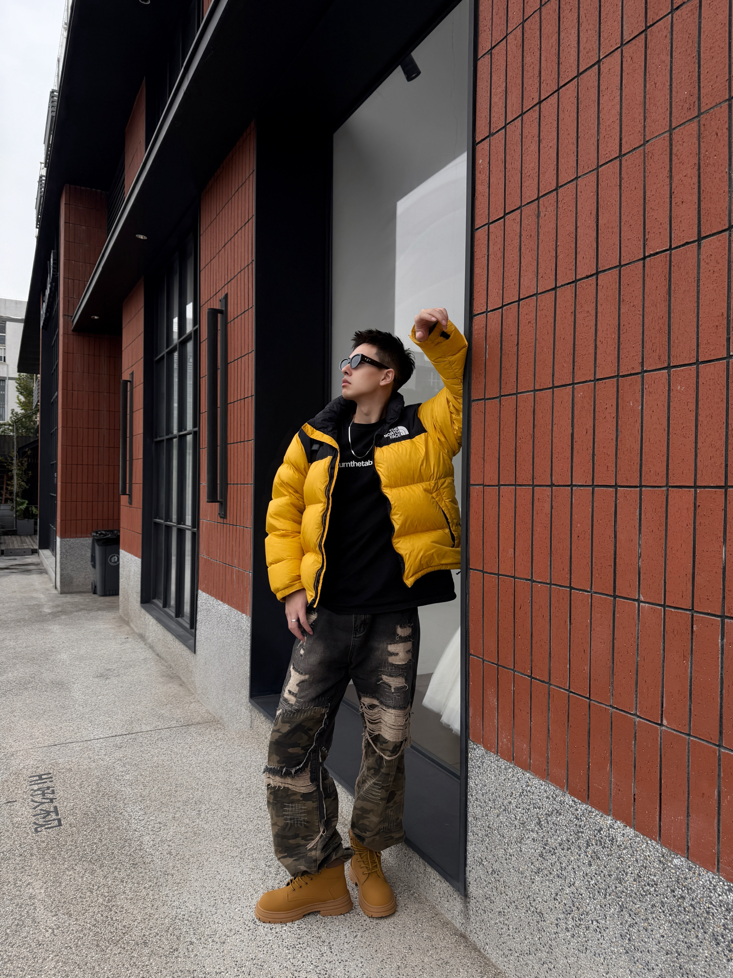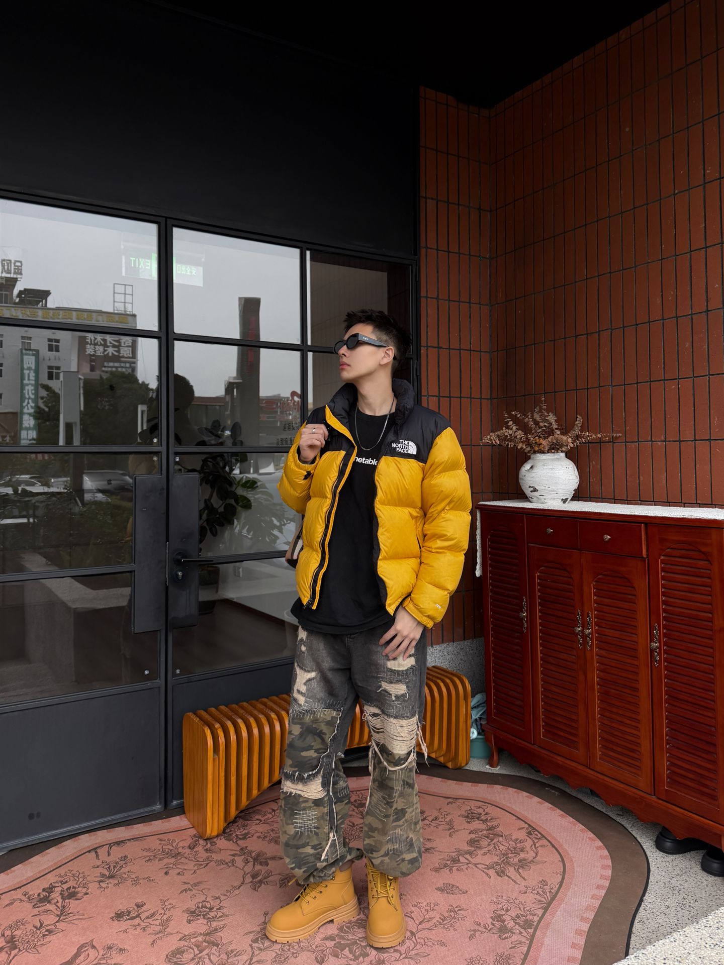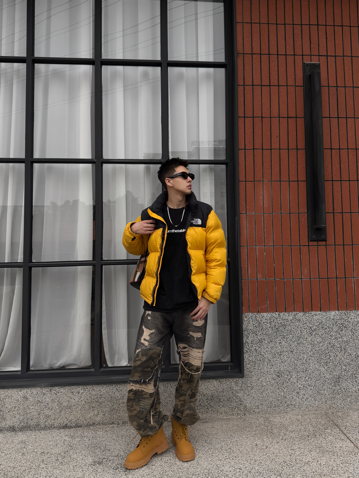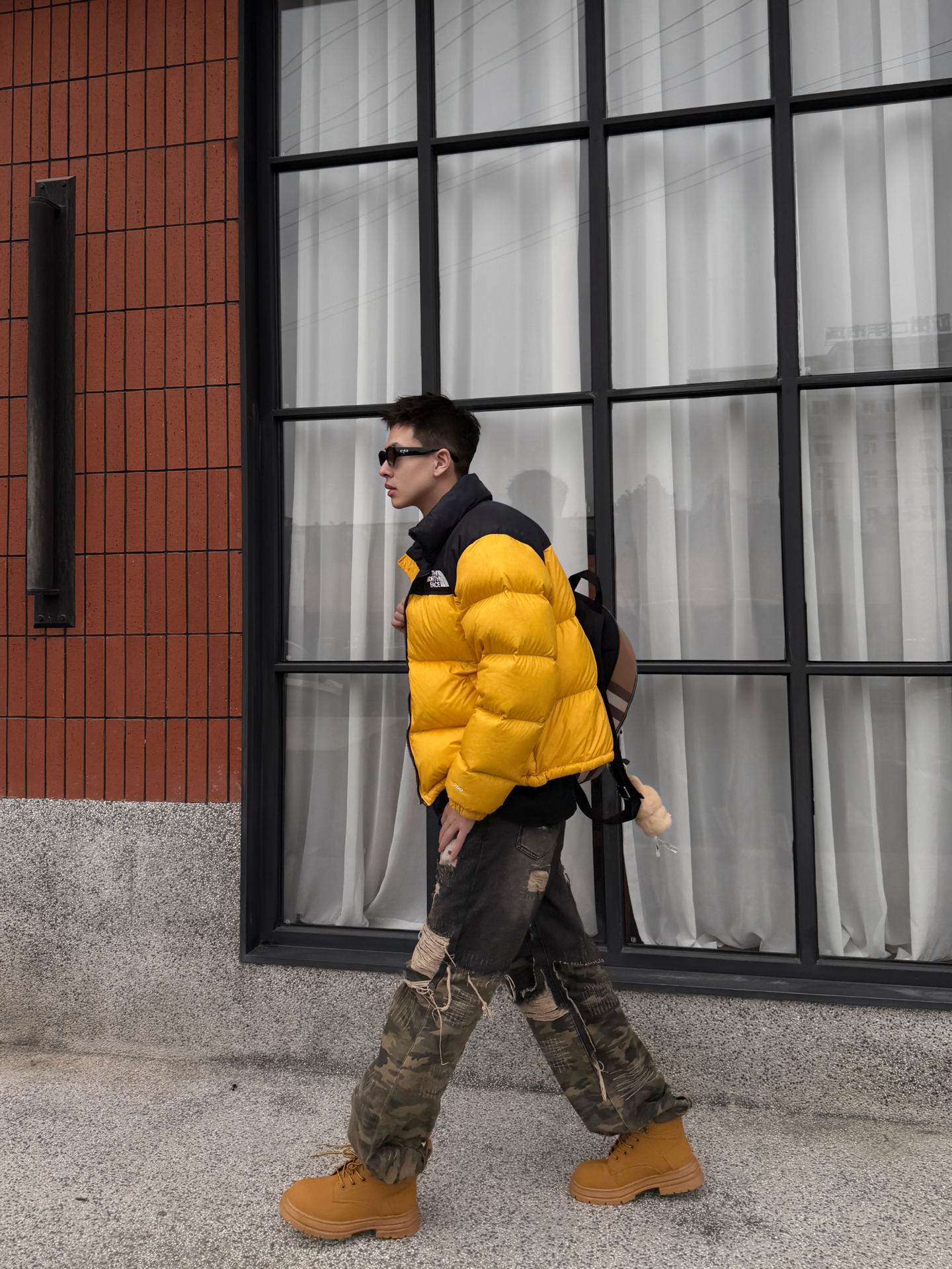 谁穿谁炸街的冬日配色!北面亮黄羽绒服+迷彩破洞裤+哆啦A梦大黄靴,潮感直接焊在身上~😎 这件北面羽绒服真的戳中视觉中心!亮黄色+黑拼色超有辨识度,蓬松度刚好不会显臃肿,上身保暖又能撑得起穿搭调性,连帽设计自带休闲感,日常穿既抗冻又时髦~ 搭配的迷彩破洞裤太有腔调了!做旧细节自带复古随性,阔腿版型显腿直又藏肉,和羽绒服搭在一起,松弛感与酷感双在线,出门完全不怕撞款~ 重点夸夸这双哆啦A梦大黄靴...