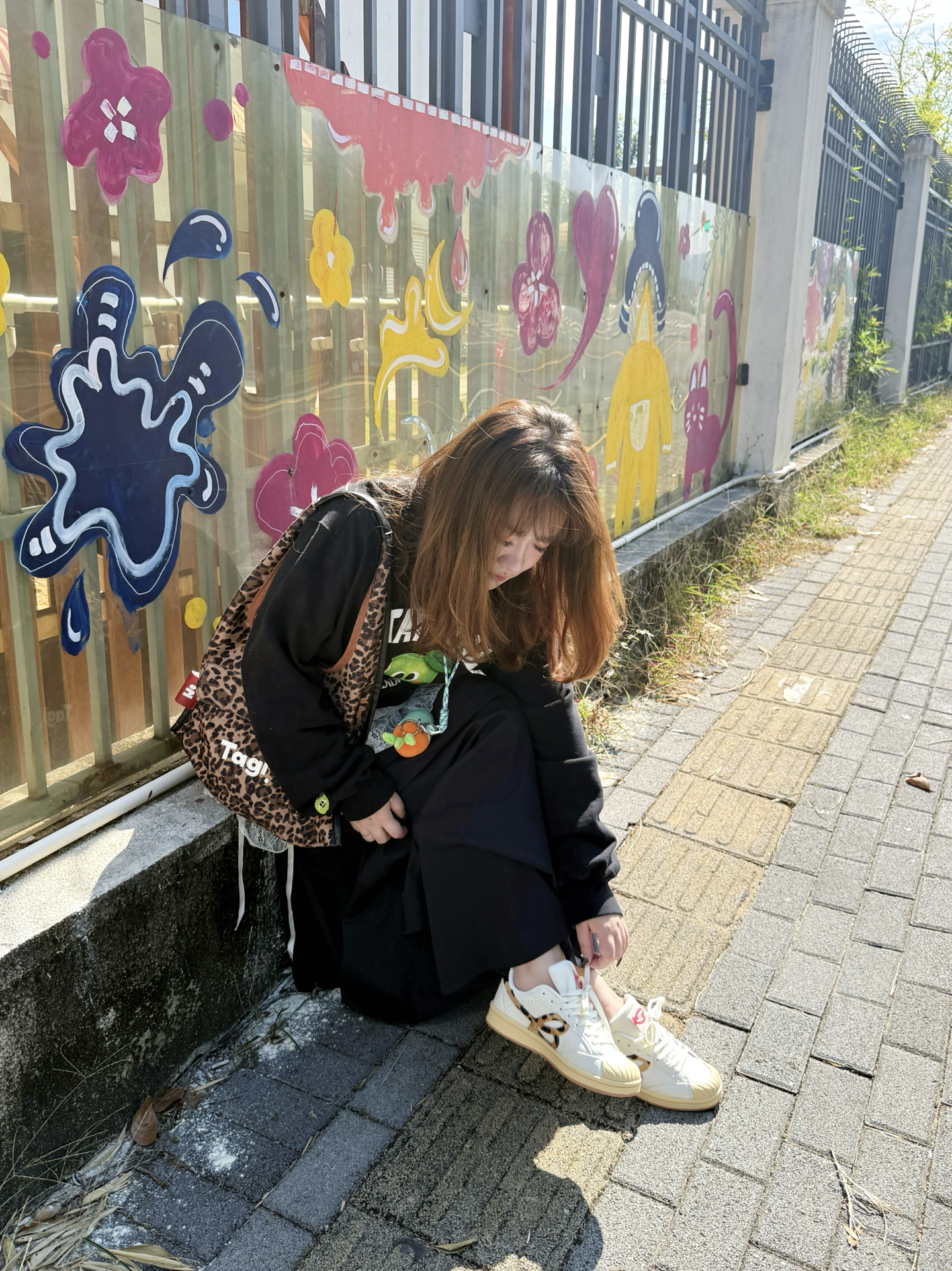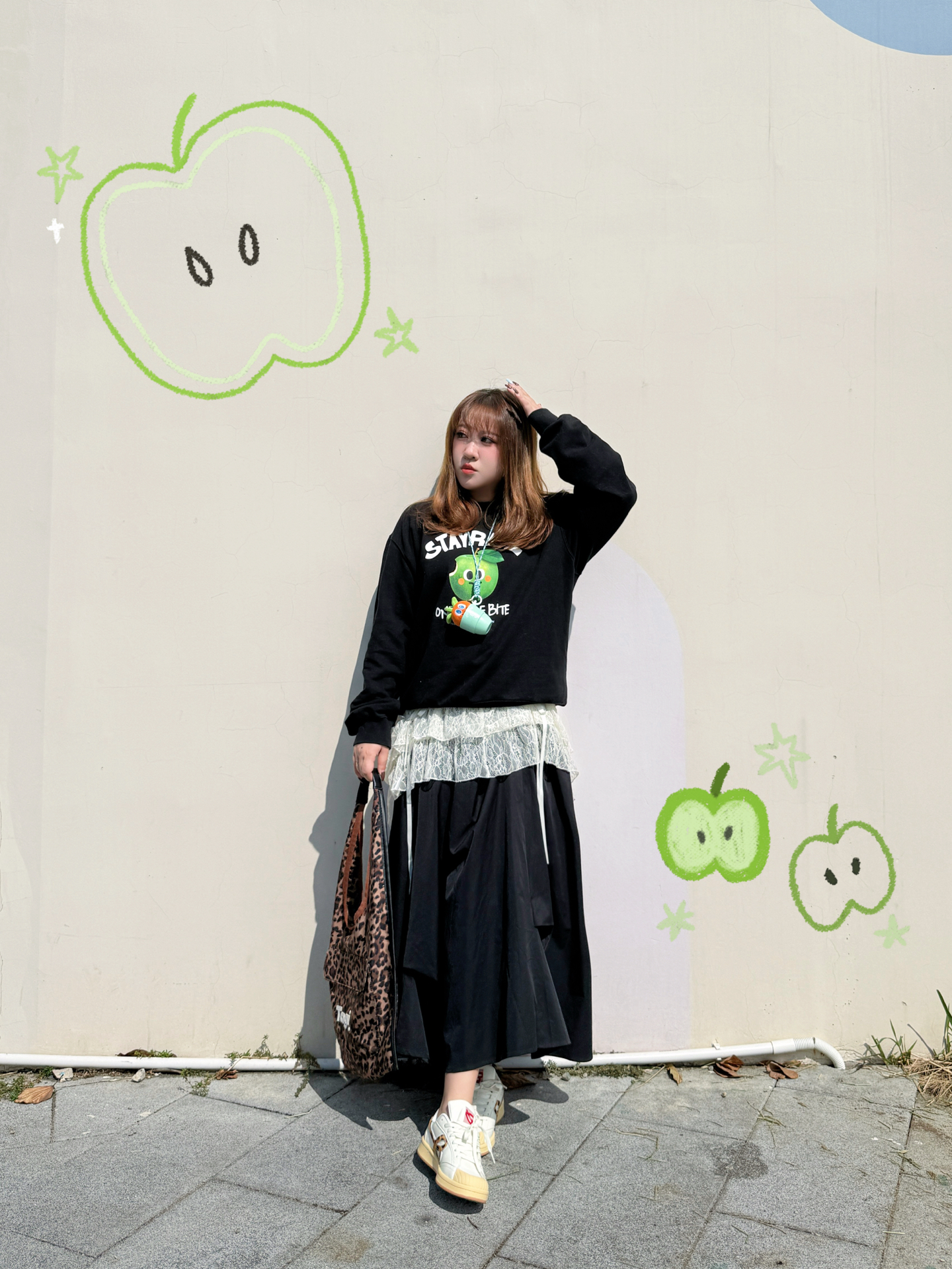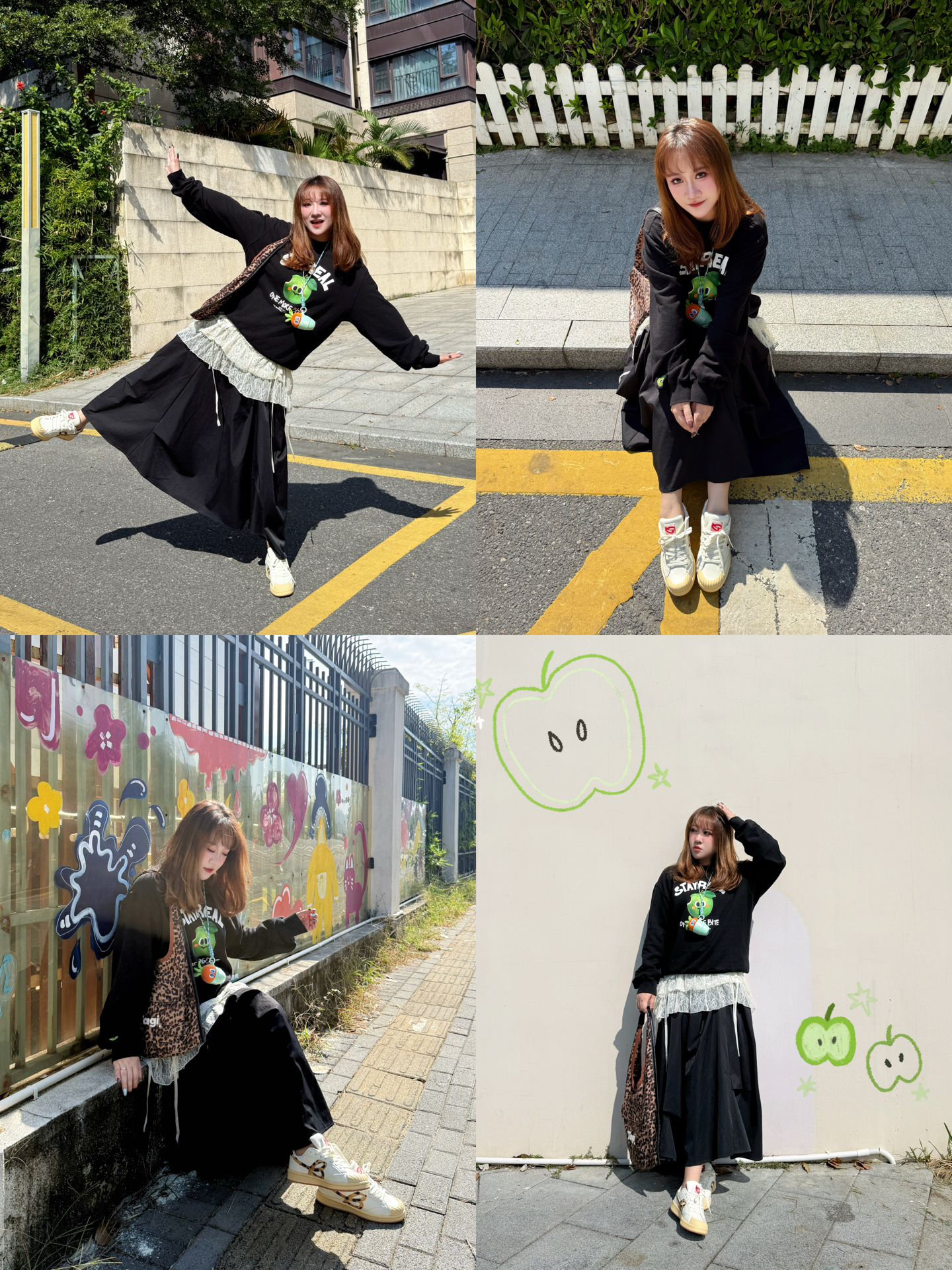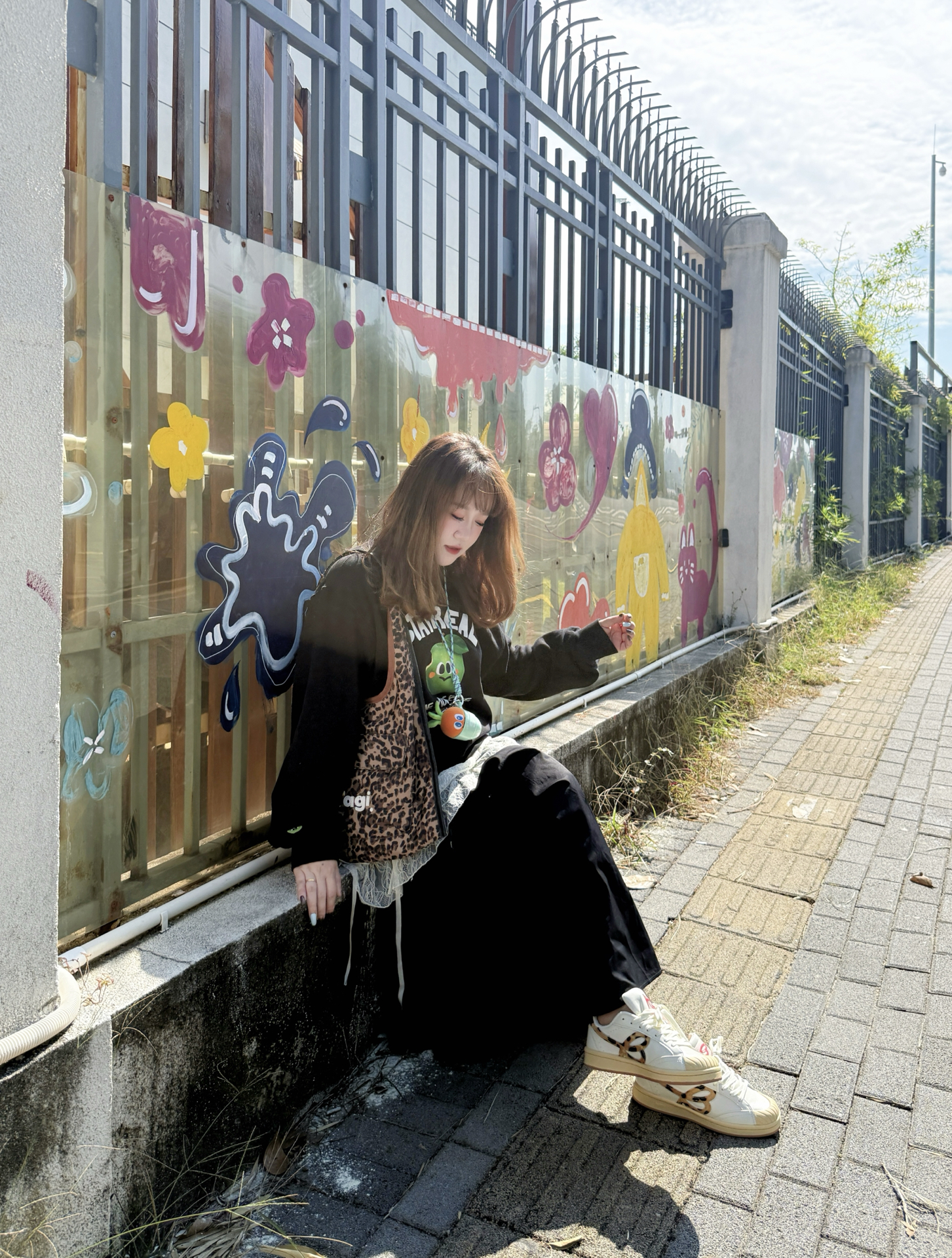 ▪️ 暗色系の调味哲学 卫衣的青苹果印花像是黑白电影里突然跳动的像素格🎬 个人偏爱把黑色穿出层次——裙摆的蕾丝屁帘随风飘起时 刚好露出鞋侧的豹纹图腾 不同材质悄悄对话👌 / ▪️ 厚底鞋の隐形buff 3cm增高底+防滑纹=小个子冬日安全感⛸️ 试过小跑追公交也不累脚 (豹纹从鞋面蔓延到挎包,野性美收放自如🐆 / ▪️ 背景与穿搭的彩蛋 涂鸦墙的彩虹色块🌈巧妙中和了全身的冷感 青苹果绿与墙面喷漆色...