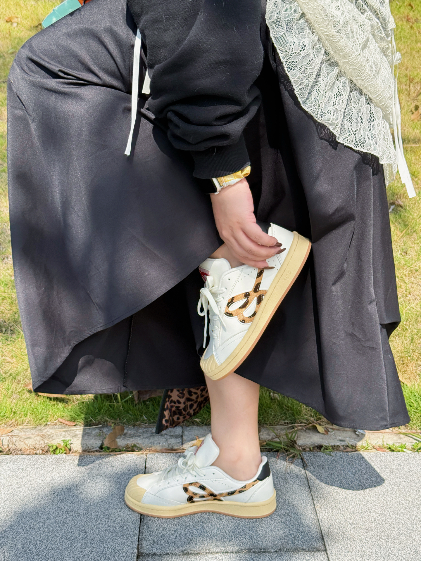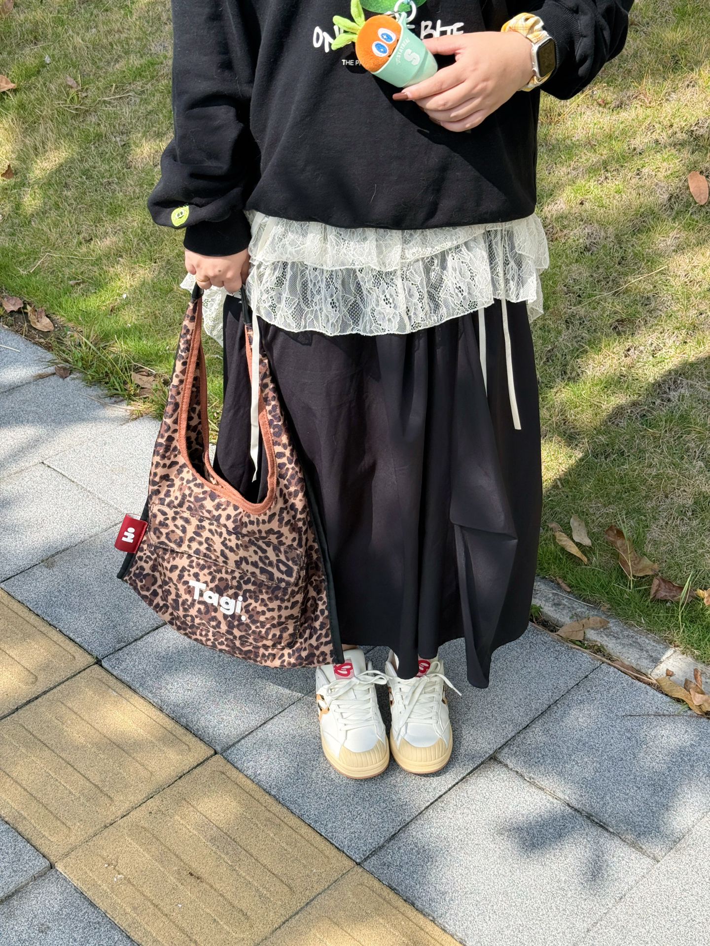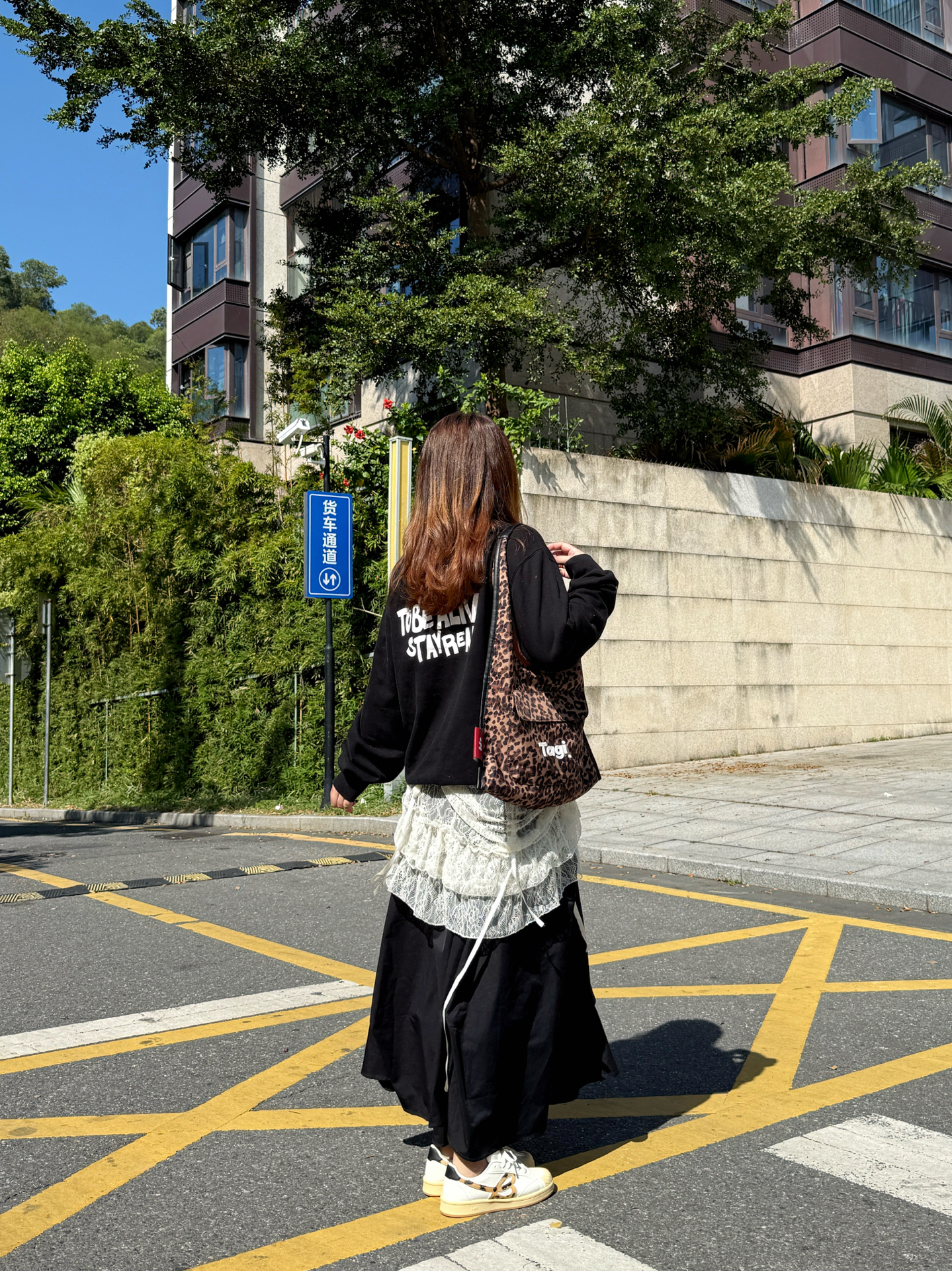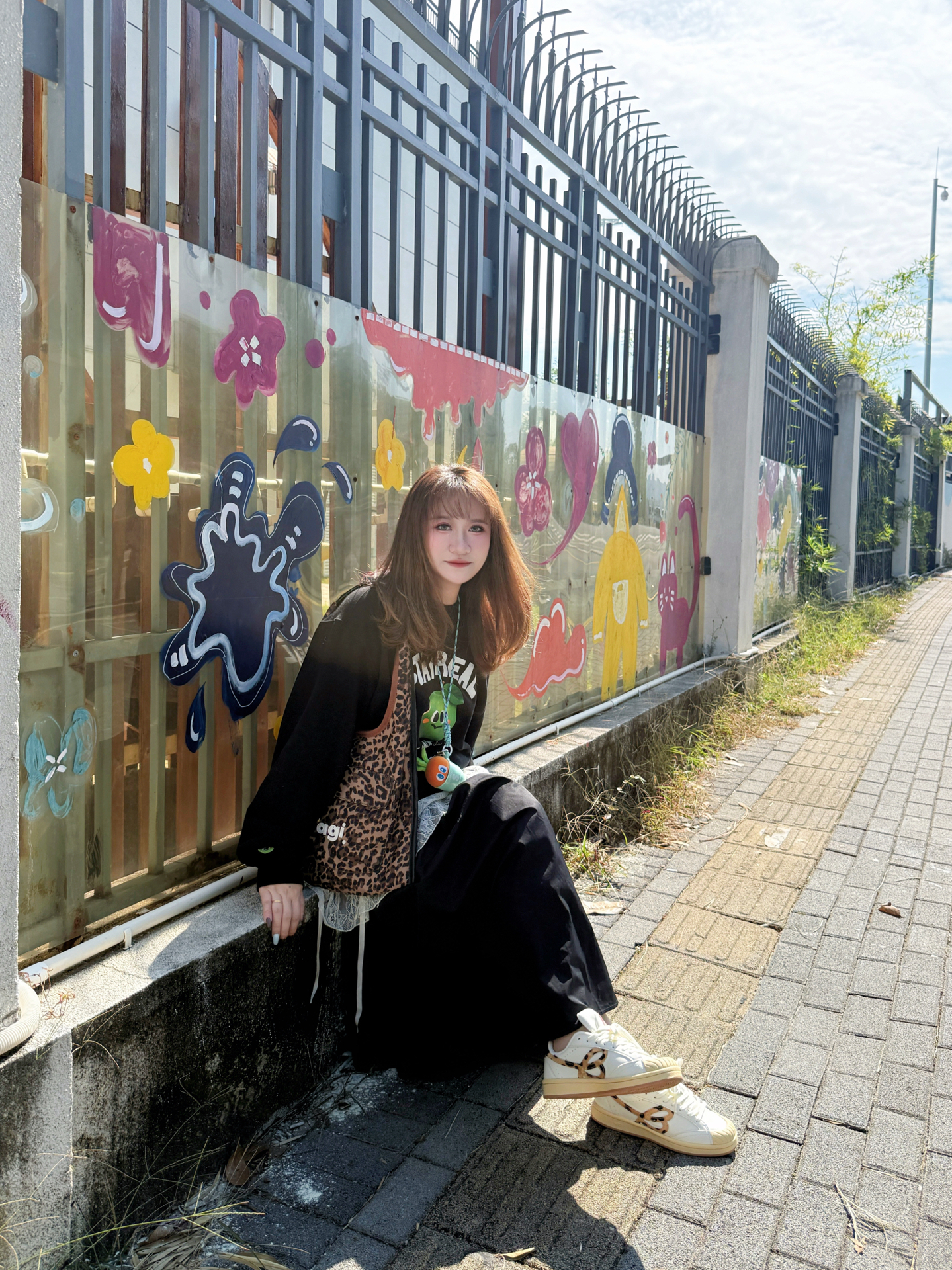 ▪️ 暗色系の调味哲学 卫衣的青苹果印花像是黑白电影里突然跳动的像素格🎬 个人偏爱把黑色穿出层次——裙摆的蕾丝屁帘随风飘起时 刚好露出鞋侧的豹纹图腾 不同材质悄悄对话👌 / ▪️ 厚底鞋の隐形buff 3cm增高底+防滑纹=小个子冬日安全感⛸️ 试过小跑追公交也不累脚 (豹纹从鞋面蔓延到挎包,野性美收放自如🐆 / ▪️ 背景与穿搭的彩蛋 涂鸦墙的彩虹色块🌈巧妙中和了全身的冷感 青苹果绿与墙面喷漆色...