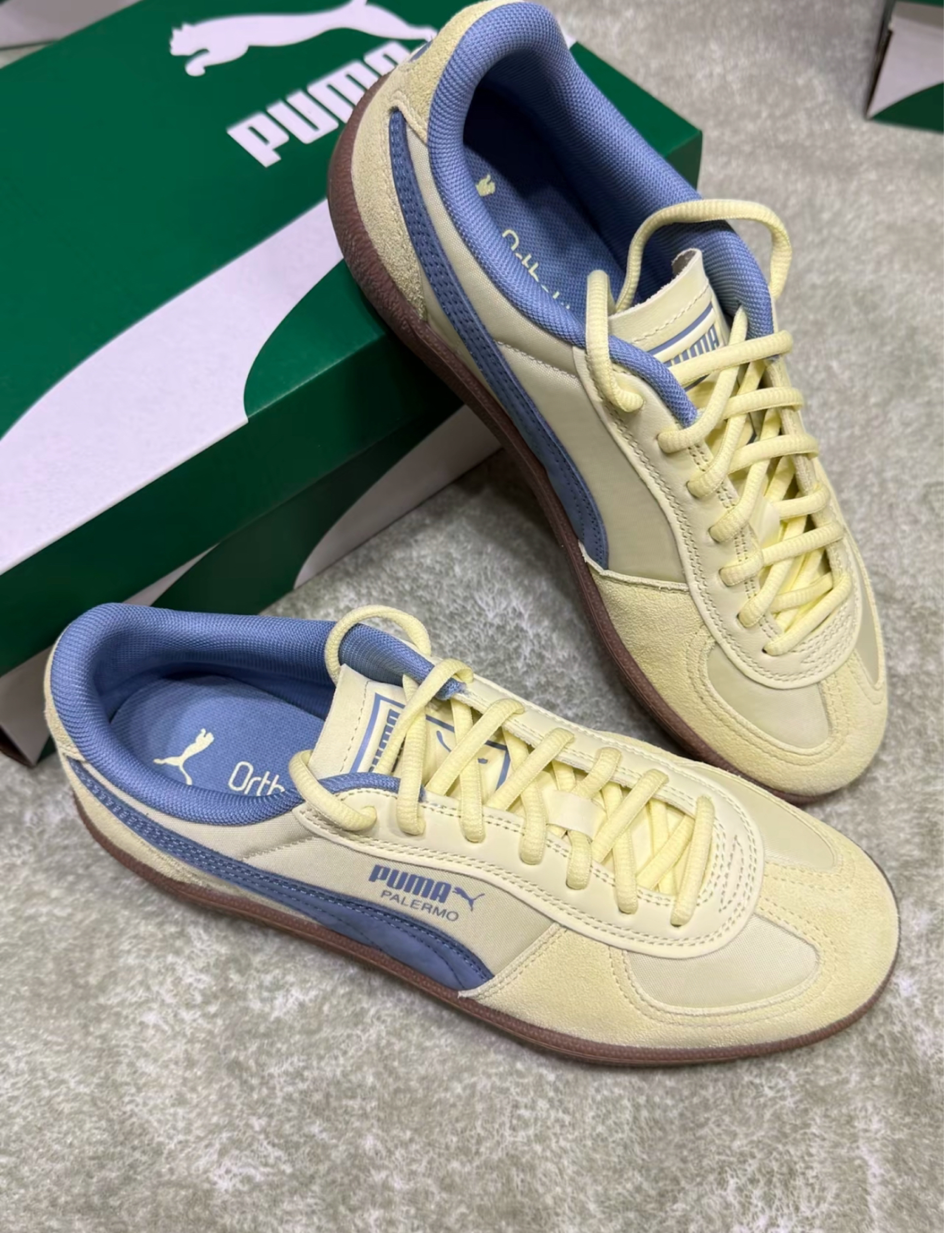 🔍 细节控狂喜: • 材质:全鞋麂皮覆盖,摸起来是绒绒的高级感,鞋侧鹅黄皮质线条+后跟淡蓝PUMA标,配色温柔到犯规; • 脚感:Ortholite鞋垫踩上去像陷进云朵,生胶底软弹不板脚,通勤逛gai走一天都不累; • 复古buff:经典德训鞋型+PUMA复古标,鞋盒还是标志性绿盒,开箱仪式感直接拉满!