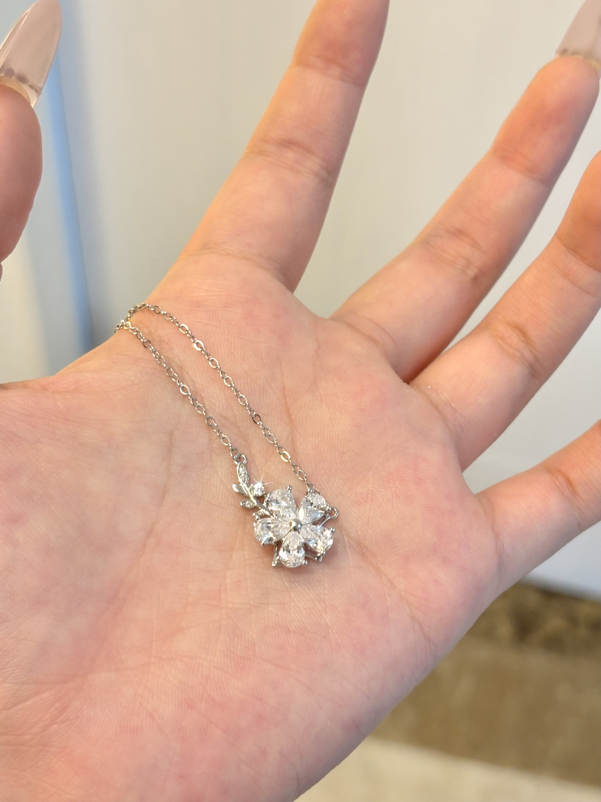 茉莉花的造型真的太美了 很温柔的感觉 一整个都亮闪闪的 上面的花朵还会转!美丽程度next level 转的好丝滑 足银的材质!银色的项链也很百搭日常!上班通勤戴都很合适