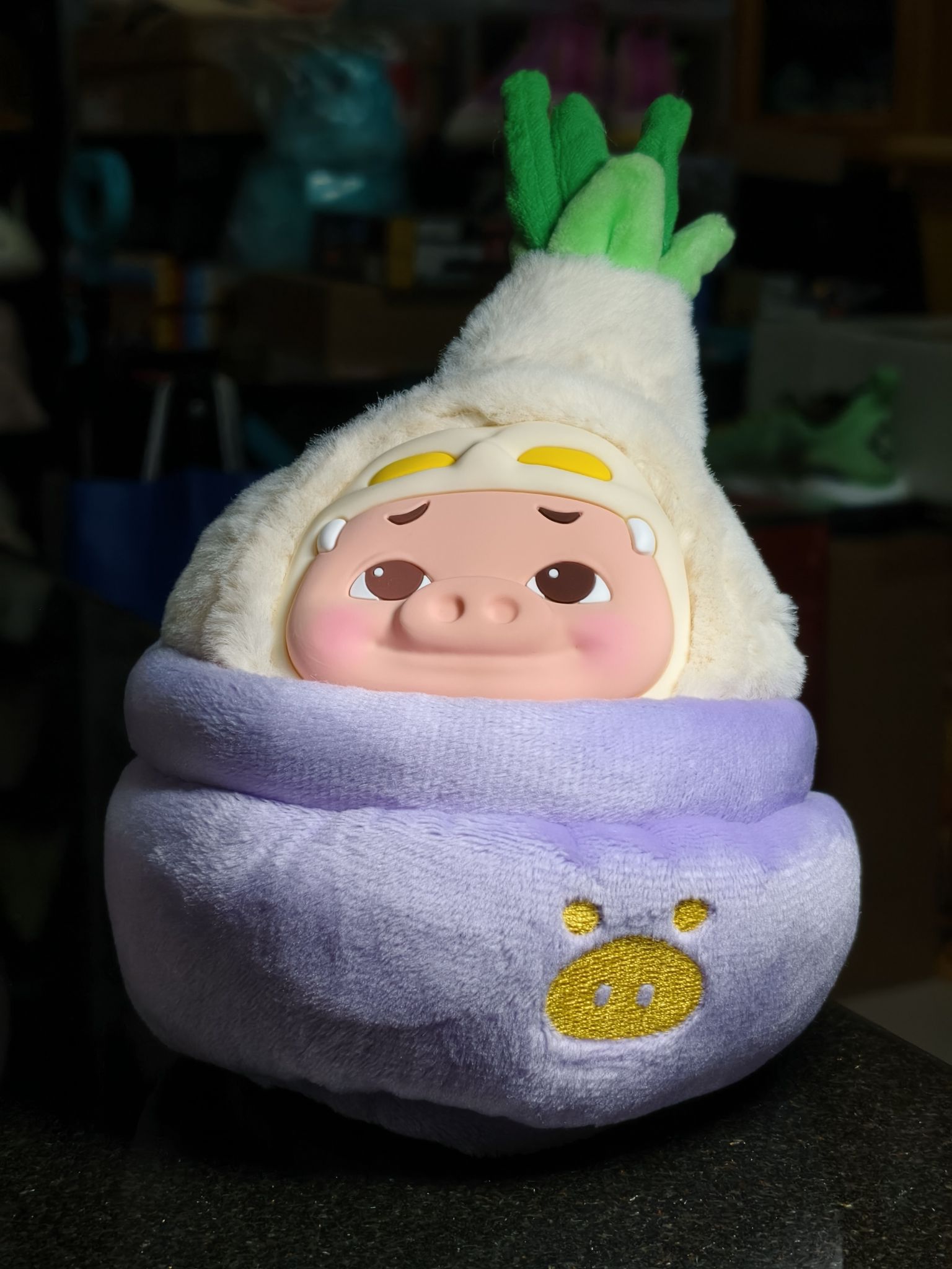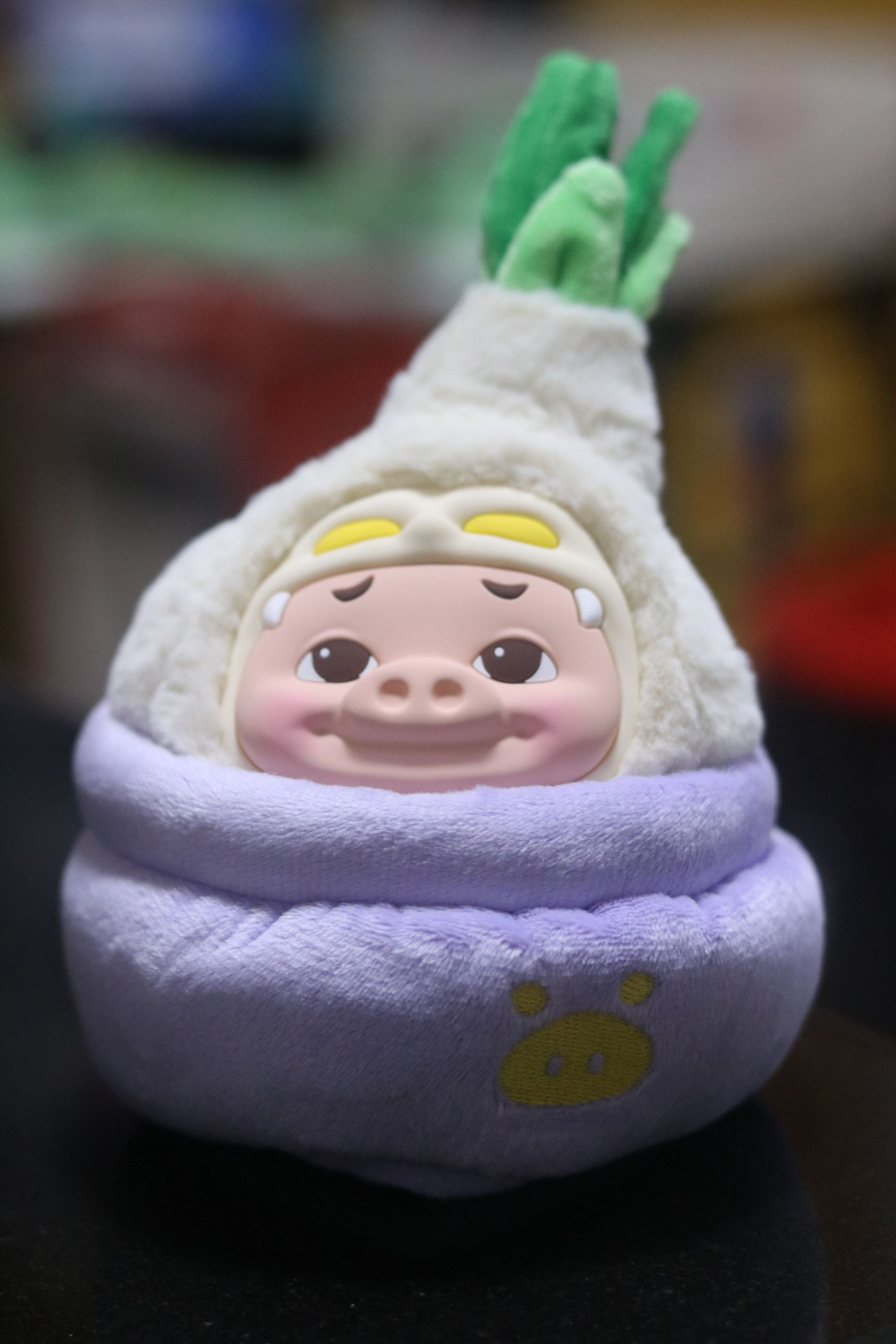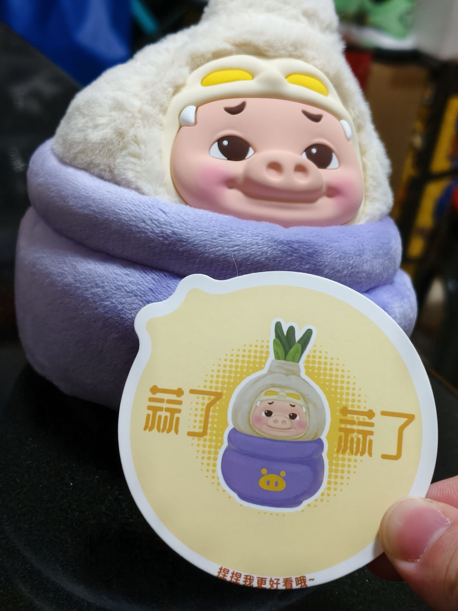 本猪猪侠已经是个蒜了😖 猪猪侠再次cosplay成植物盆栽🪴抽到的是蒜了🧄 身体为毛绒很好摸,蒜猪和盆是分体的。猪脸是搪胶触感很好有肌肤感😍造型真的诙谐有趣,蒜了的寓意算了,宛如上班牛马的一颗定心丸