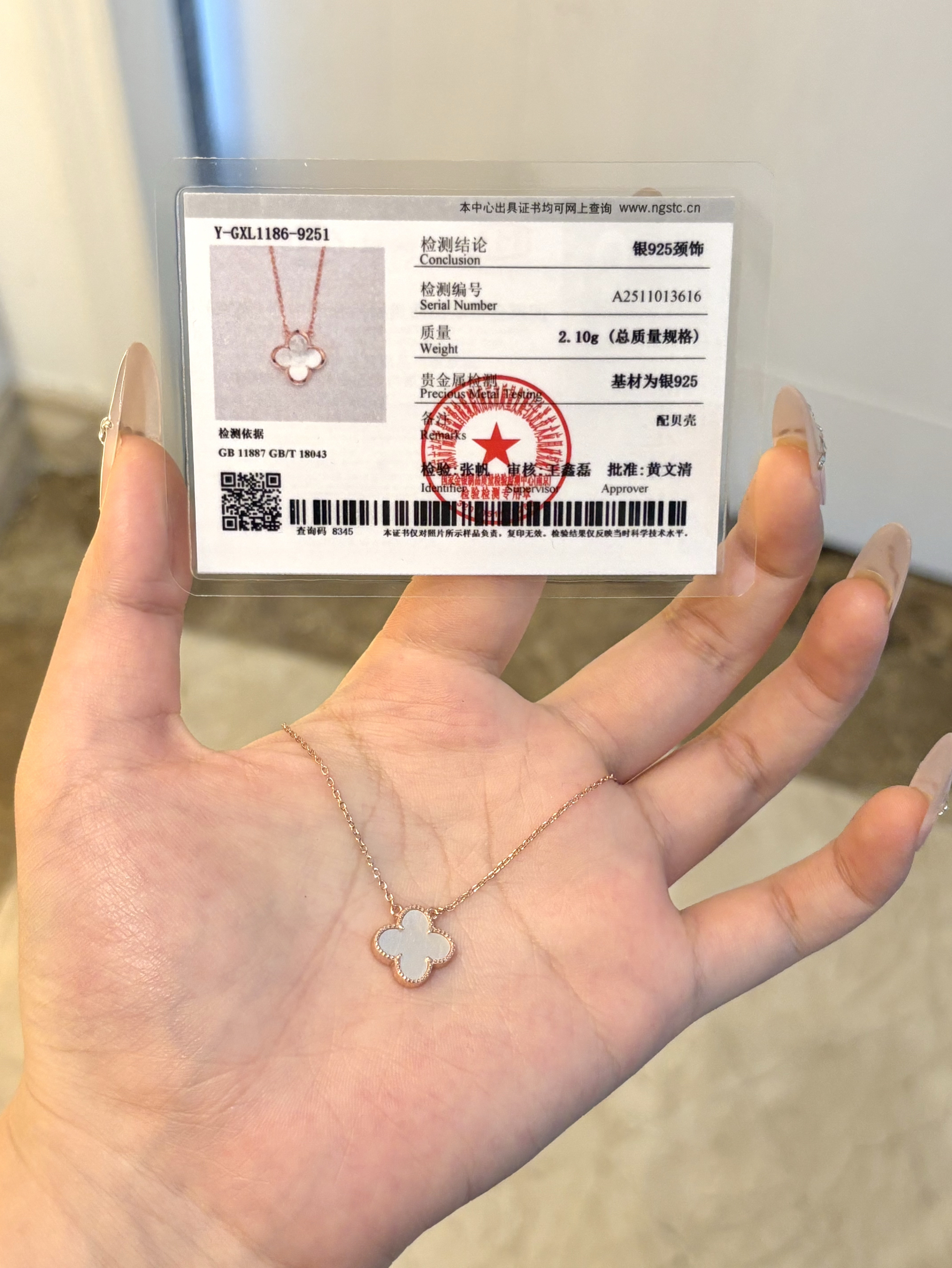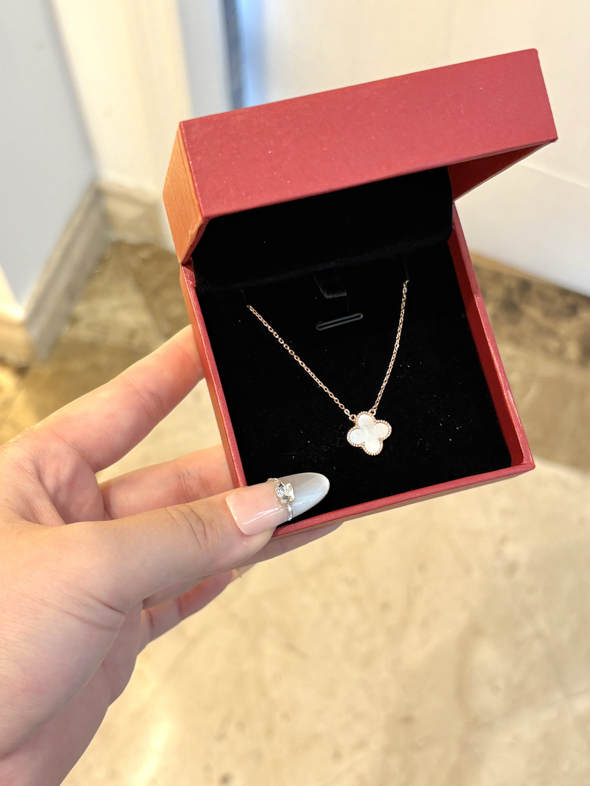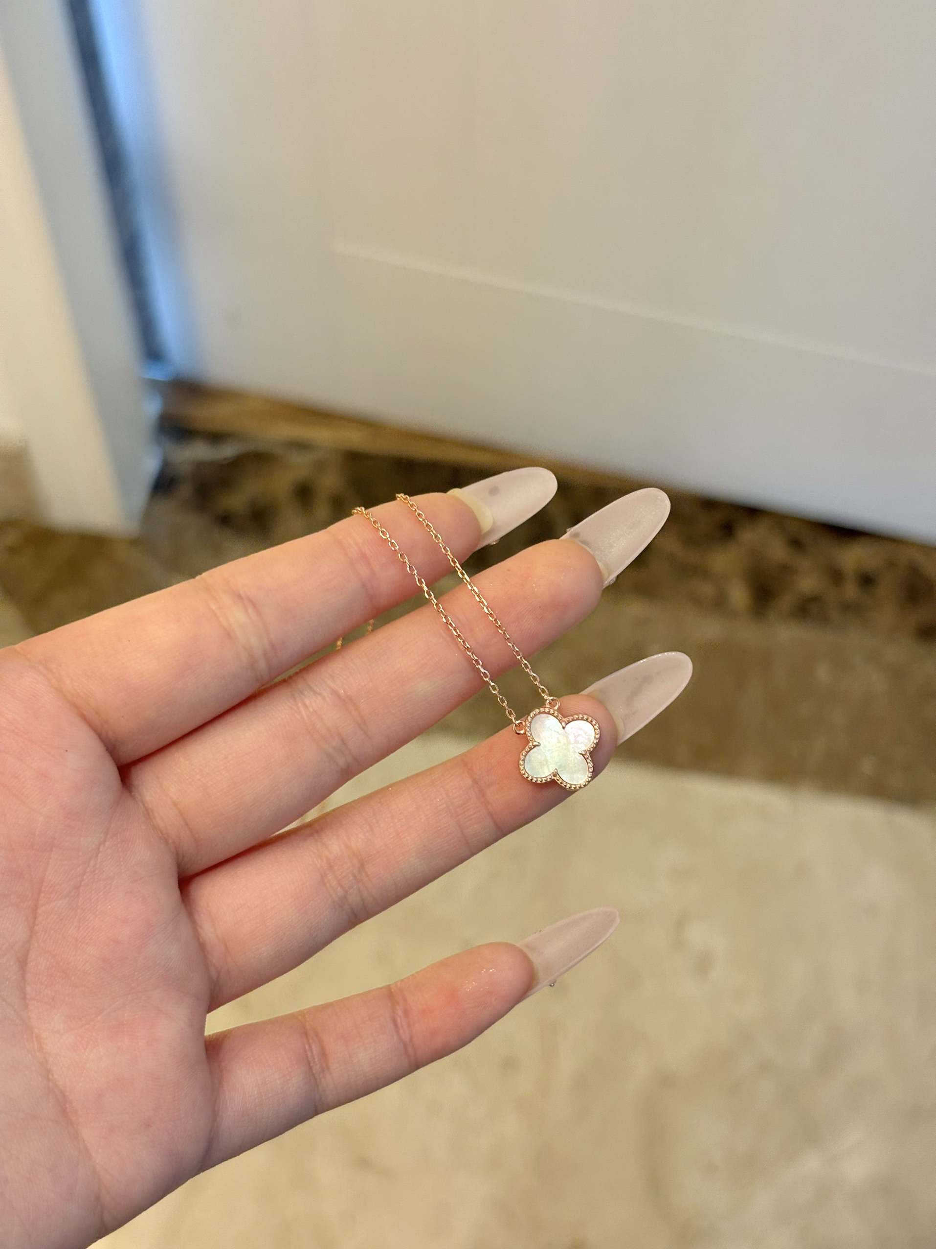 真嘟很难拒绝有四叶草元素的项链! 银项链搭配白贝母好精致 白贝母的光泽感非常好!戴在身上感觉贵气感拉满了~ 很日常和百搭 上班通勤也很合适~