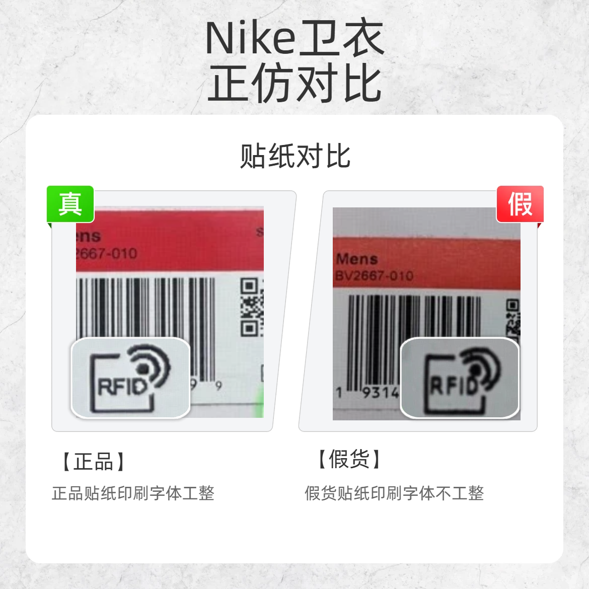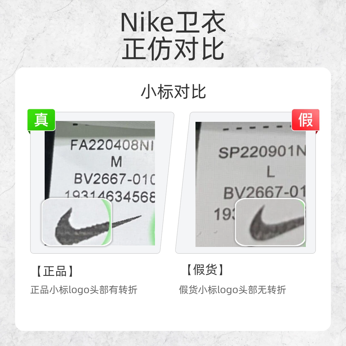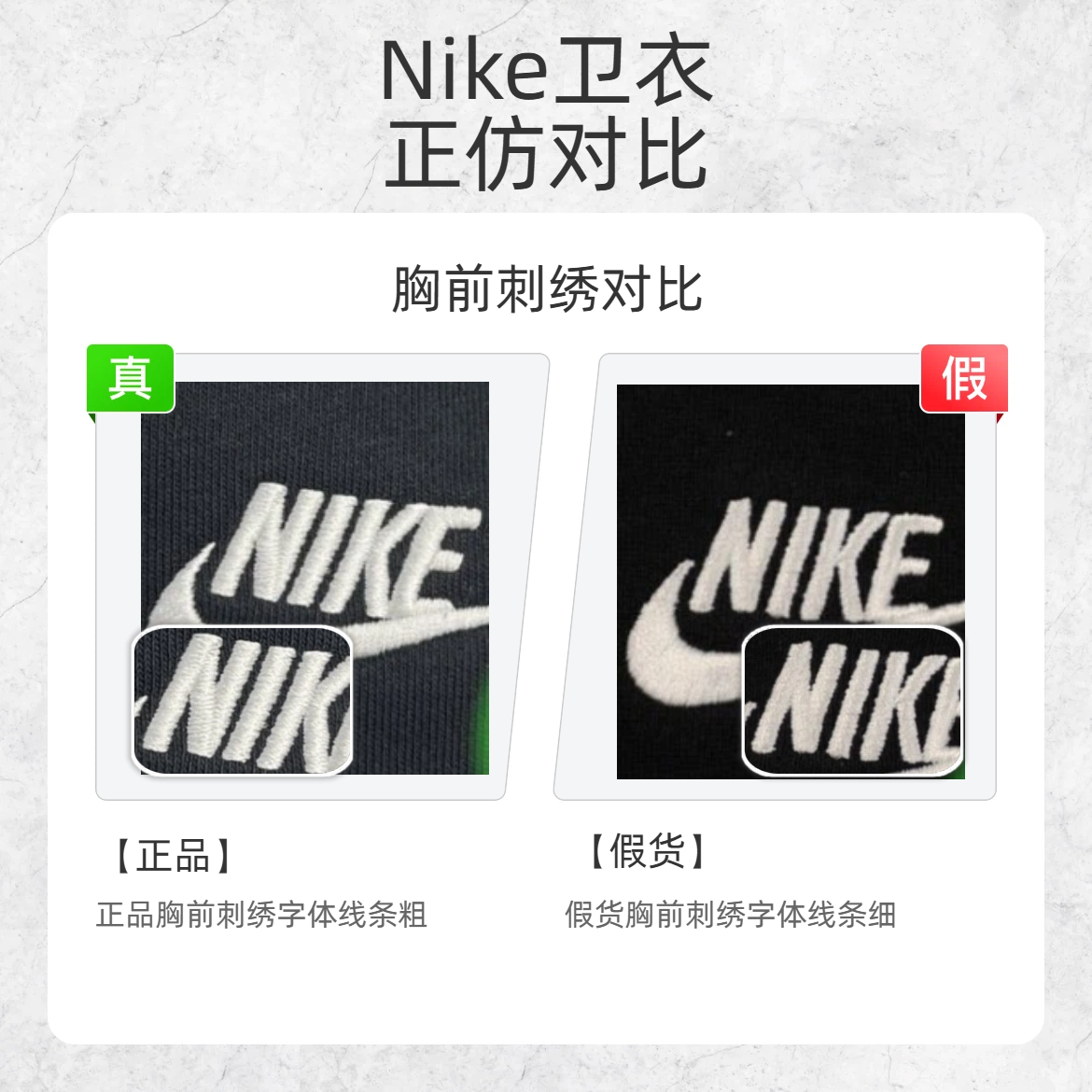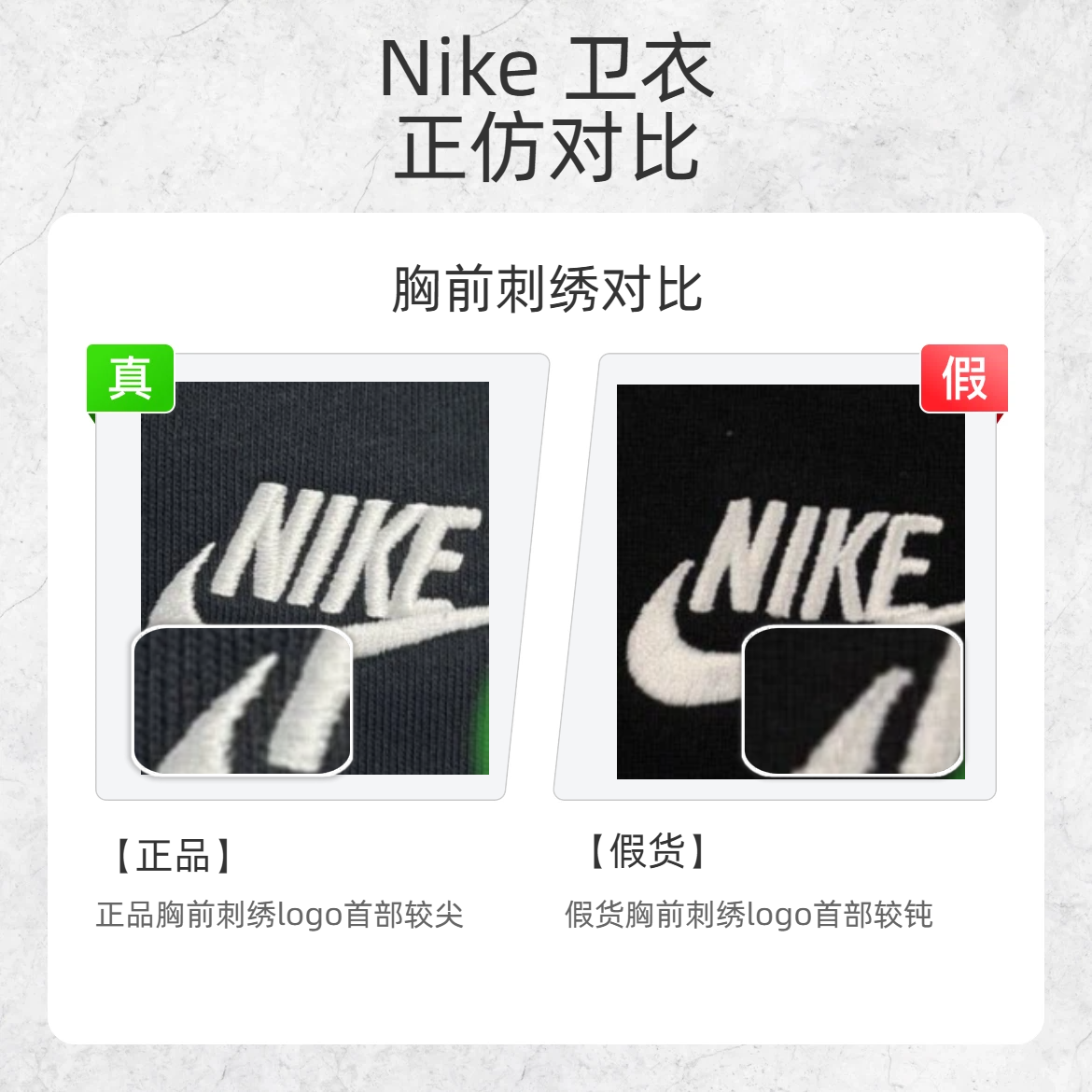 谁还没入手过 Nike 的经典卫衣呢?但假货泛滥真的让人头疼!今天就教大家从这几个细节快速鉴别 Nike 卫衣真假,让你花钱不踩雷~ 🔍 胸前刺绣对比 正品胸前刺绣logo首部较尖,且字体线条粗 假货胸前刺绣logo首部较钝,且字体线条细 🔍 贴纸对比 正品贴纸印刷字体工整 假货贴纸印刷字体不工整 🔍 小标对比 正品小标 logo 头部有明显转折 假货小标 logo 头部无转折 掌握这几个...