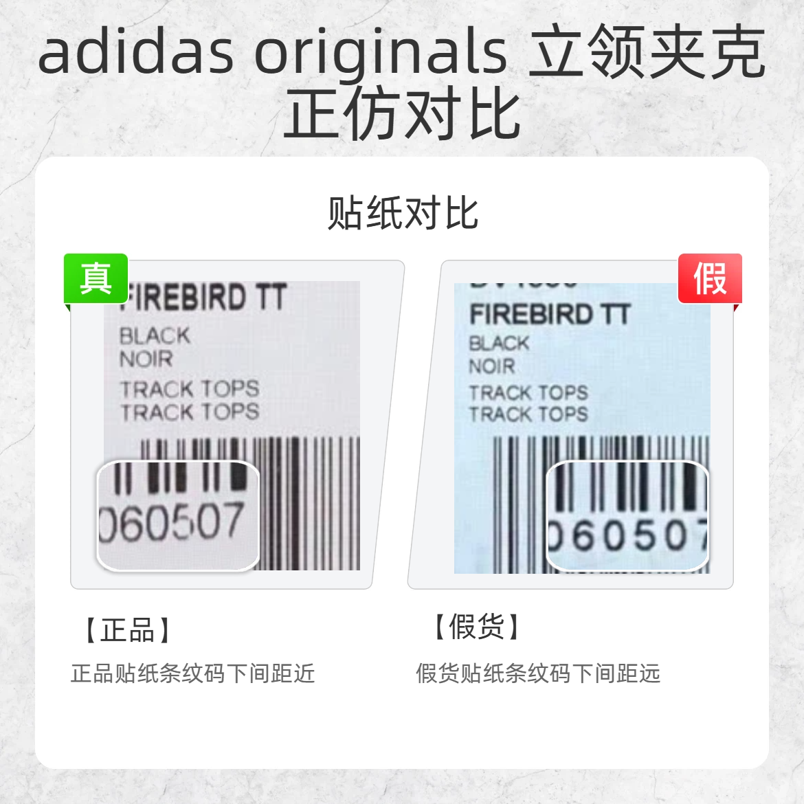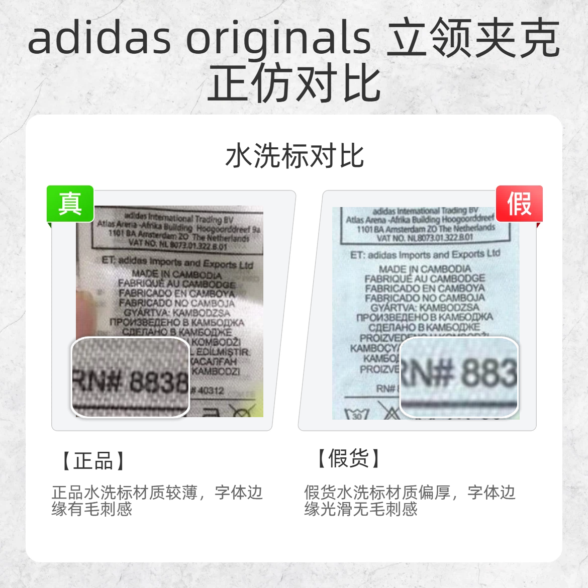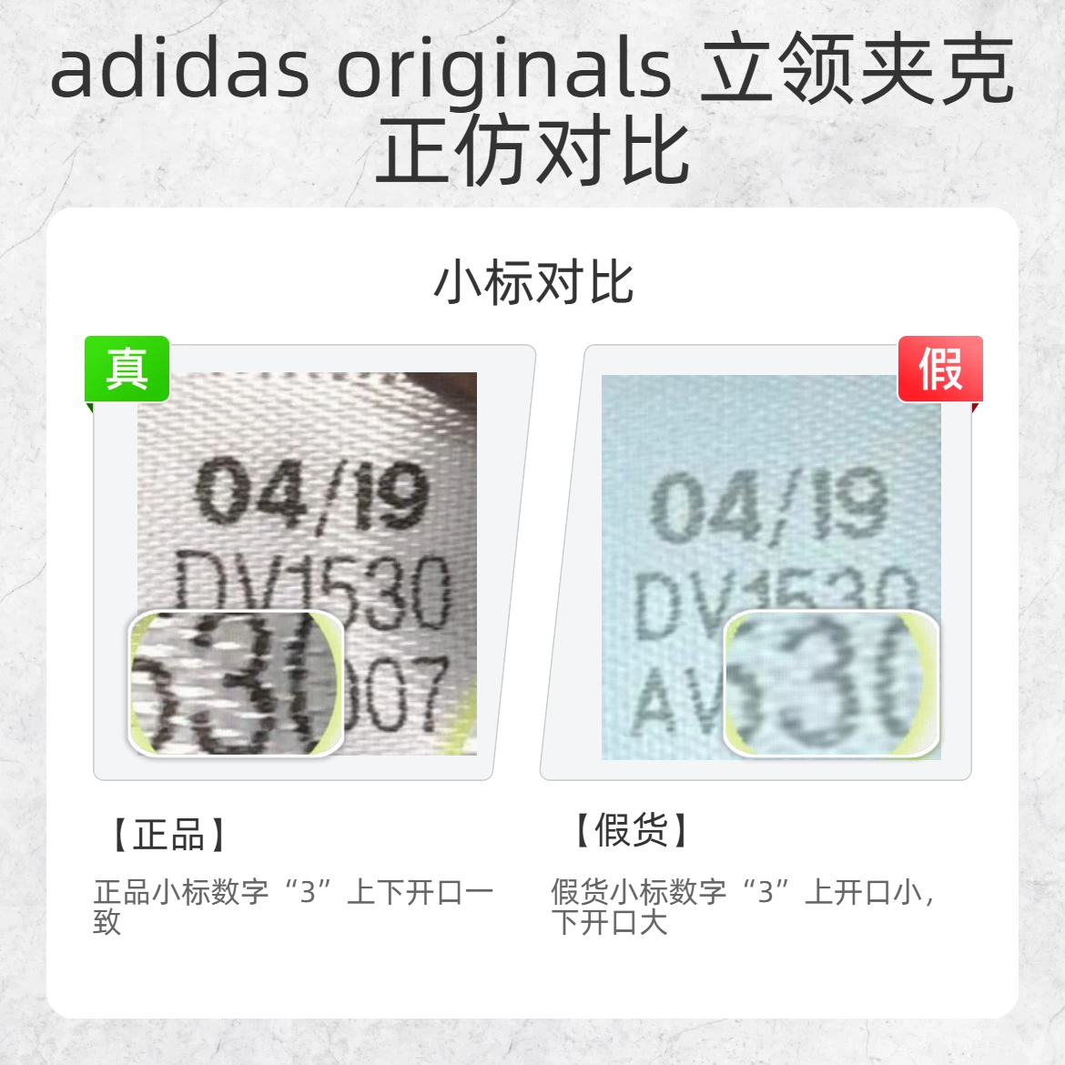 潮人们看过来👀 adidas originals 的立领夹克谁不爱?但假货太多容易踩坑!今天教你从这几个细节快速分辨真假,再也不怕花冤枉钱~ 🔍 贴纸对比 正品贴纸条纹码下字体间距近 假货贴纸条纹码下字体间距远 🔍 水洗标对比 正品水洗标材质较薄,字体边缘有毛刺感 假货水洗标材质偏厚,字体边缘光滑无毛刺 🔍 小标对比 正品小标数字 “3” 上下开口一致 假货小标数字 “3” 上开口小,下开口...