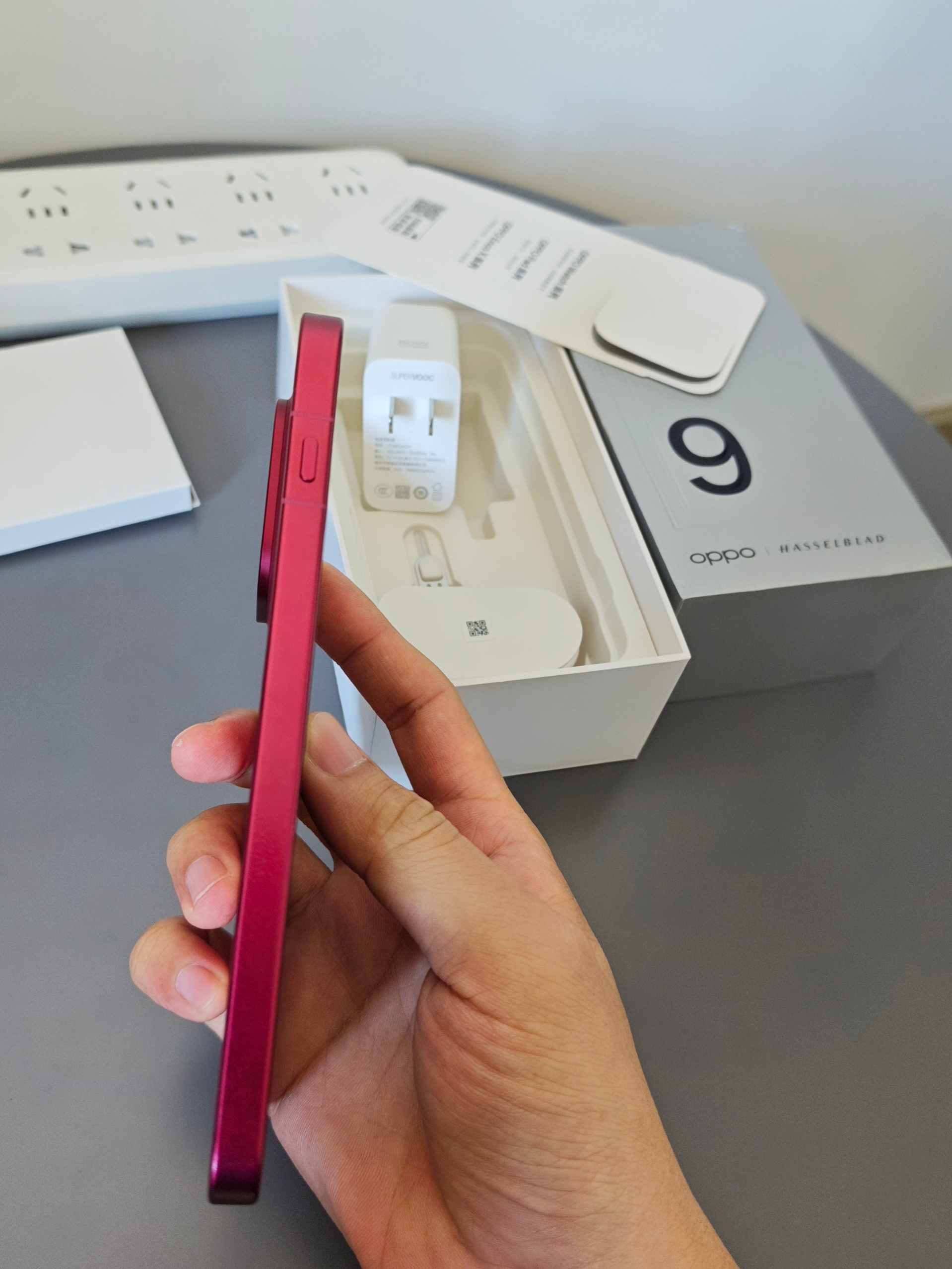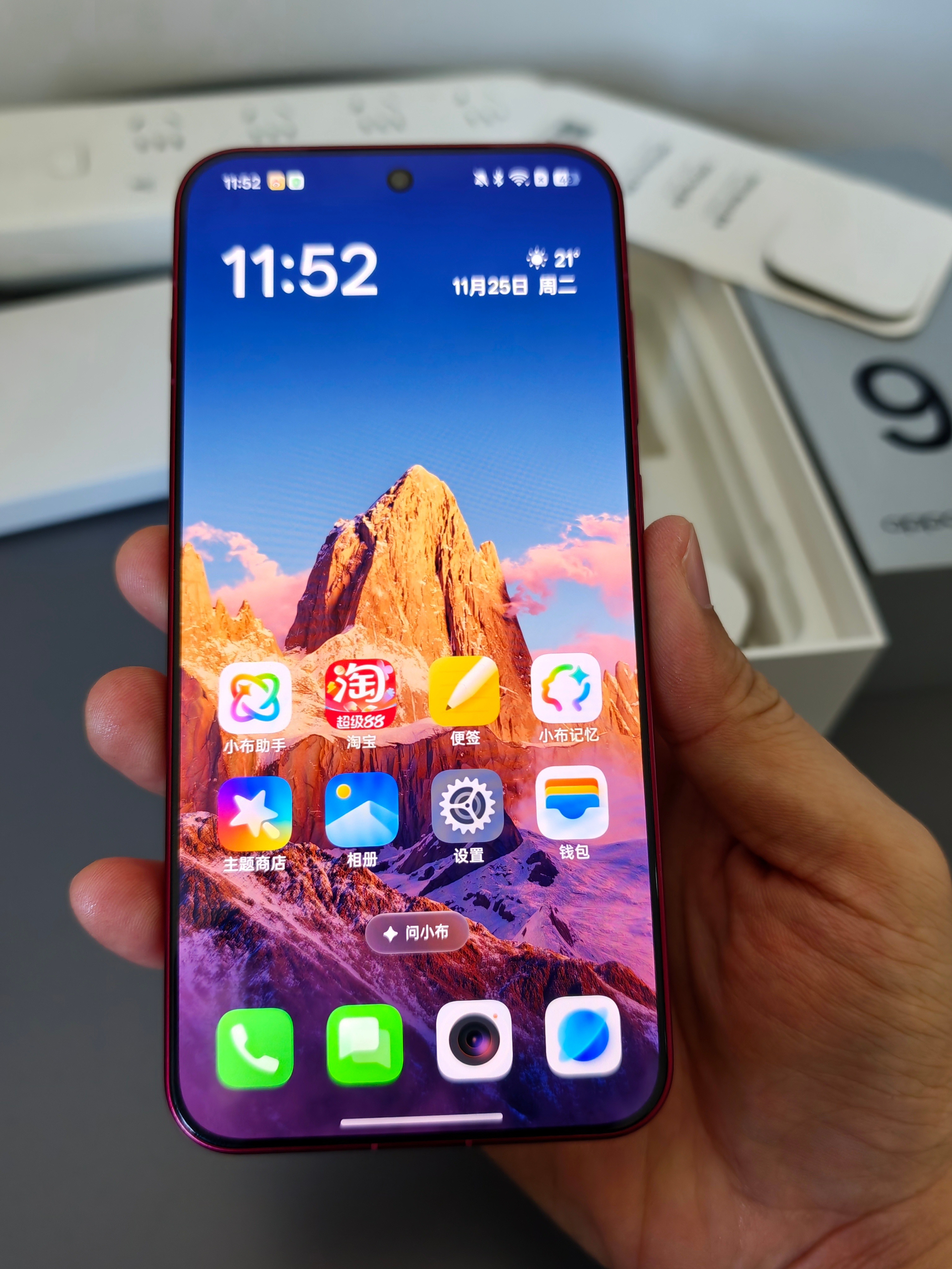 蹲好久的莎莎同款Find X9追光红!大补特补! 我的也到手了!!📦 一上午就光顾着拆箱欣赏了 赶紧拍几张给你们瞅瞅😉 说真的 这手感比我预想的还要好 后盖是那种丝绒磨砂质感 摸起来滑滑糯糯的 重点是完全不沾指纹!对我这种汗手太友好了 整机拿在手里很轻薄 握感特别舒服 而且这个红色真的绝了 光线下会透出微微金属光泽 越看越高级 属于耐看型选手✨(不愧是莎莎认证!) 正面屏幕说是1.15mm...
