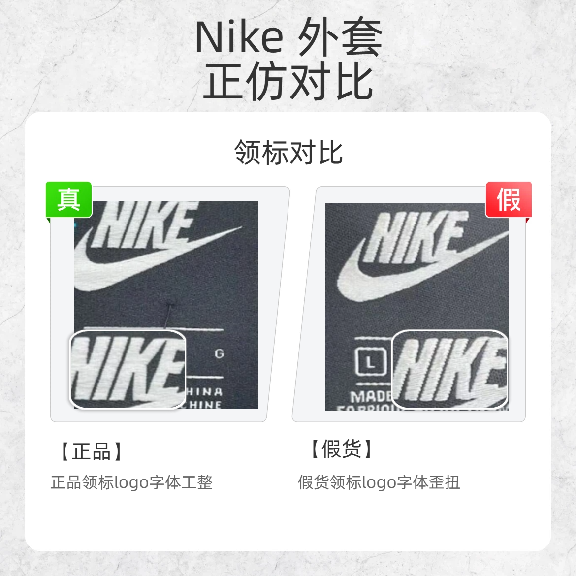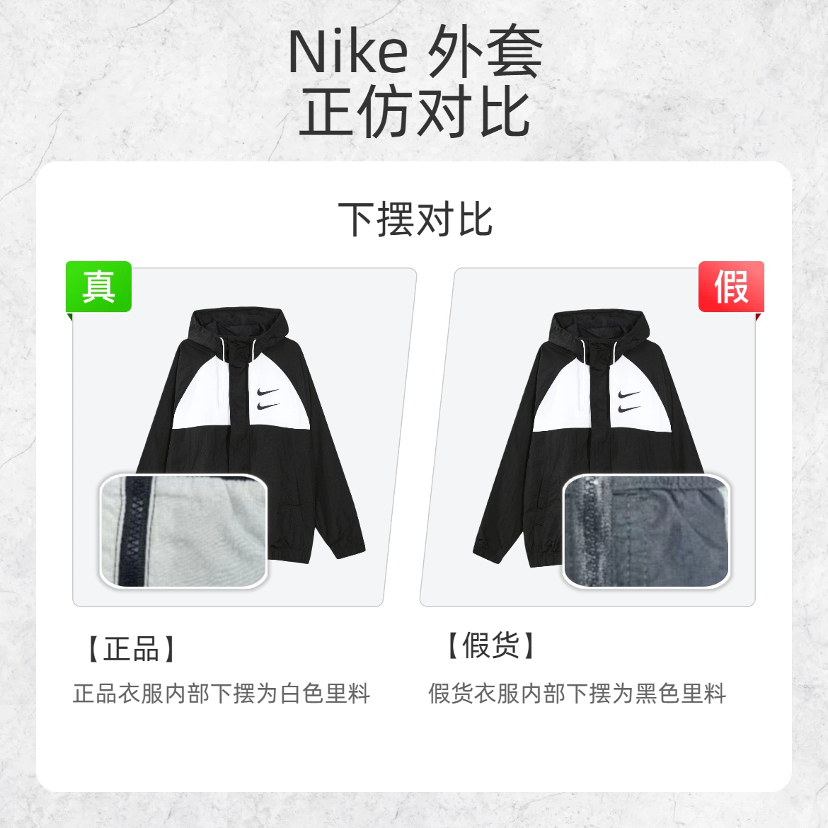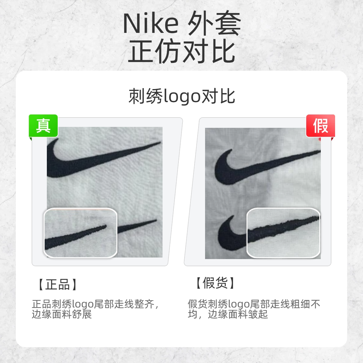 Nike双钩外套火到出圈,但假货也跟着 “泛滥成灾”!今天小编就给你们扒一扒那些藏在细节里的真伪密码,让假货无处遁形~ 🔍 领标对比 正品领标 logo 字体工整 假货领标 logo 字体歪扭 🔍 刺绣 logo 对比 正品刺绣 logo 尾部走线整齐,边缘面料舒展 假货刺绣 logo 尾部走线粗细不均,边缘面料皱起 🔍 纽扣对比 正品纽扣中间凹 假货纽扣中间突 🔍 下摆对比 正品衣服下摆...