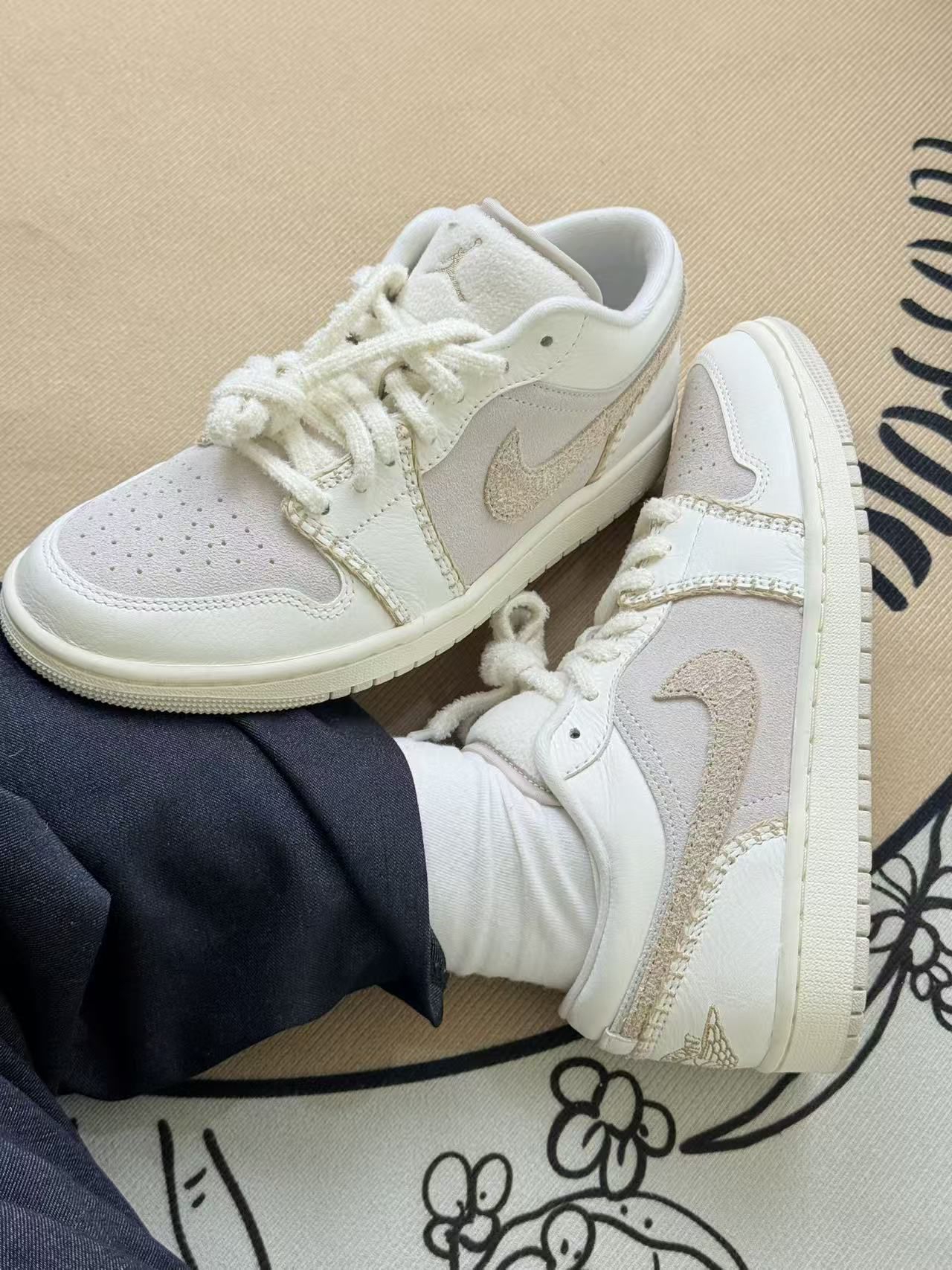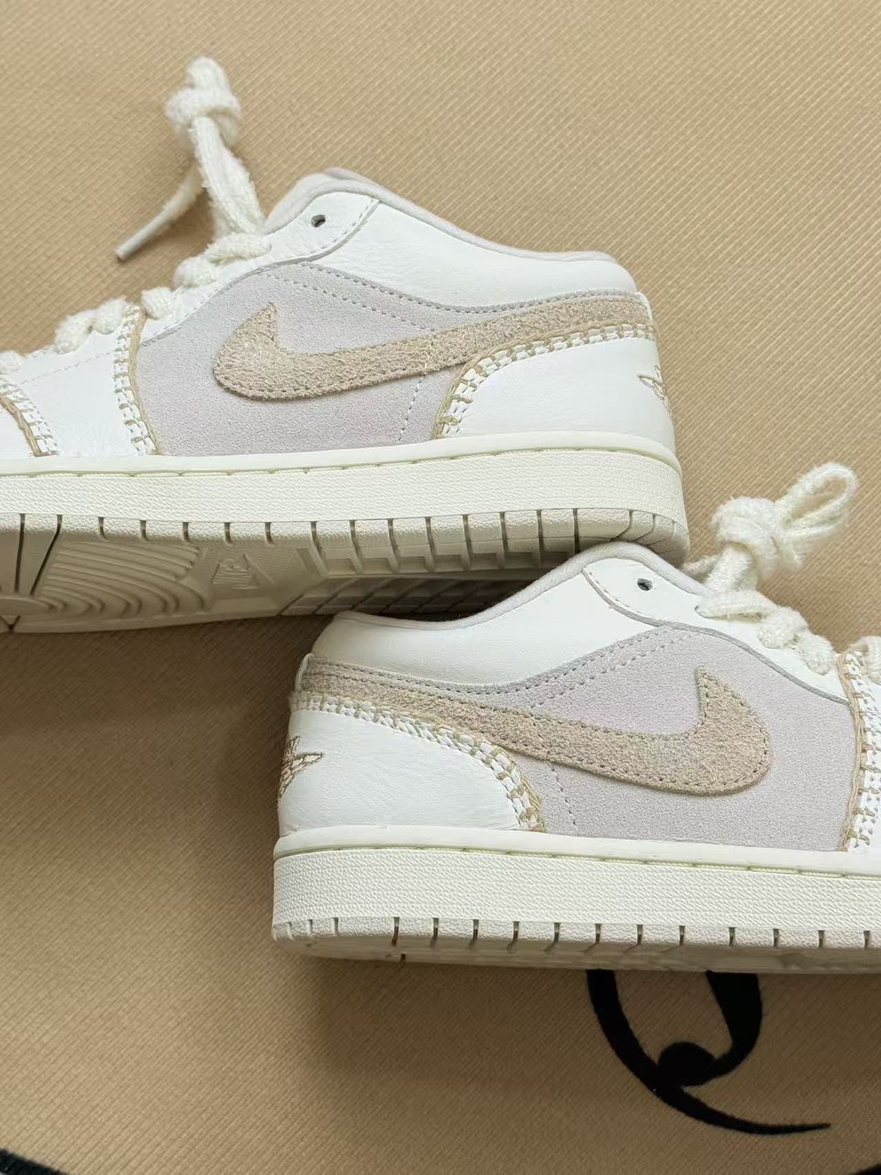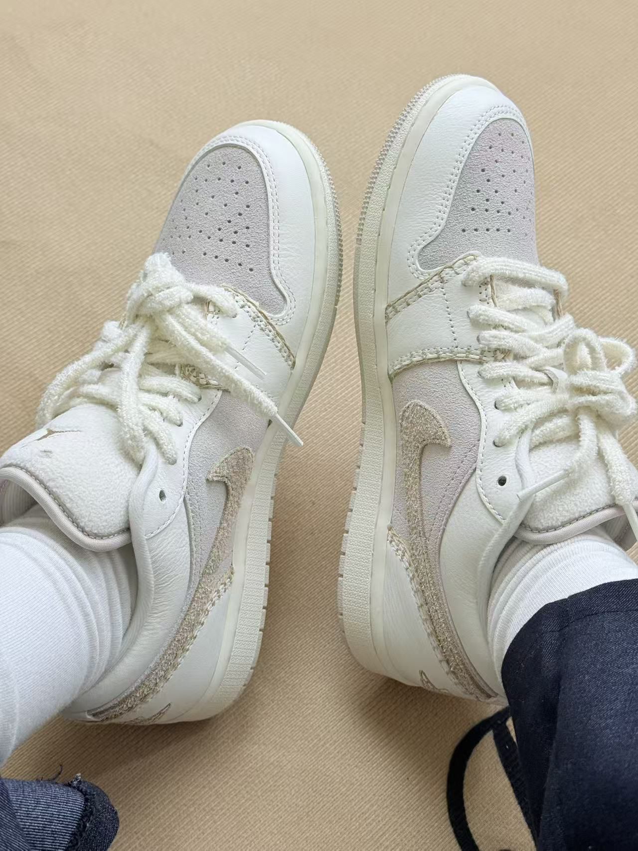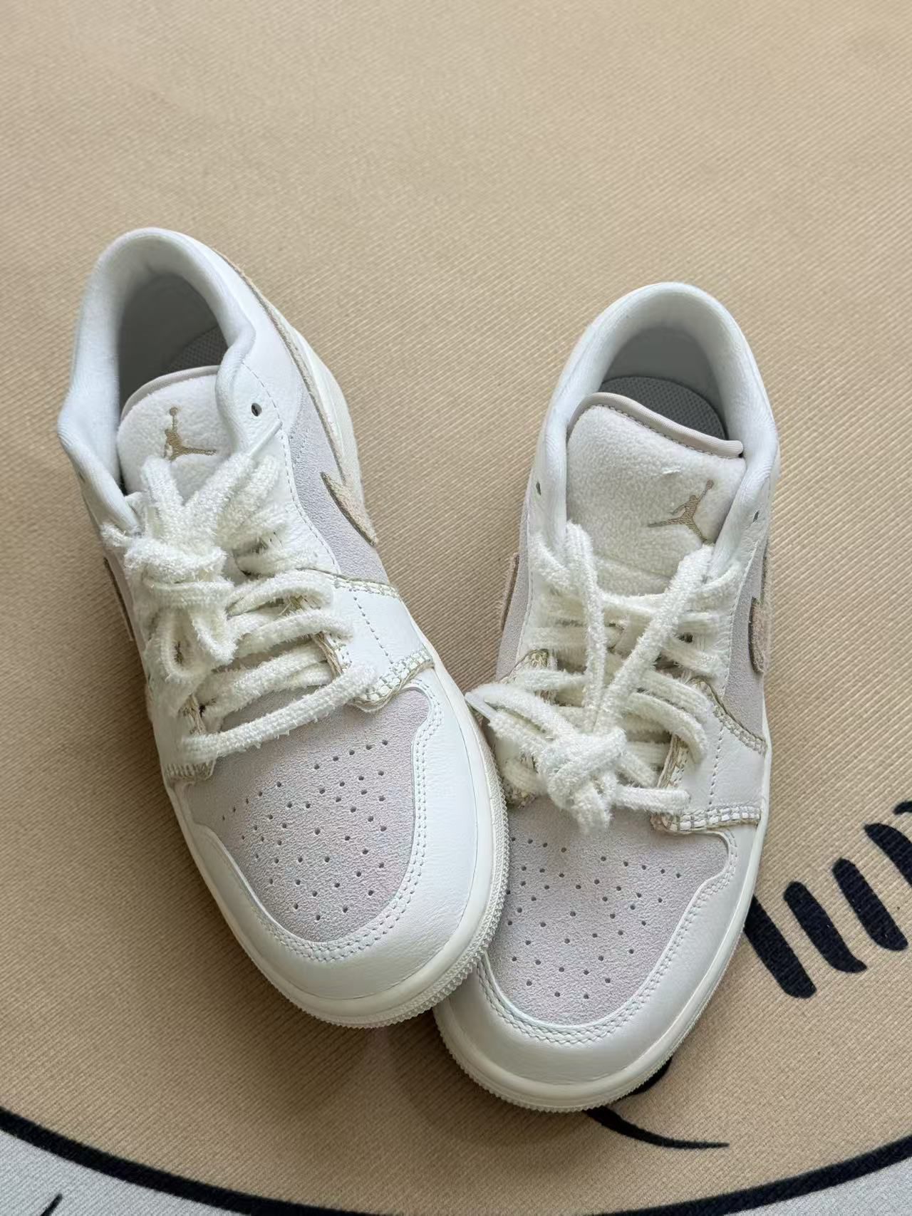 这双鞋拿到手的第一感觉是颜色比图片里更柔和,米白+浅灰的组合不是那种容易显脏的亮白,反而带点温柔的旧化感✨。 上脚很软,鞋帮的填充刚好能贴住脚踝,不会磨脚也不会有闷脚的感觉,穿了小半天走路都挺舒服。鞋面的材质是拼接的,有绒面也有带点光泽的布料,摸起来质感层次很明显,配牛仔裤或者浅色裤子都不挑。 不过也有小缺点:鞋舌的毛线圈鞋带容易勾到裤子的线头,出门前得特意理一理;而且绒面的部分如果沾到水...