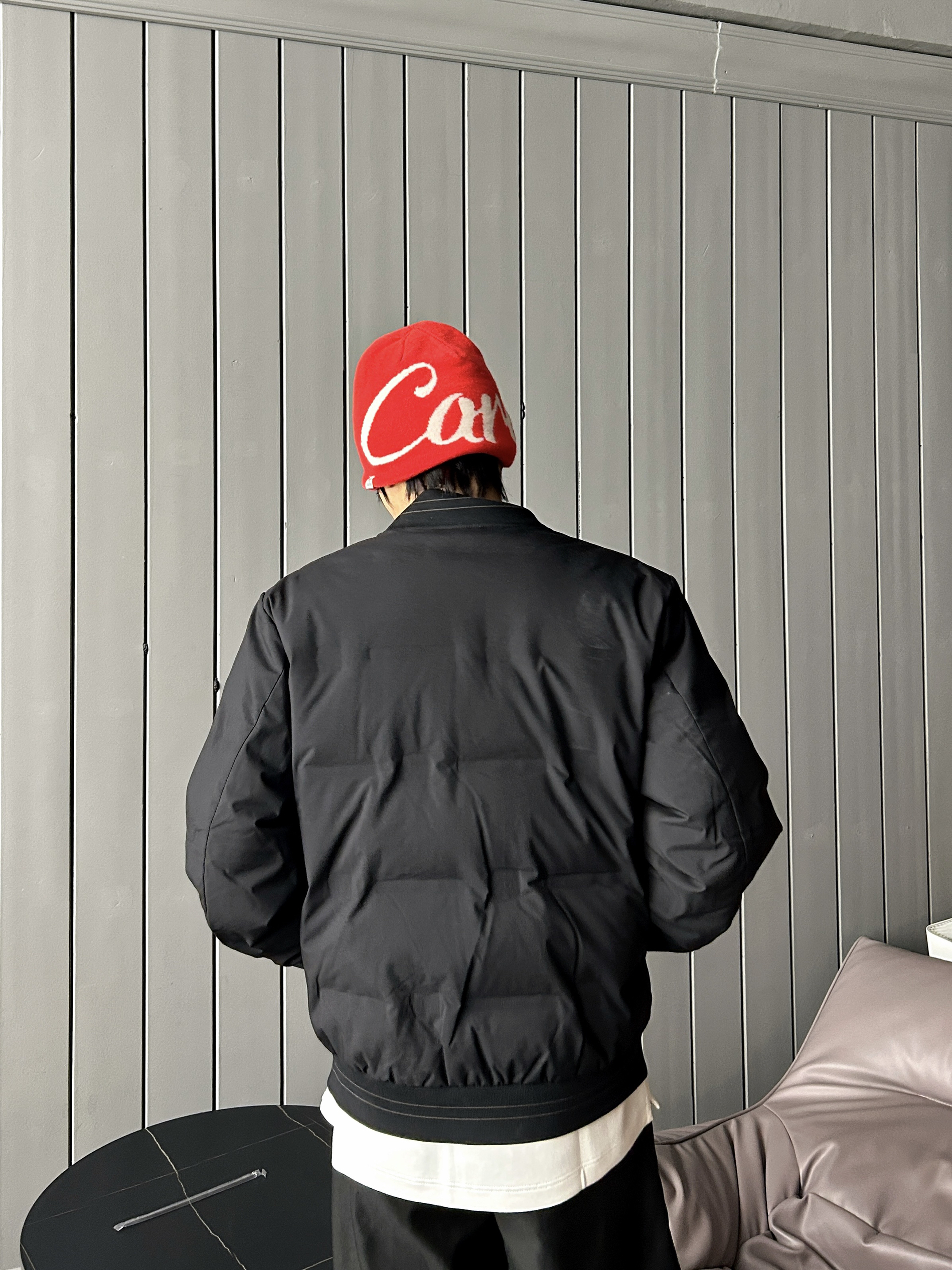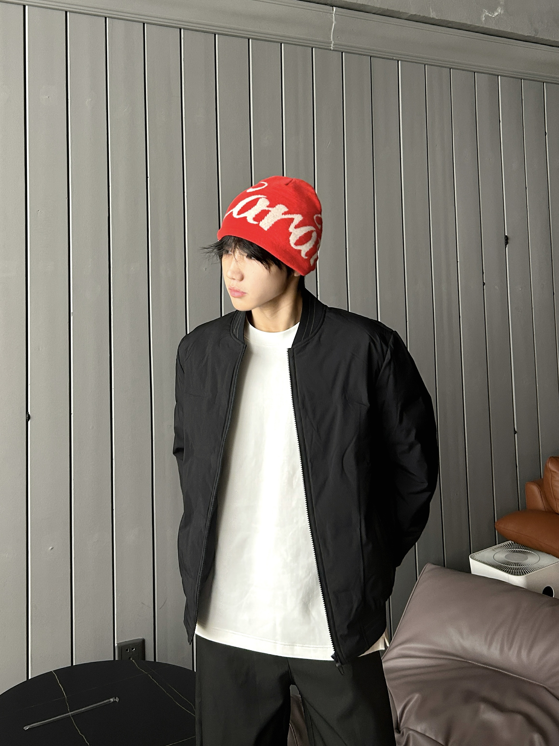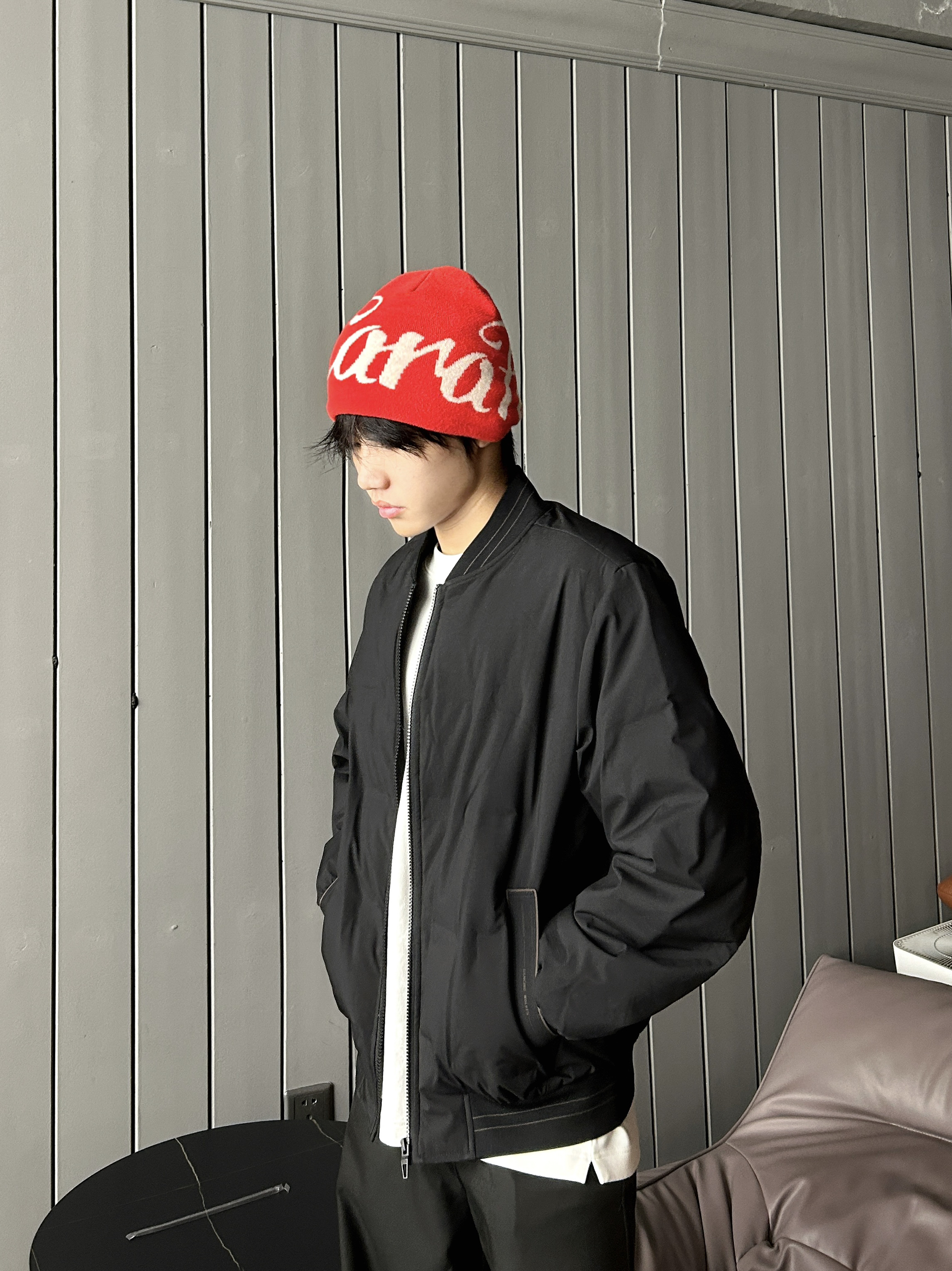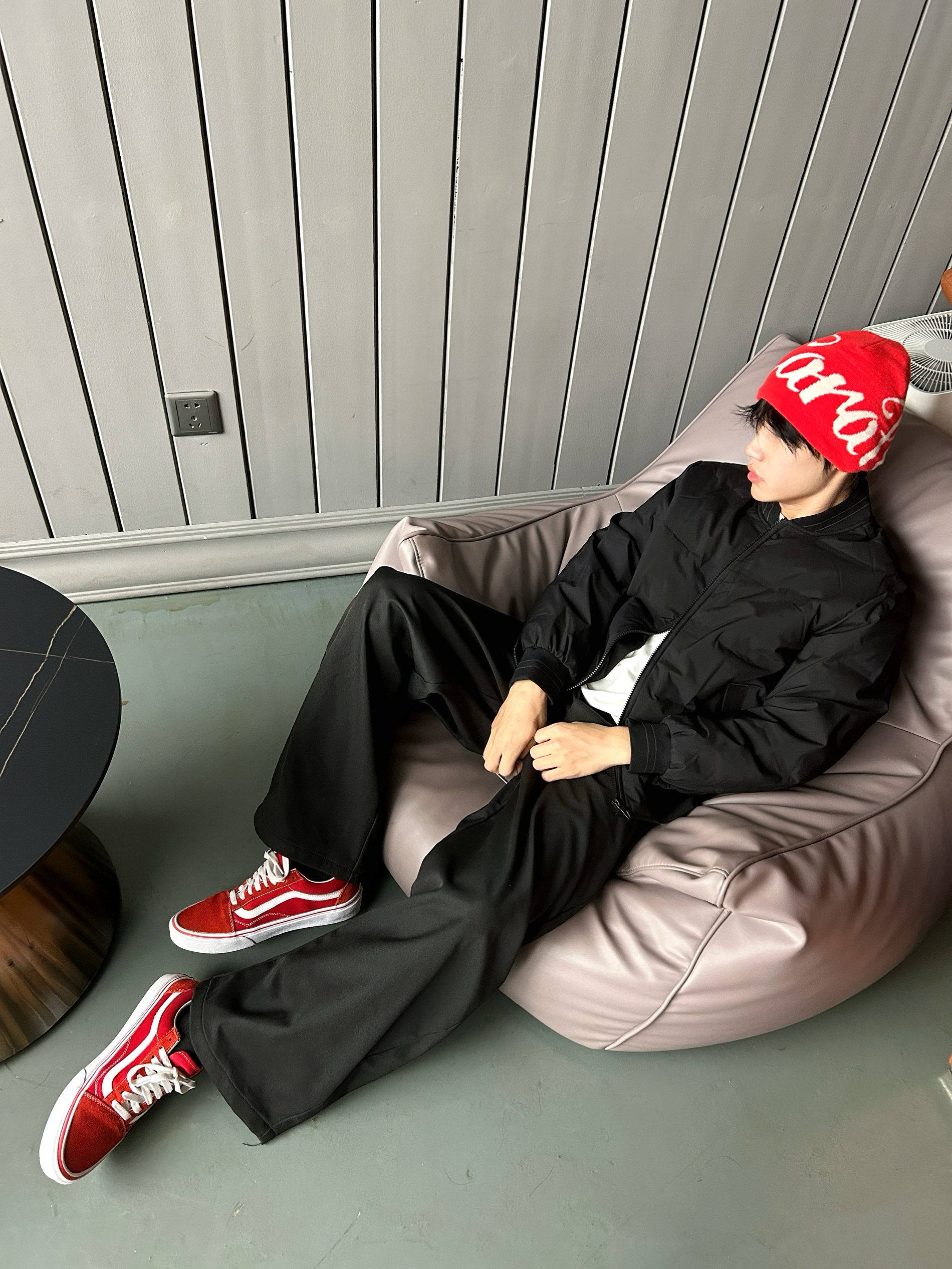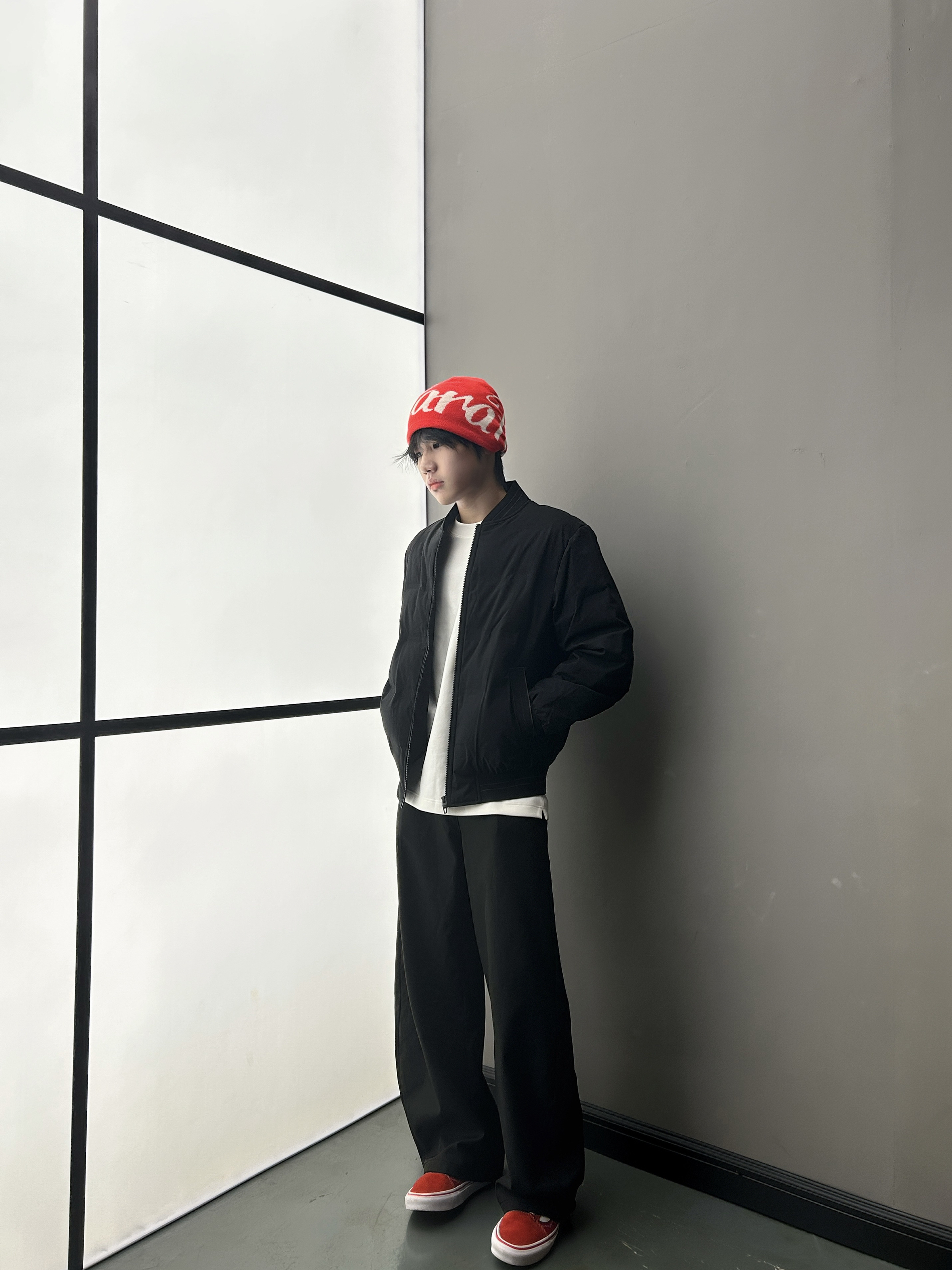 冷调空间里撞一抹艳红 黑系套装压得住松弛 红帽红鞋一搭就把张力拉满 高饱和亮色当锚点 全身同色系衬得利落又出挑 是不用费脑的吸睛公式🔚
