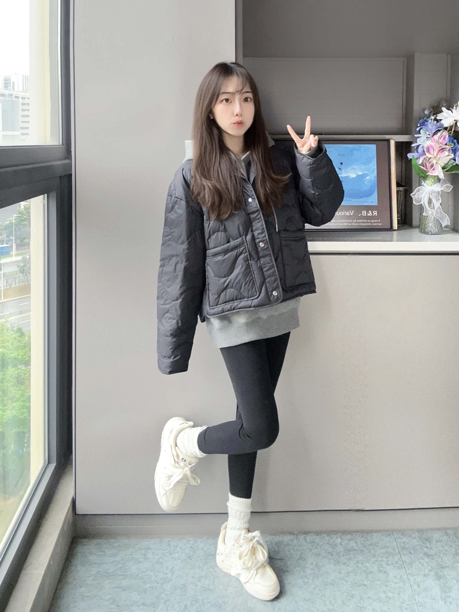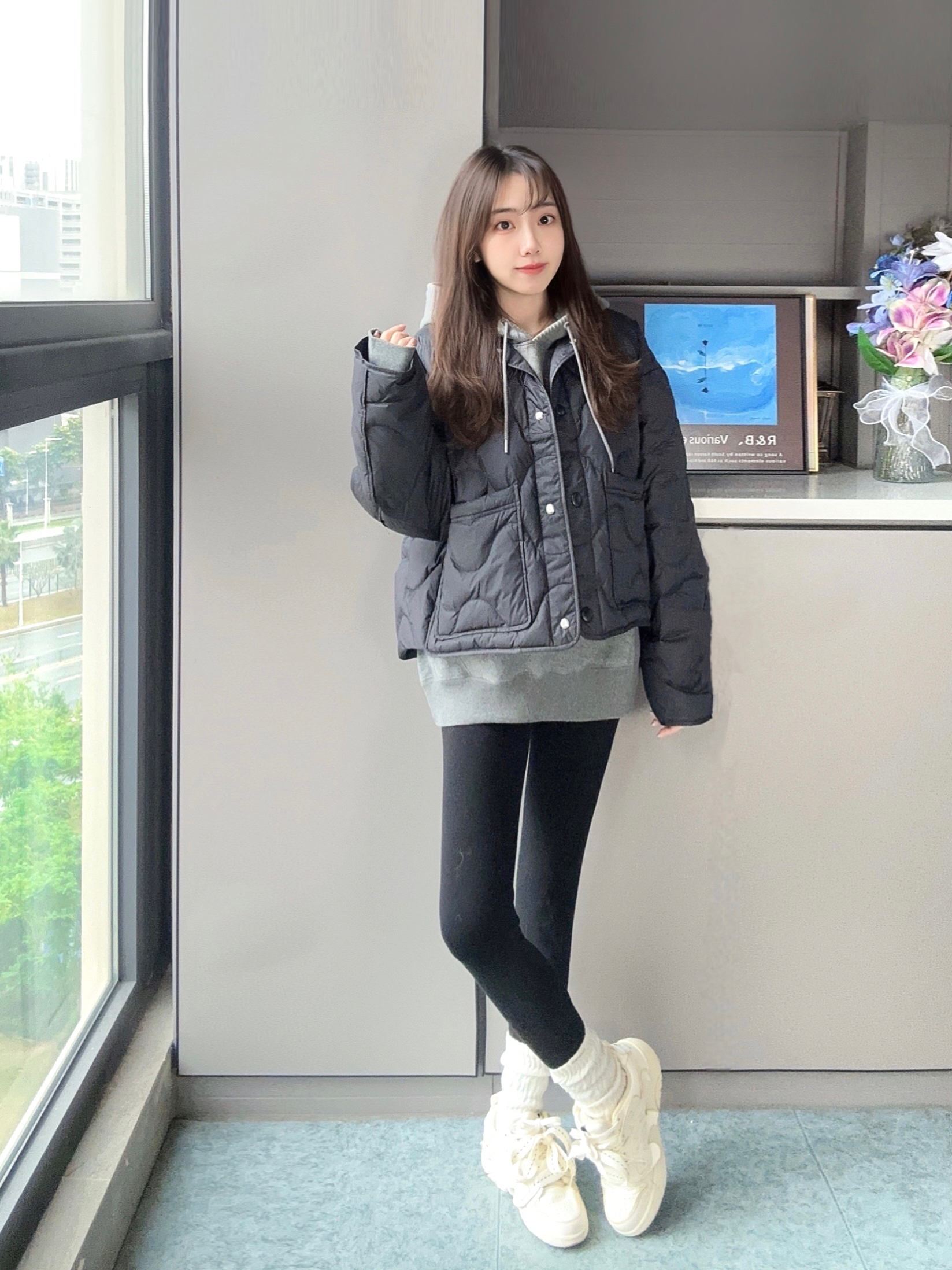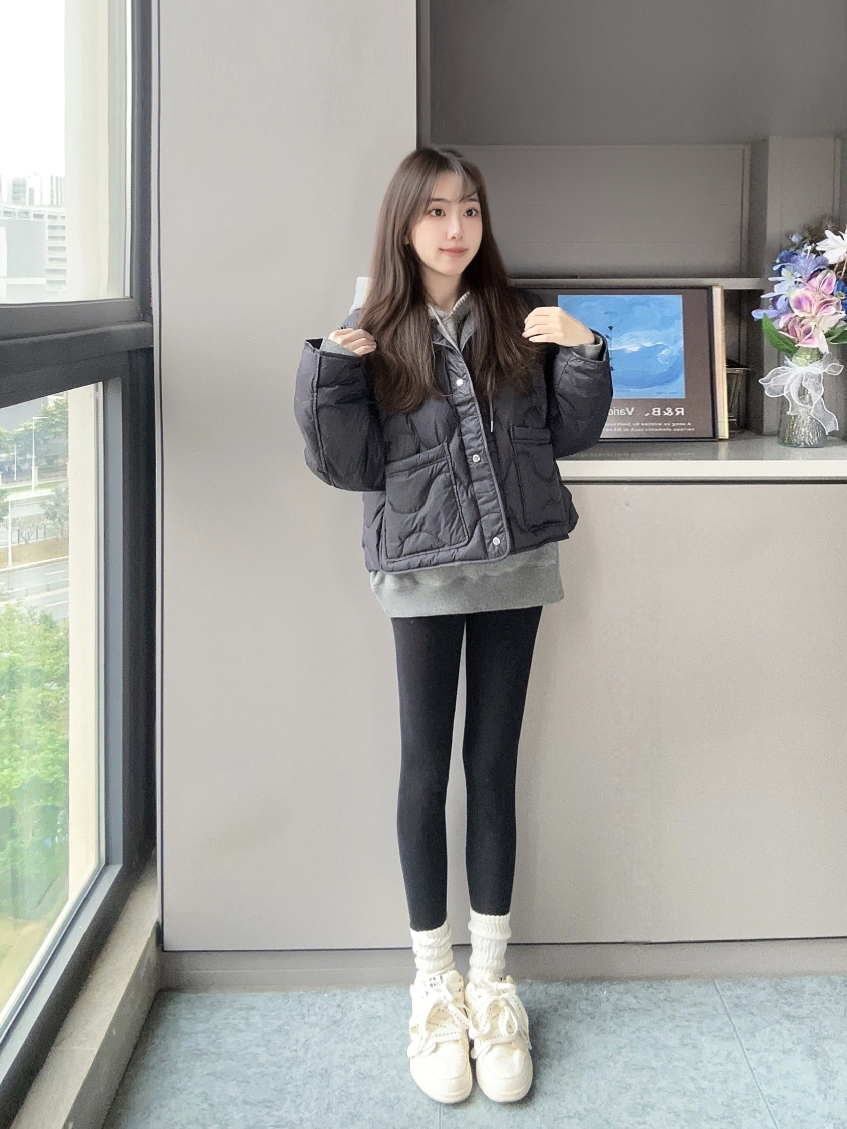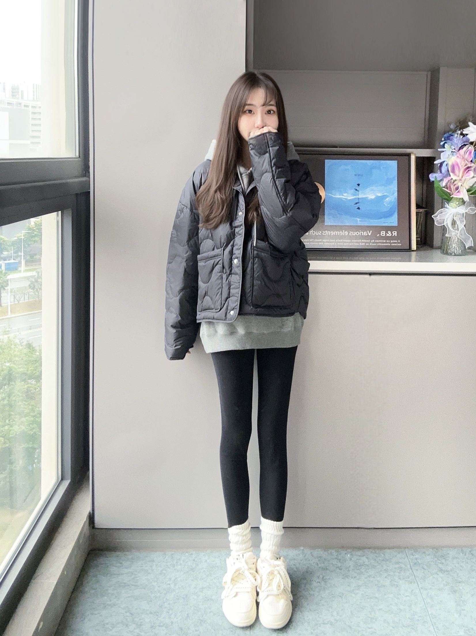 我的年度穿搭 冬天还得靠叠穿大法穿出氛围感❄️ 灰色卫衣叠加黑色羽绒服 搭配一条黑色鲨鱼裤和运动鞋👟 很元气感又不显臃肿的感觉~ 卫衣和羽绒服叠穿保暖又时尚 短款羽绒蛮显瘦的喔,不压身高