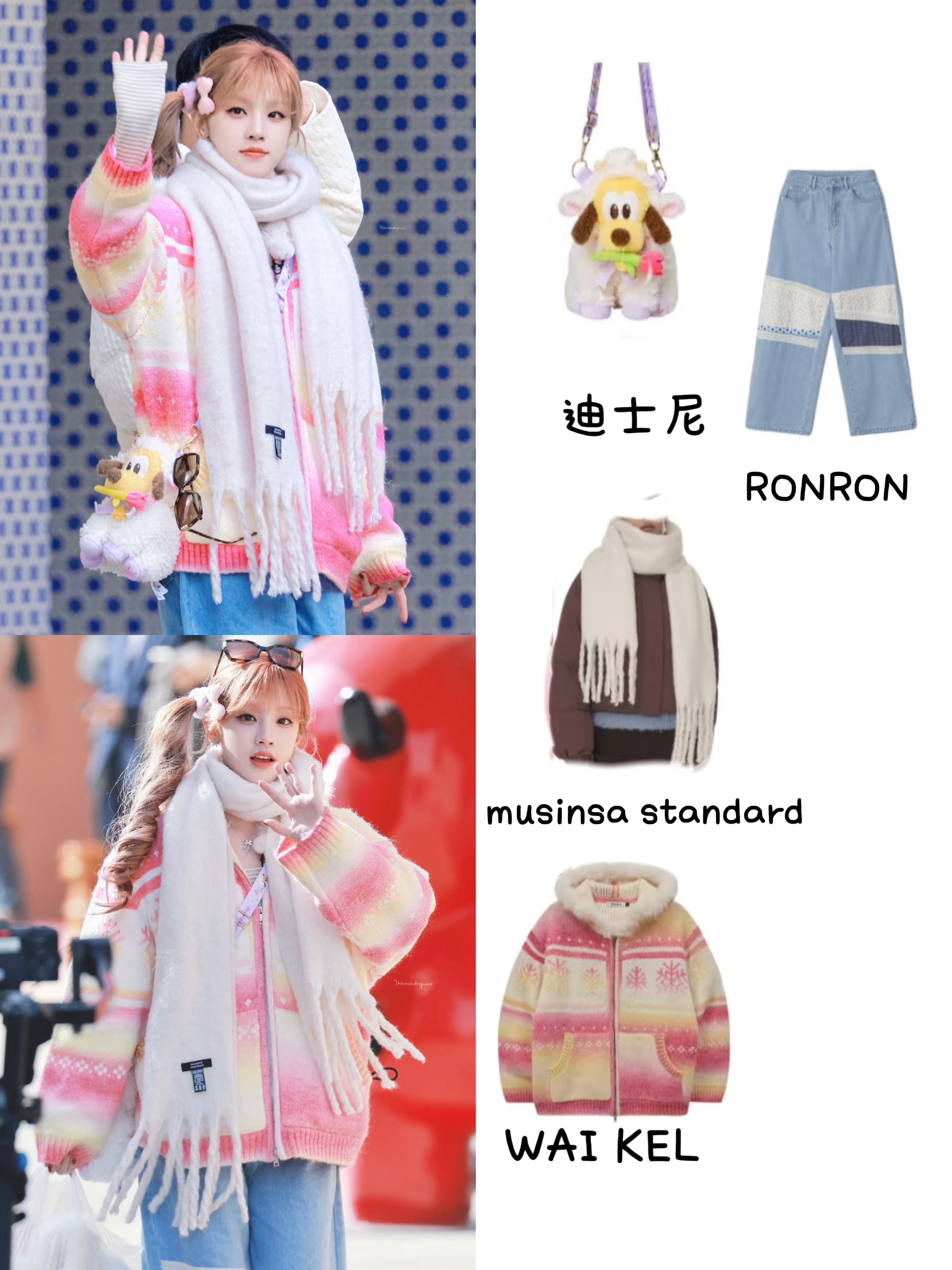 宋雨琦:冬日甜妹穿搭 ▫️外套:WAI KEL的渐变粉白针织开衫,雪花图案+毛绒领直接把冬日氛围拉满,软fufu的质感看着就好暖和~ ▫️围巾:musinsa standard的长款流苏围巾,奶白配色和任何衣服都能搭,流苏设计还能增加氛围感! ▫️裤子:RONRON的拼接牛仔裤,浅蓝底色+撞色补丁,休闲又不失设计感,和甜系上衣中和得刚刚好~ ▫️包包:迪士尼的小狗挂包!毛绒质感+可爱造型,直接把甜...