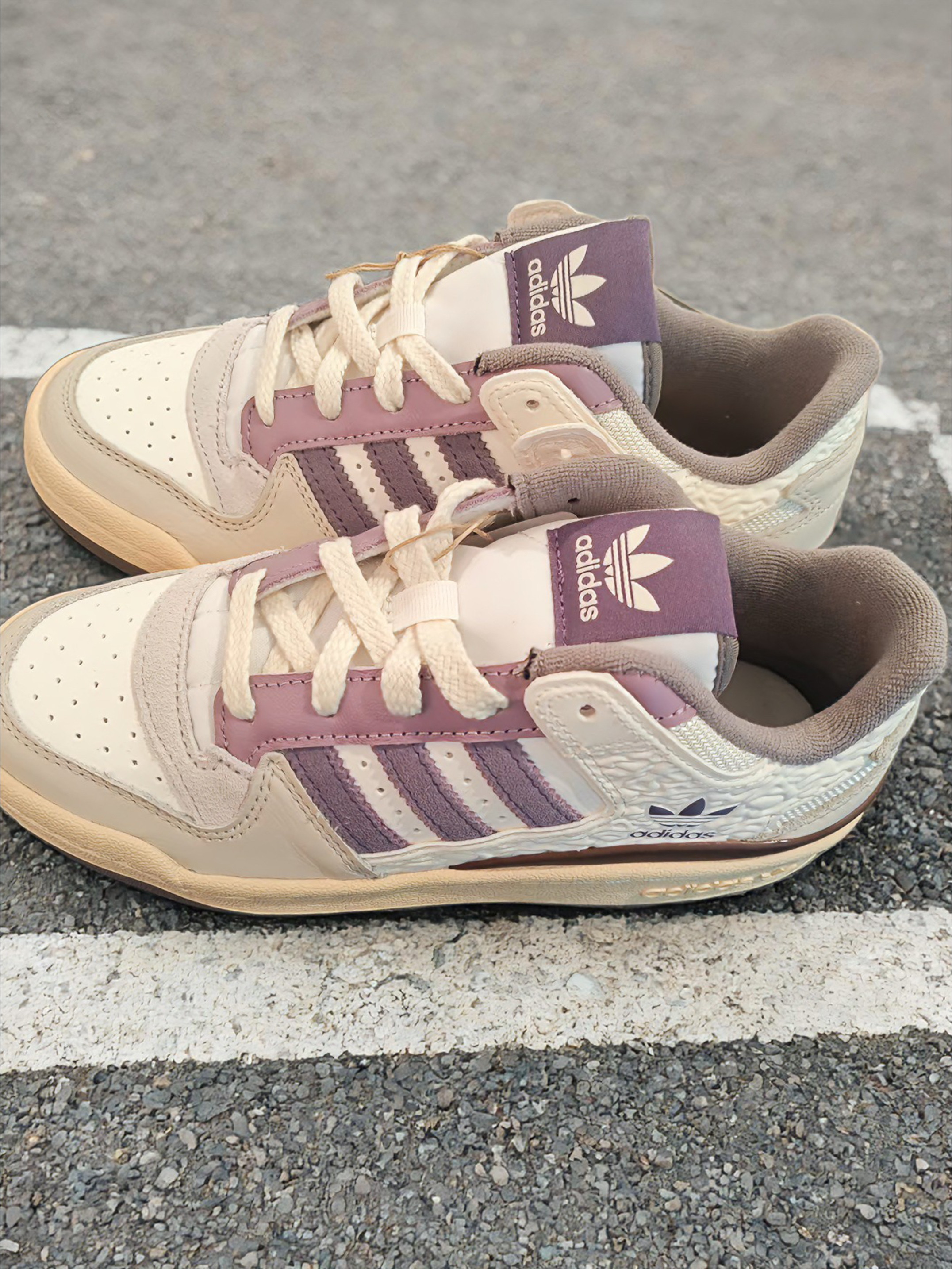 逛线下店时,一眼就被这双 Forum 的配色吸引——淡紫、米白与暖棕交织在一起,像把春天清晨的柔雾揉进了鞋面,低饱和的色调,看起来安静又舒服。 鞋身用了皮质和翻毛皮拼接,细节也做得细腻,纹理和三叶草标志悄悄带出几分复古气息。日常搭配起来没什么负担:配浅色牛仔裤干净清爽,搭奶杏色卫衣卫裤整个人都柔和起来,或者穿一条小碎花裙,也能衬出一点甜而不腻的复古感。 试穿时,鞋底不是那种特别软的脚感,但走起...