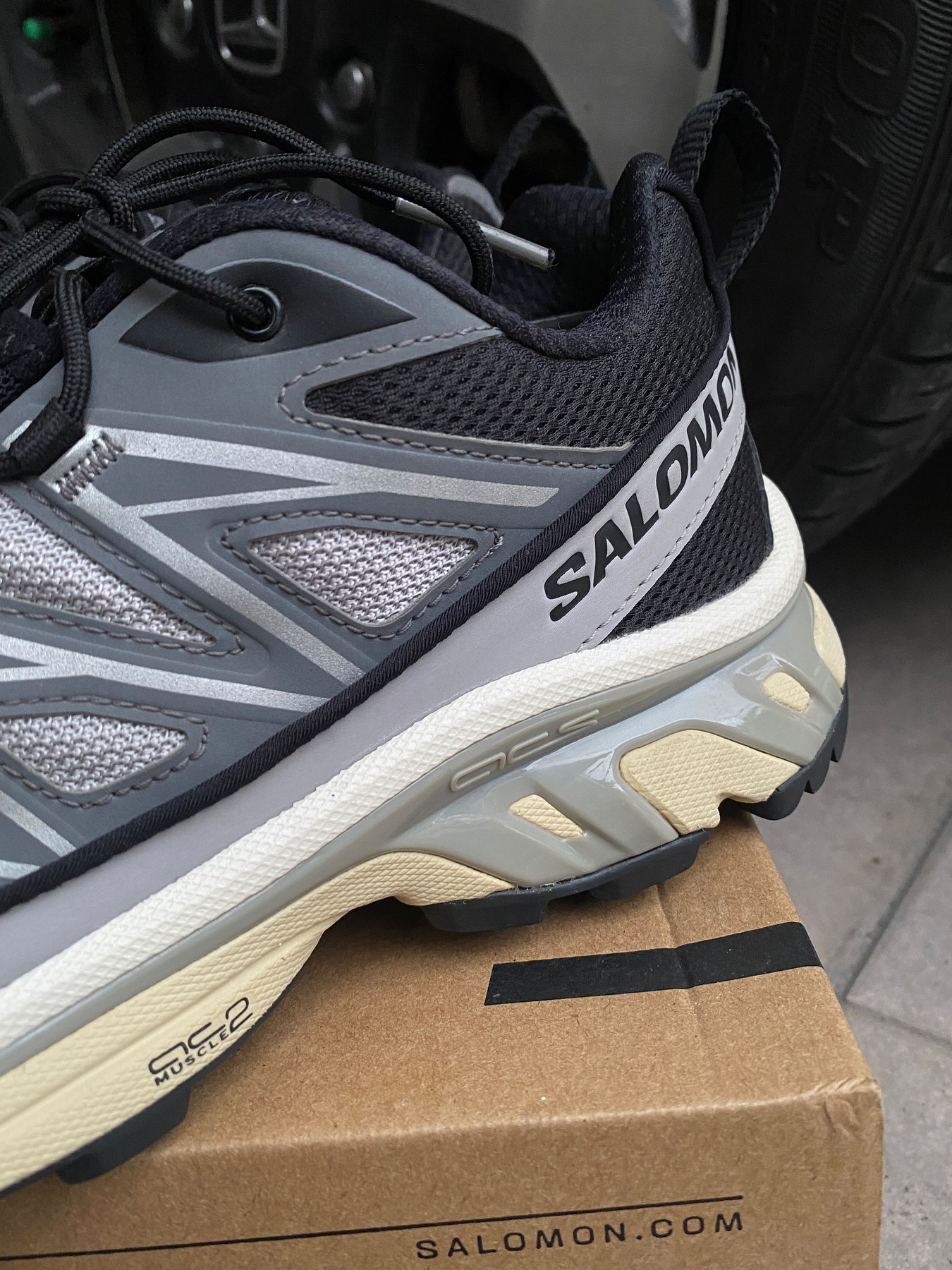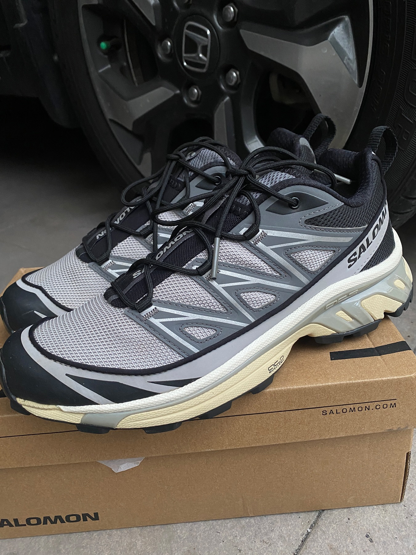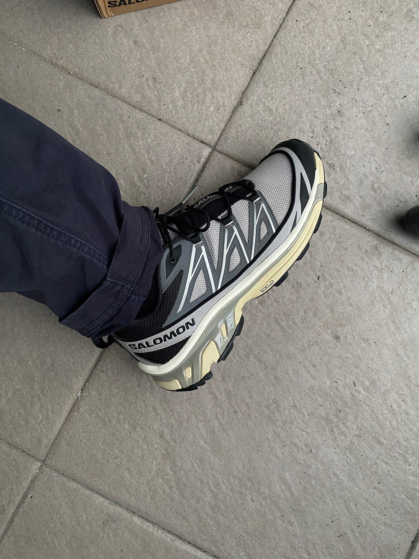 这双Salomon XT-6我穿了大半年 说它是‘万能鞋’真不夸张 第一次穿觉得鞋底硬得像板砖 但跑山路反而稳得住 脚踝不晃悠 后来才知道是它底盘那个什么ACS系统在发力 鞋带一拉就紧 不用弯腰系 遛狗赶地铁特省事 就是鞋头有点窄 宽脚兄弟得买大一码 夏天穿有点闷 秋冬配卫衣牛仔裤 机能风直接拉满 还被路人问过链接 要说缺点 溢价确实高 但穿了半年连鞋带都没松过——这鞋可以