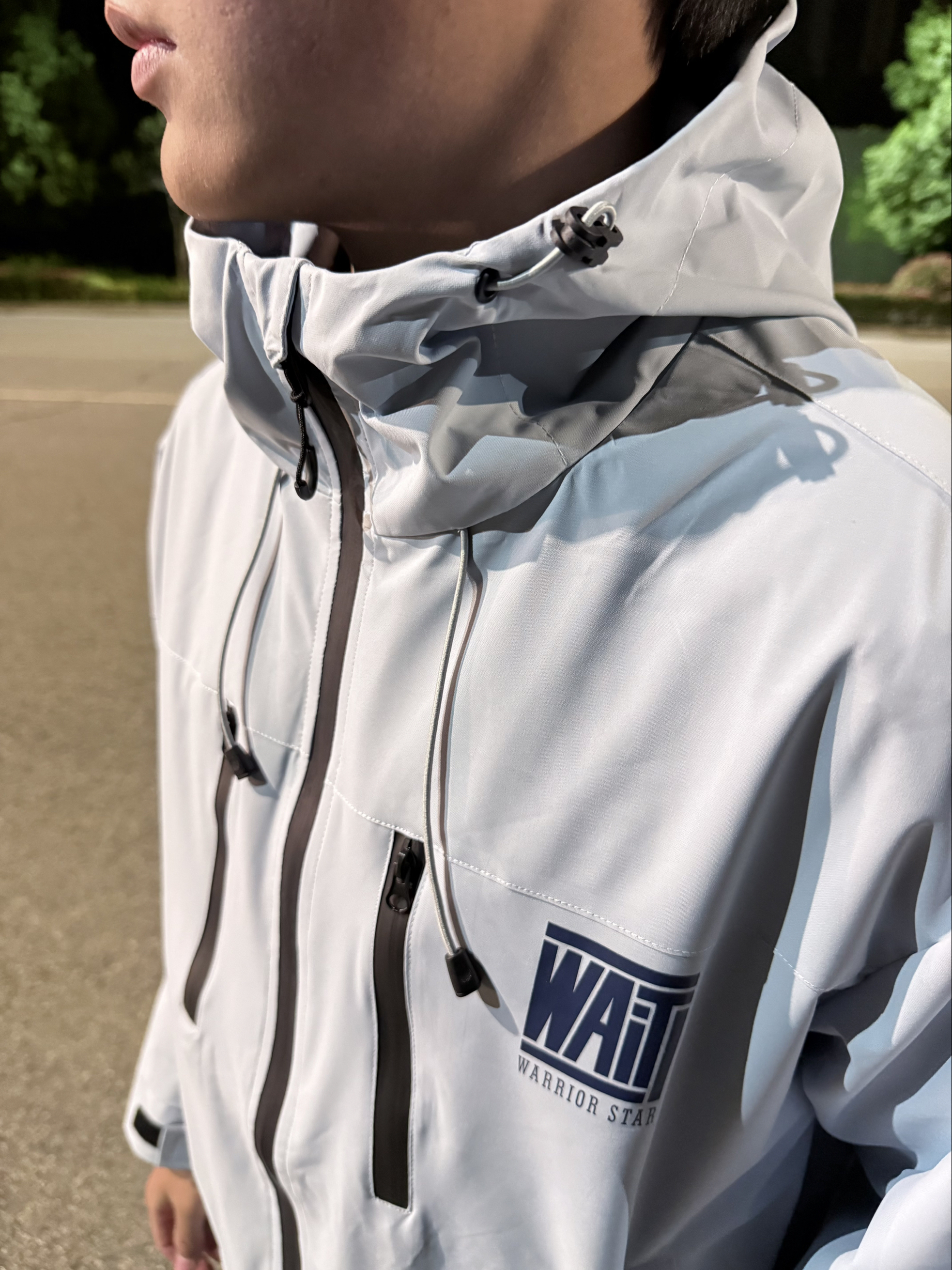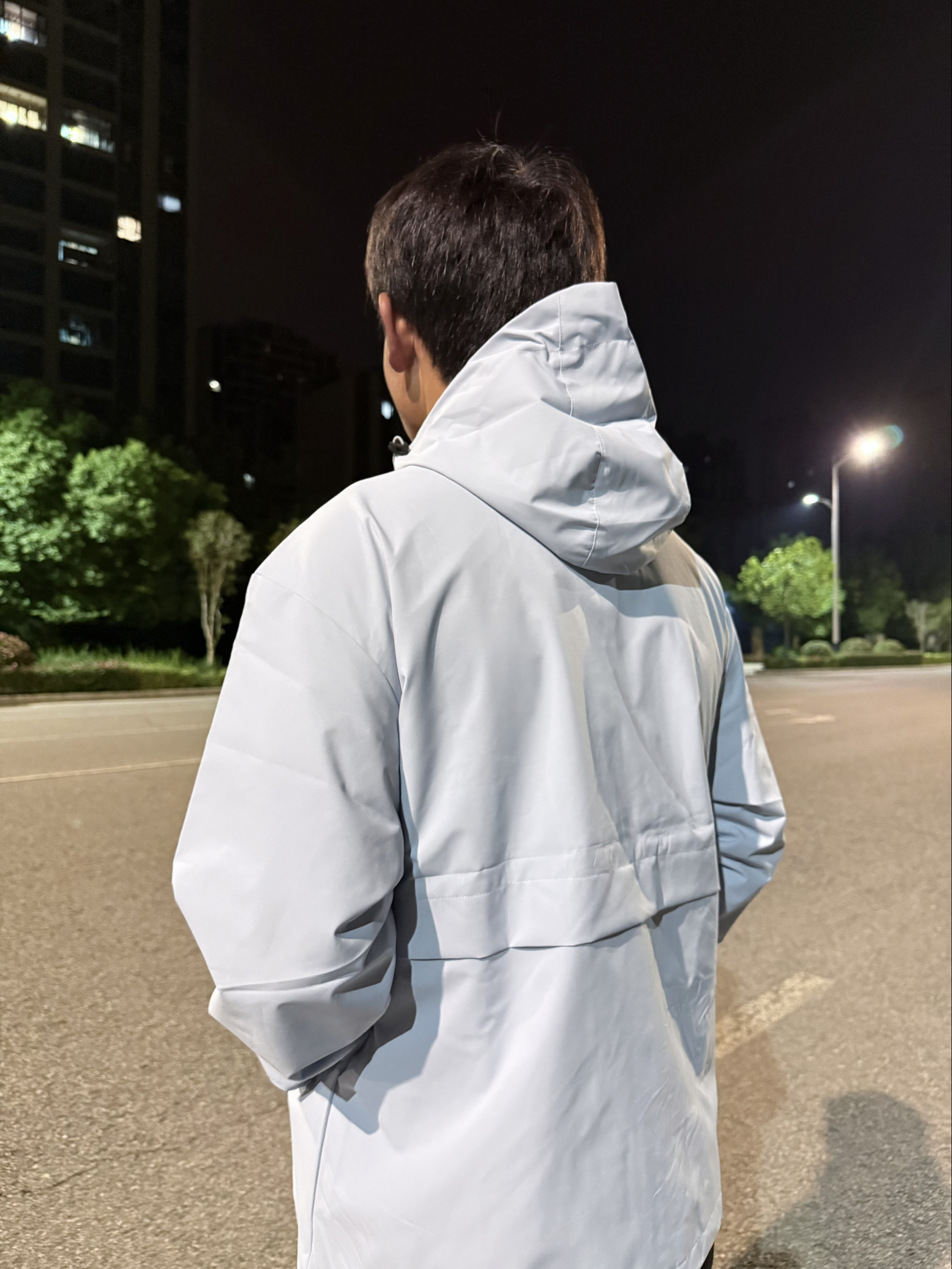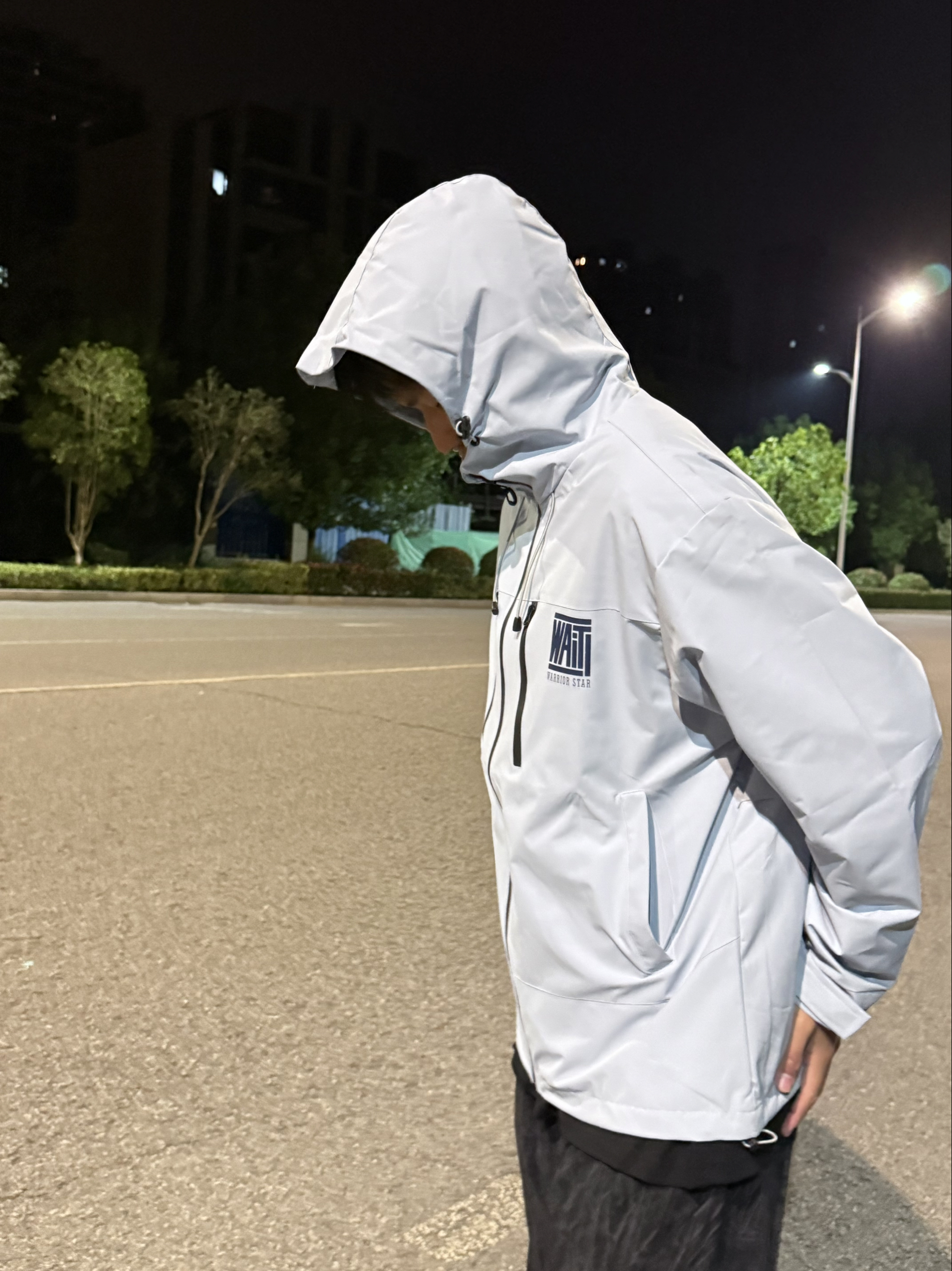 冲锋衣主打户外运动,轻薄透气面料+防风防水 适合徒步、滑雪等场景 白色主色配浅灰拼接,简约又有运动感 胸前字样超有辨识度 连帽设计+可调节抽绳,适应多种天气 穿上它爬山徒步既轻便又能挡雨 真的很爱这种功能性与颜值并存的设计 袖口和下摆弹性收口,穿着舒适又实用 日常通勤或户外活动都很适合,搭配冲锋裤更显整体感