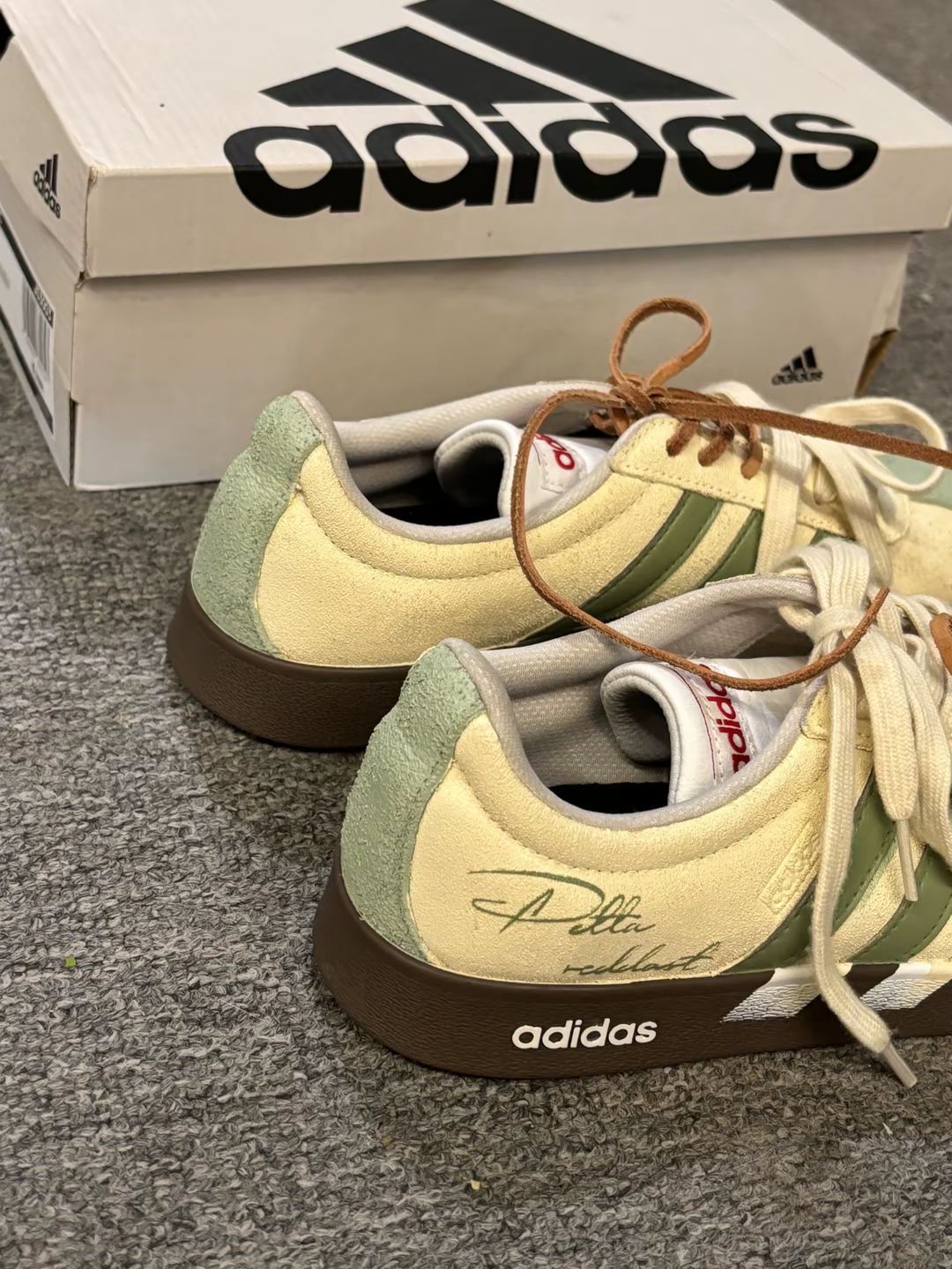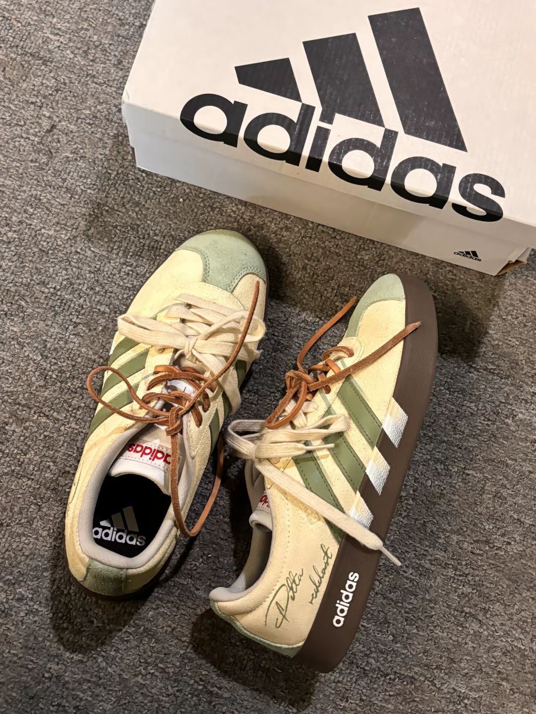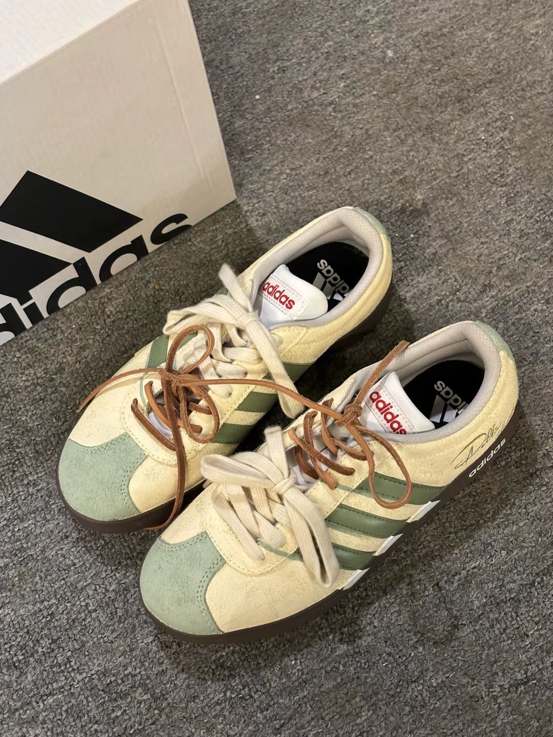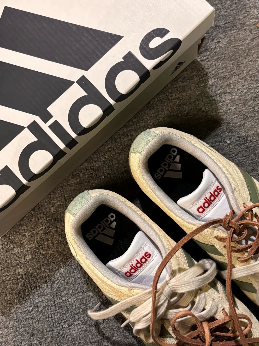 新收的阿迪鞋,米绿配色软乎乎的,麂皮摸着手感挺好。今天搭了条浅棕工装裤,鞋型不挑腿型,脚感轻还不闷脚,出门随便穿都顺色,这一身日常又舒服~😌
