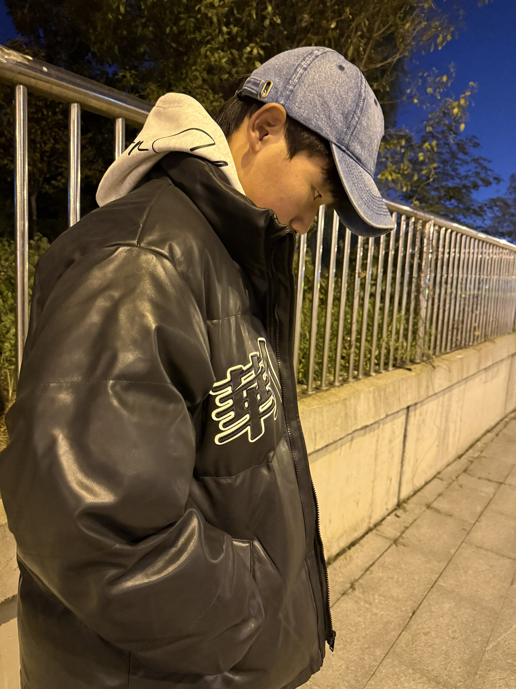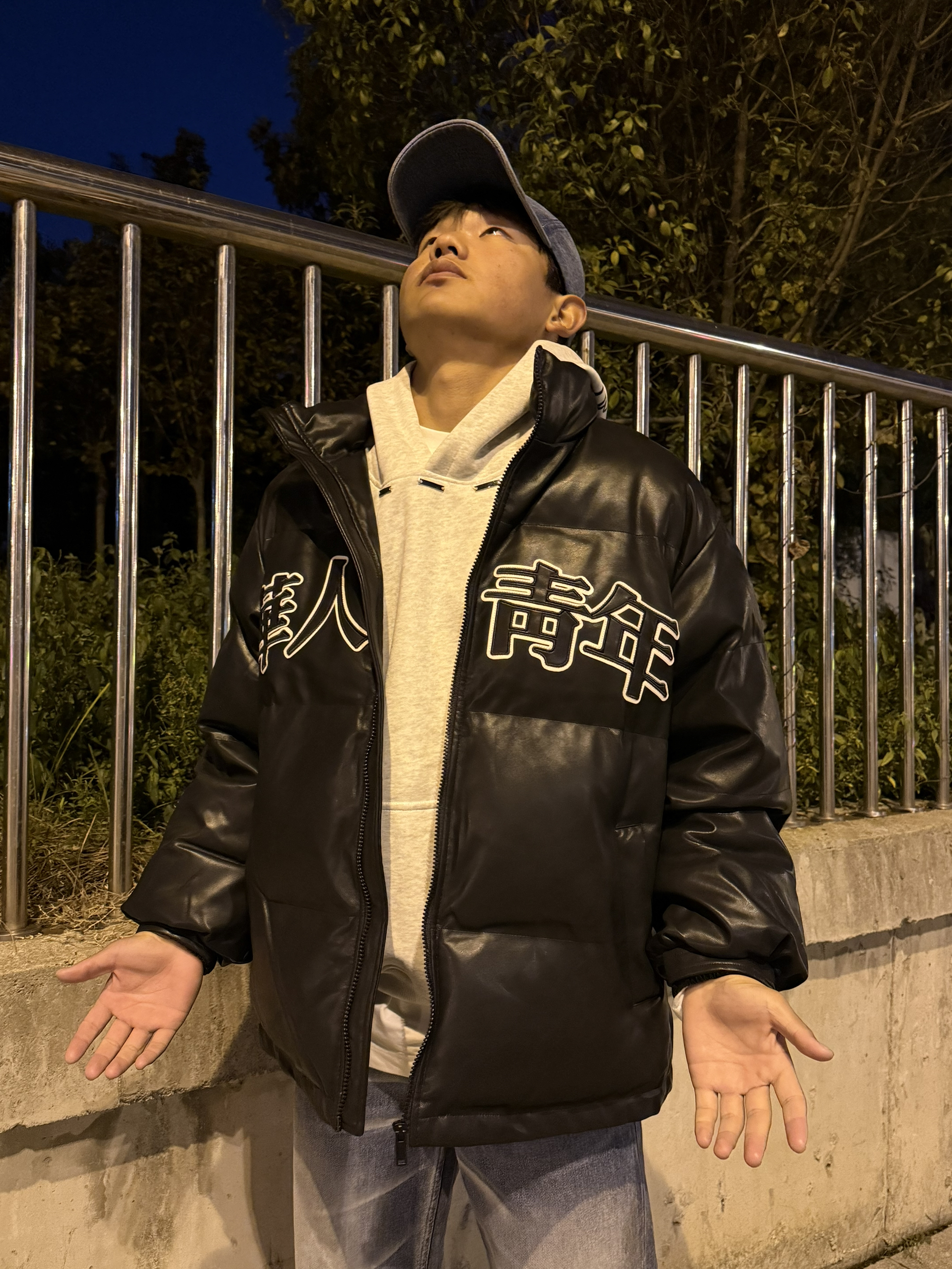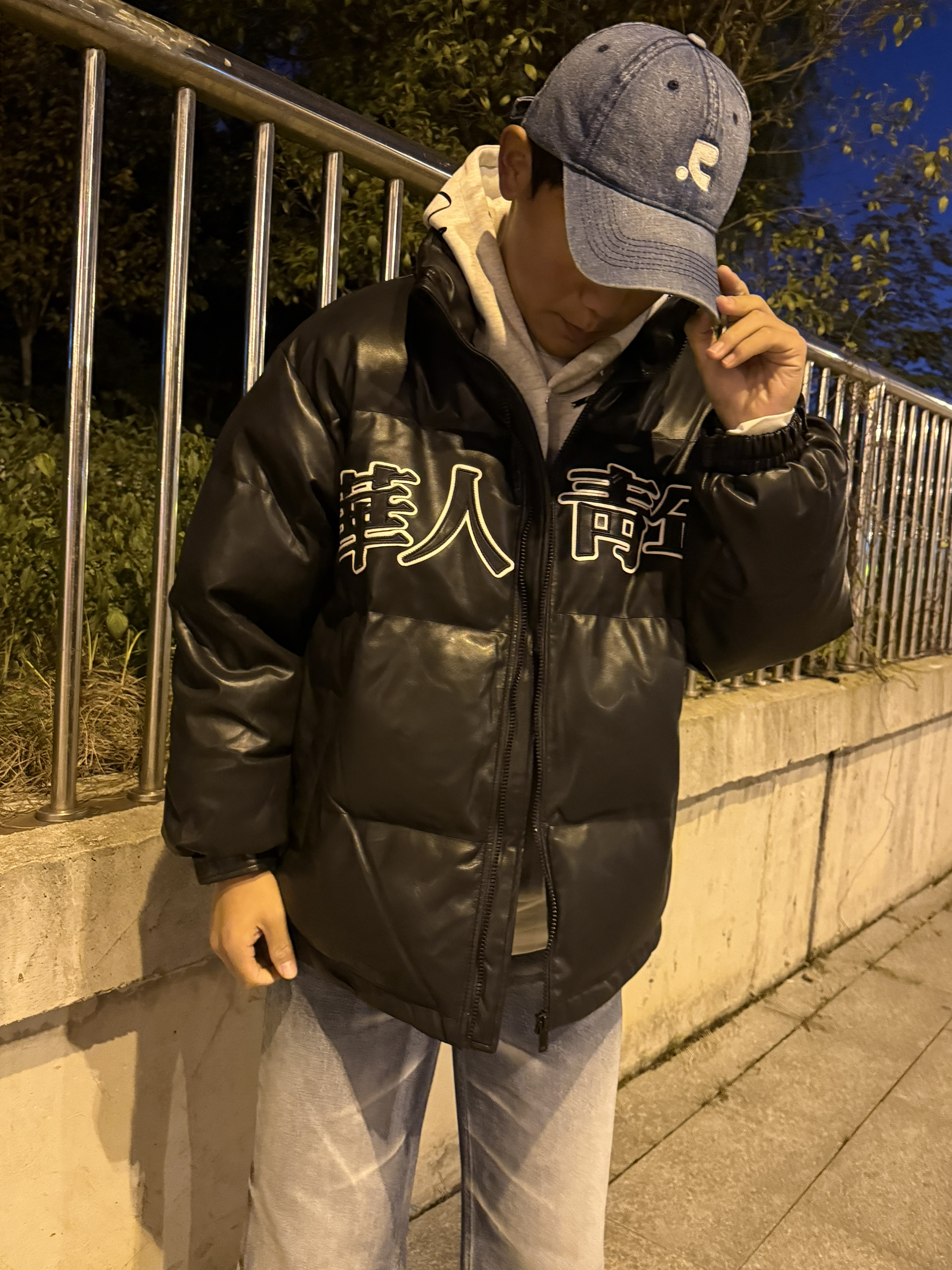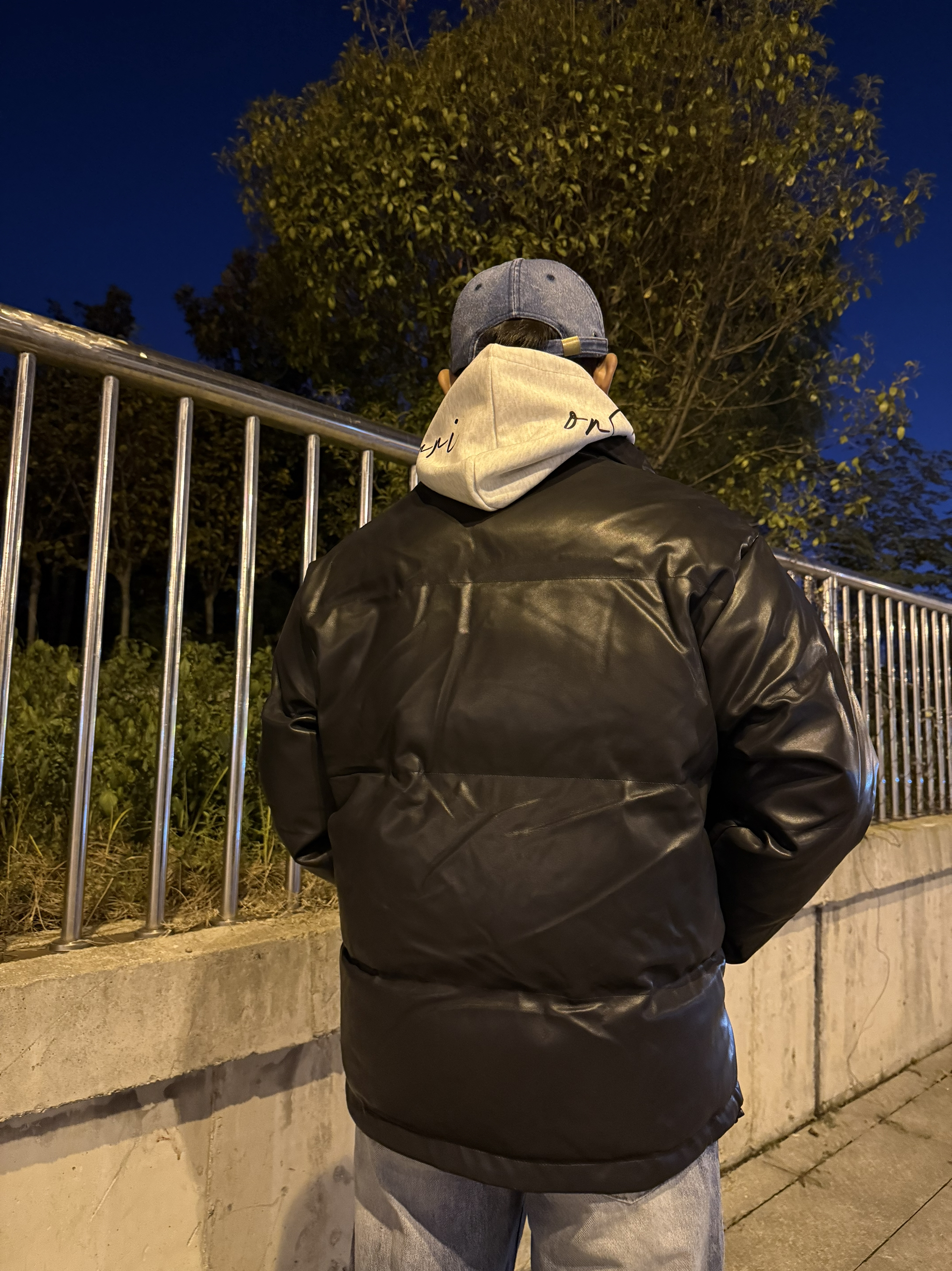 冬天真的不能没有pu服 已经开始期待冬天了 华人青年 PU棉服一件过冬 超厚实 外面的pu皮真的超级防风💨, 而且硬挺有型,显的版型真的很好看很显瘦 黑色pu皮显白百搭还不怕脏,简直就是懒人福音! 叠穿搭配卫衣也不错 下面再搭配一条牛仔裤,活力满满 男生女生都可以穿,也可以用来当情侣装